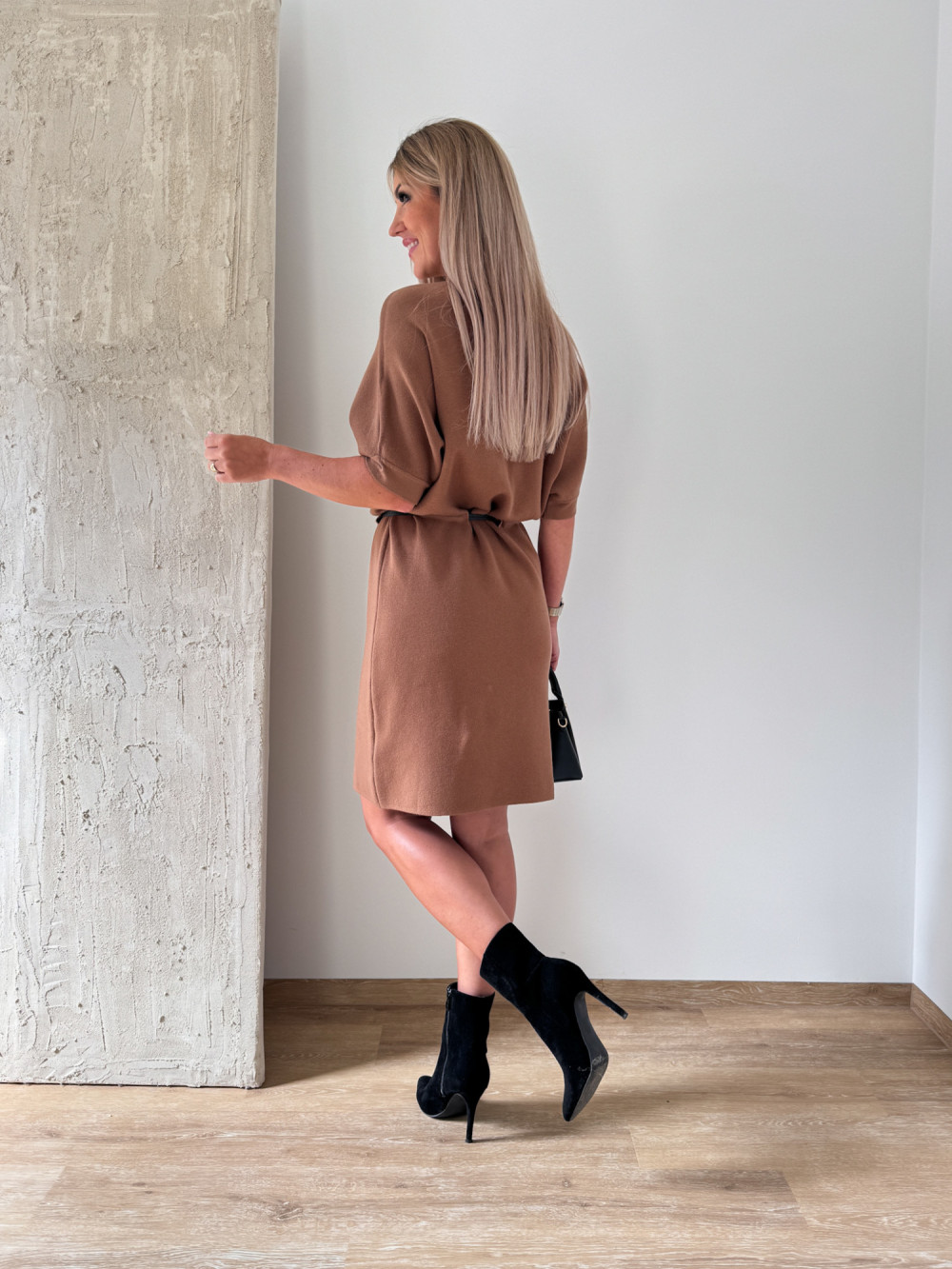 Sukienka Dzianinowa z Czarnym Paskiem Irma - Cynamonowa