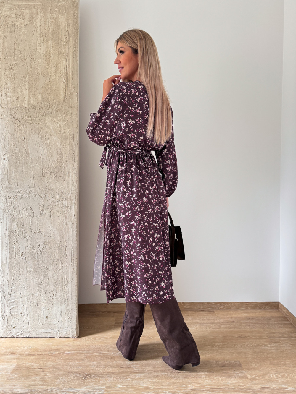 Sukienka Midi z Długim Rękawem Milena - Czekoladowa w Małe Kwiatuszki Fuksja