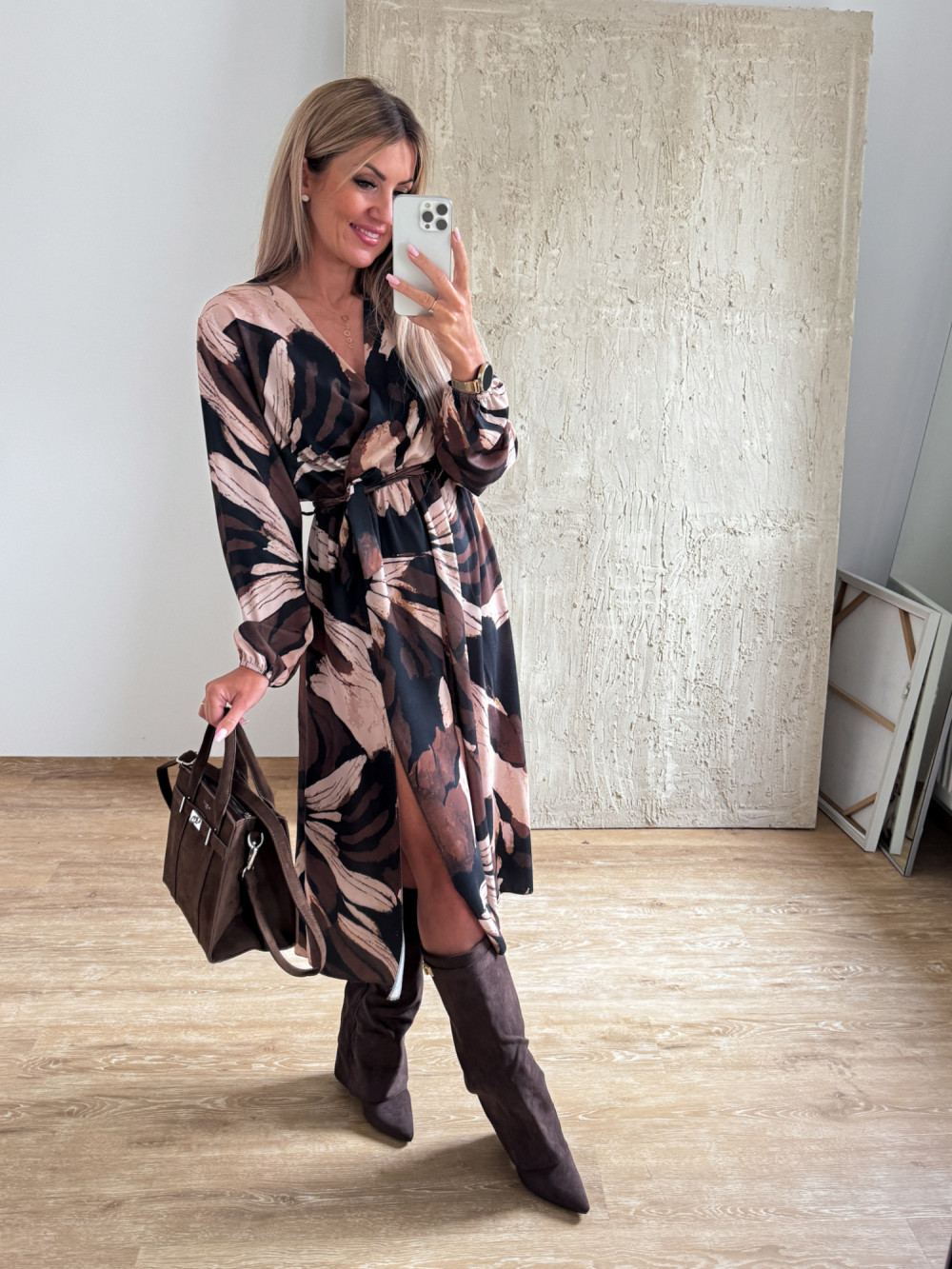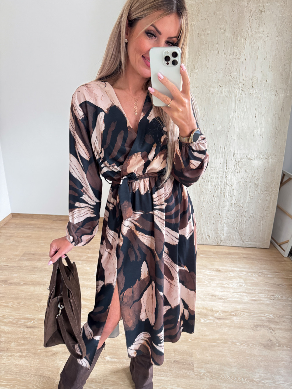 Sukienka Midi z Długim Rękawem Milena - Maziajki Beż/Czekolada/Czarny