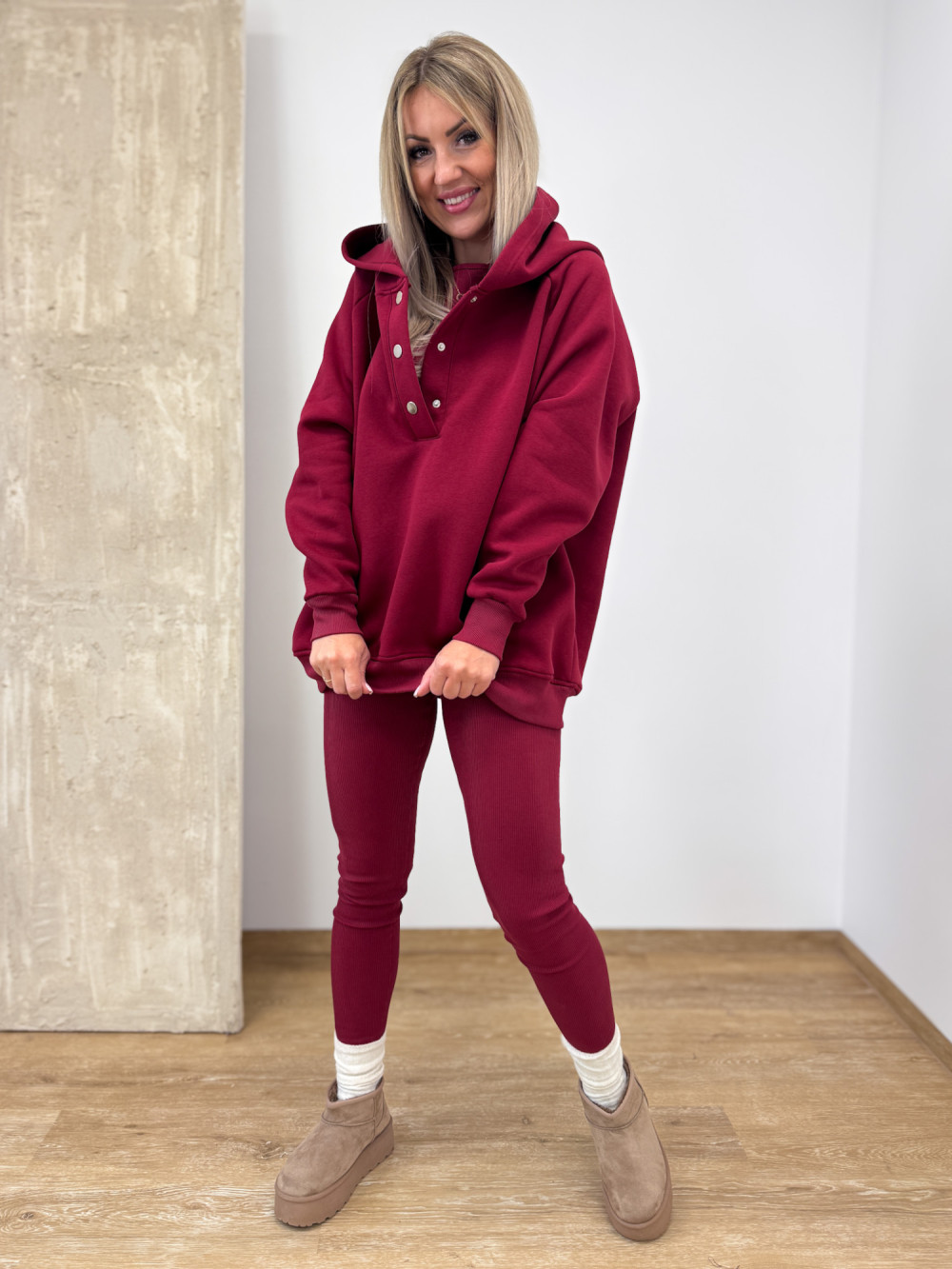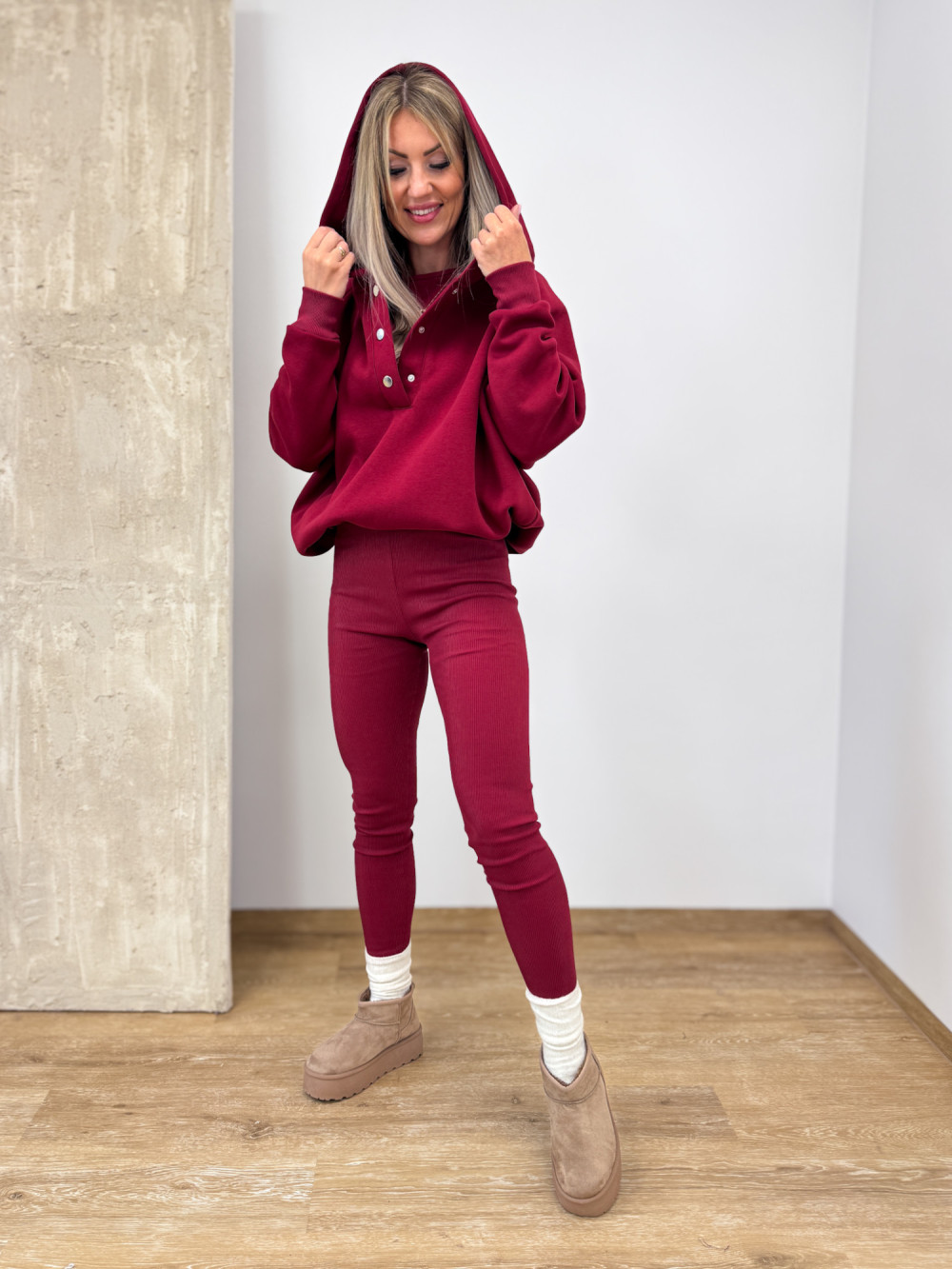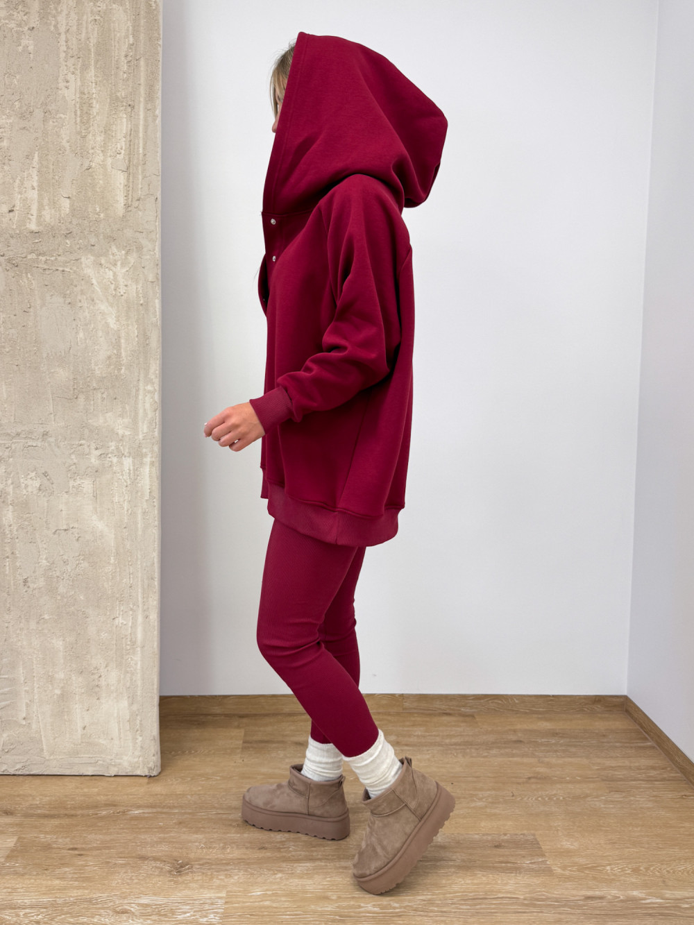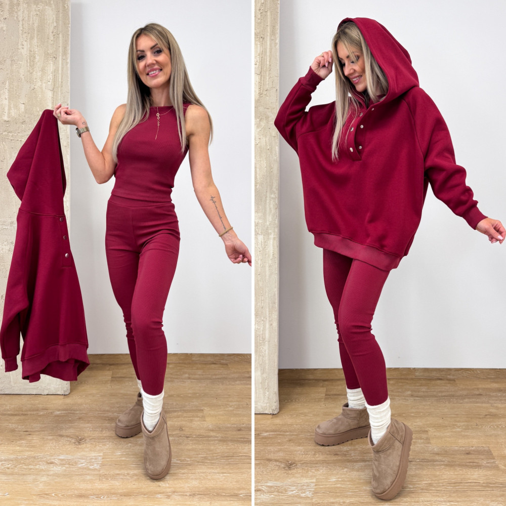 Stylowy i niezwykle komfortowy komplet trzyczęściowy, w skład którego wchodzą: prążkowane legginsy z wysokim stanem na gumce, krótszy top oraz przedłużana bluza o oversizowym kroju z ciepłym, „misiowym” wnętrzem. Bluza zapinana jest z przodu na napy i wyposażona w obfity kaptur, który dodaje całości przytulnego charakteru.