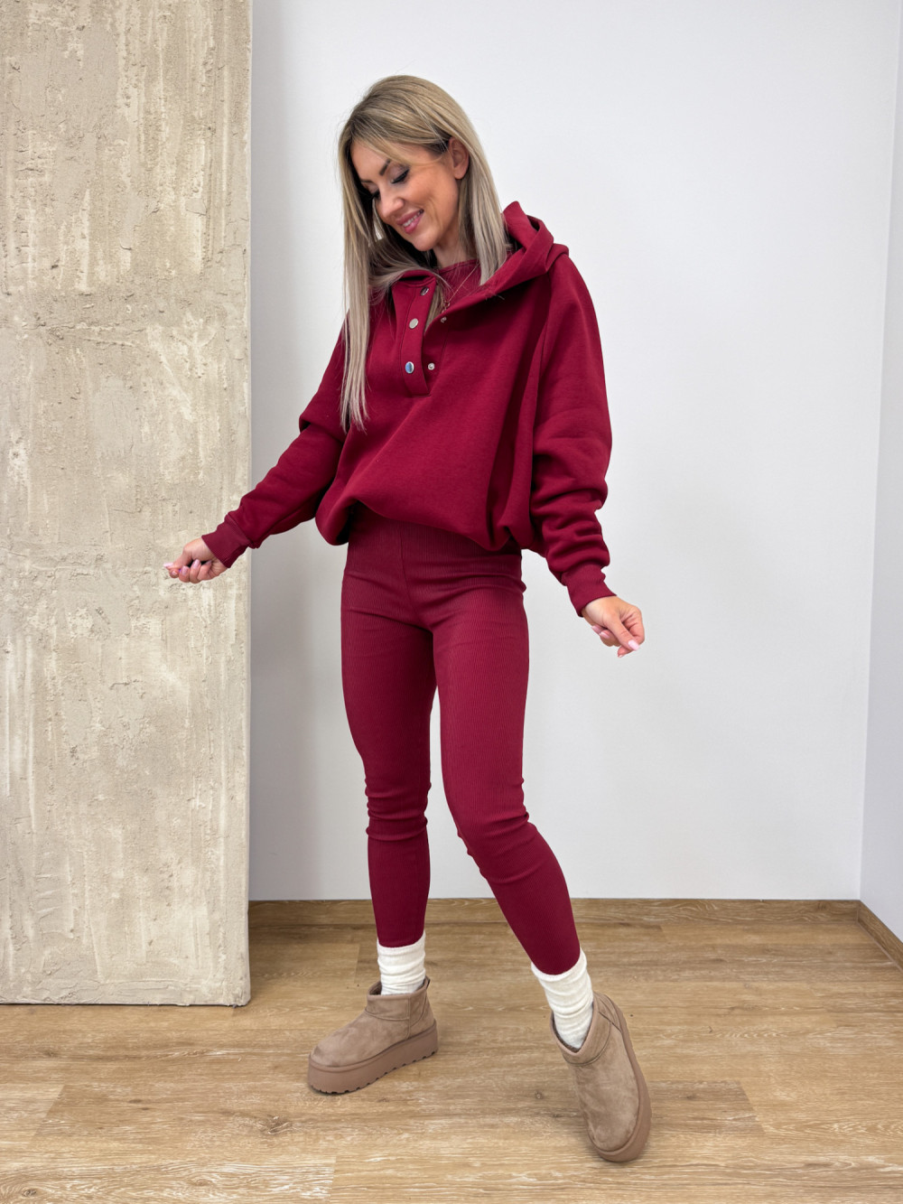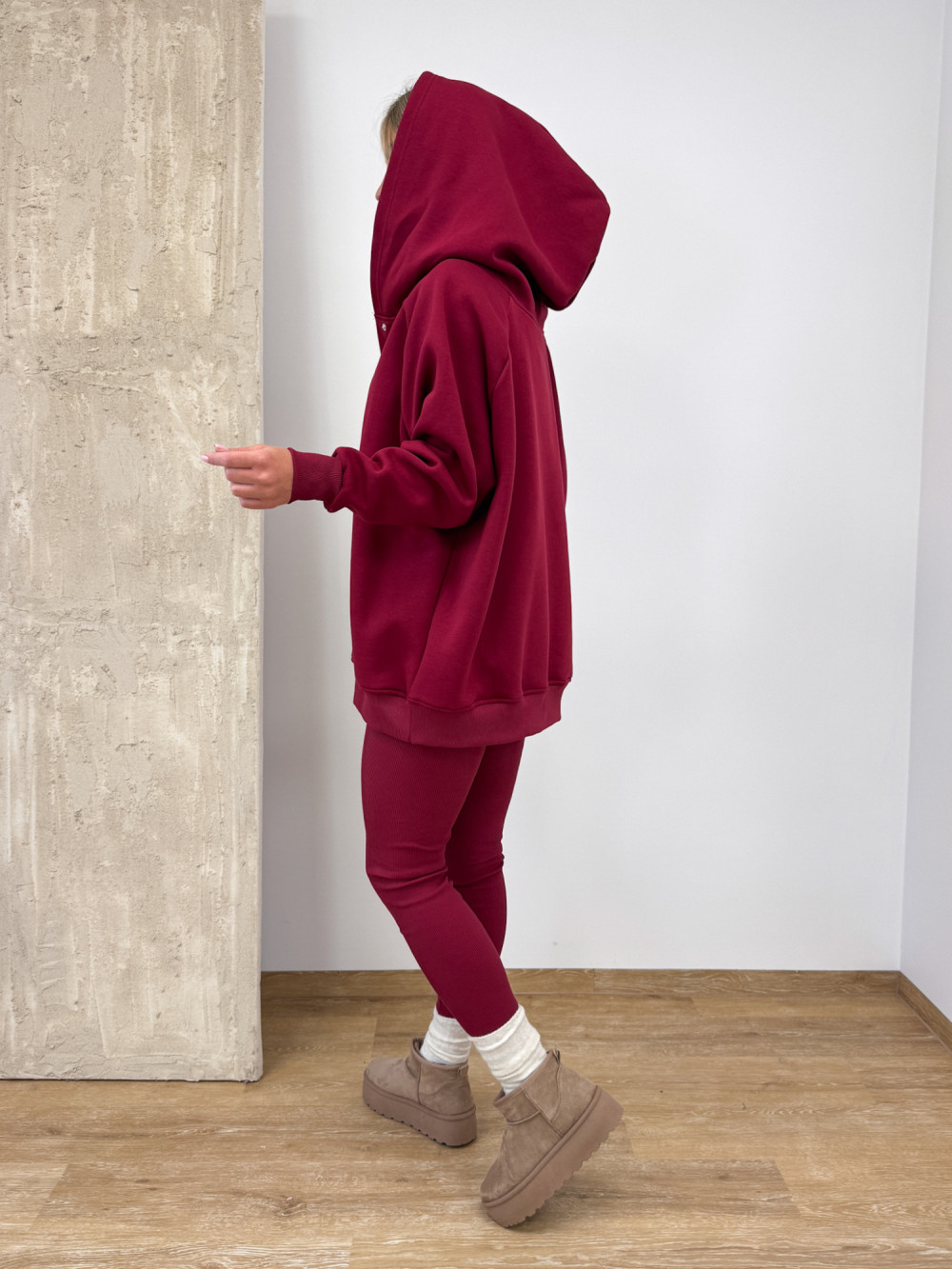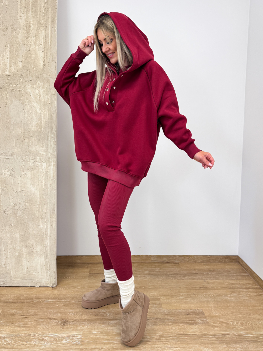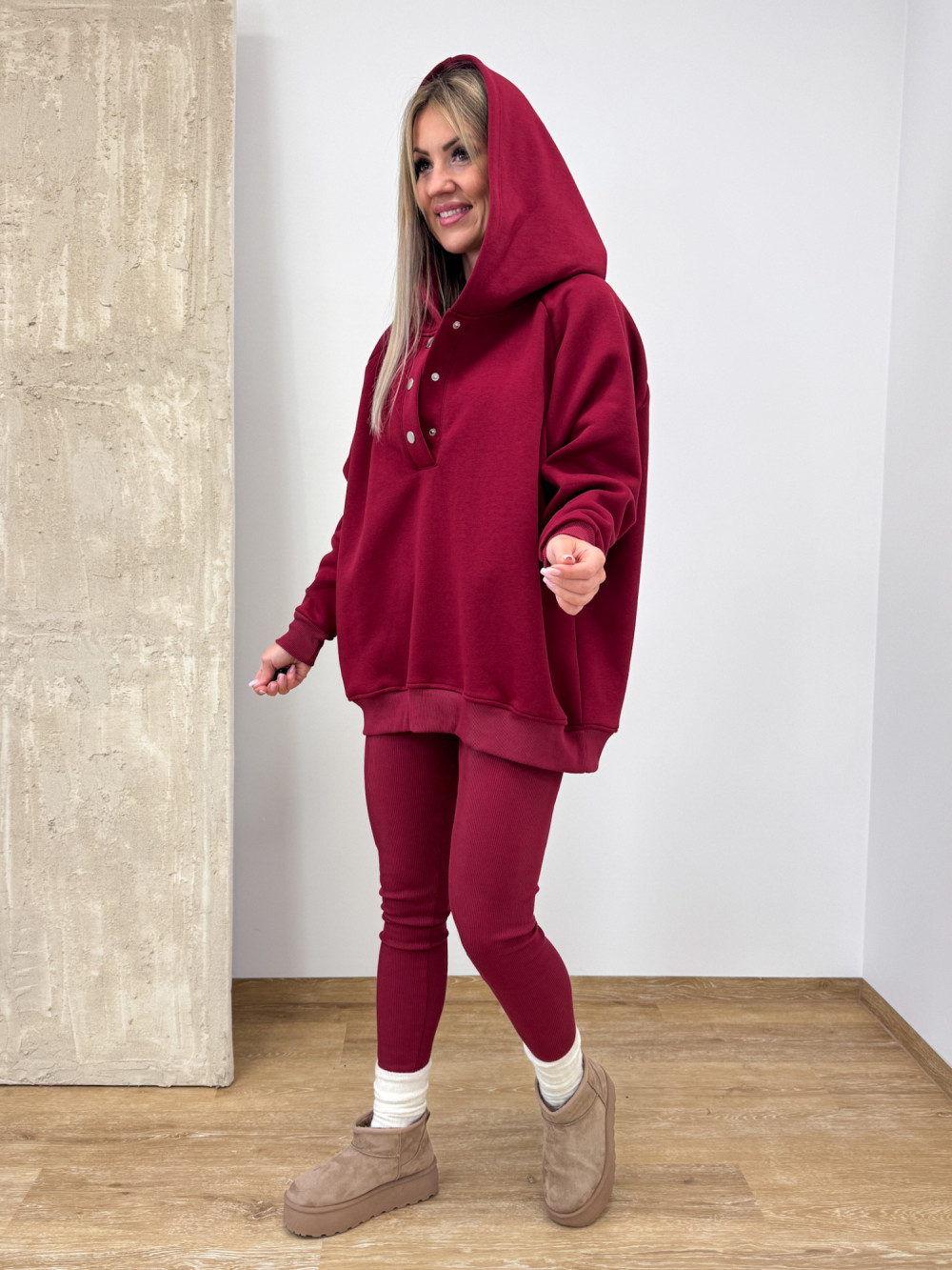 Stylowy i niezwykle komfortowy komplet trzyczęściowy, w skład którego wchodzą: prążkowane legginsy z wysokim stanem na gumce, krótszy top oraz przedłużana bluza o oversizowym kroju z ciepłym, „misiowym” wnętrzem. Bluza zapinana jest z przodu na napy i wyposażona w obfity kaptur, który dodaje całości przytulnego charakteru.