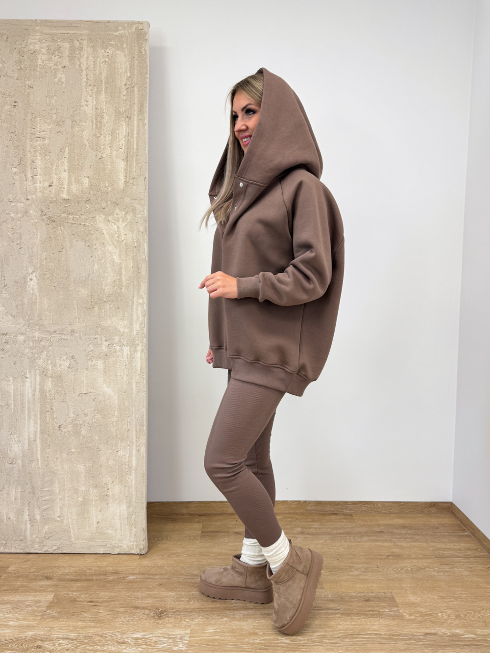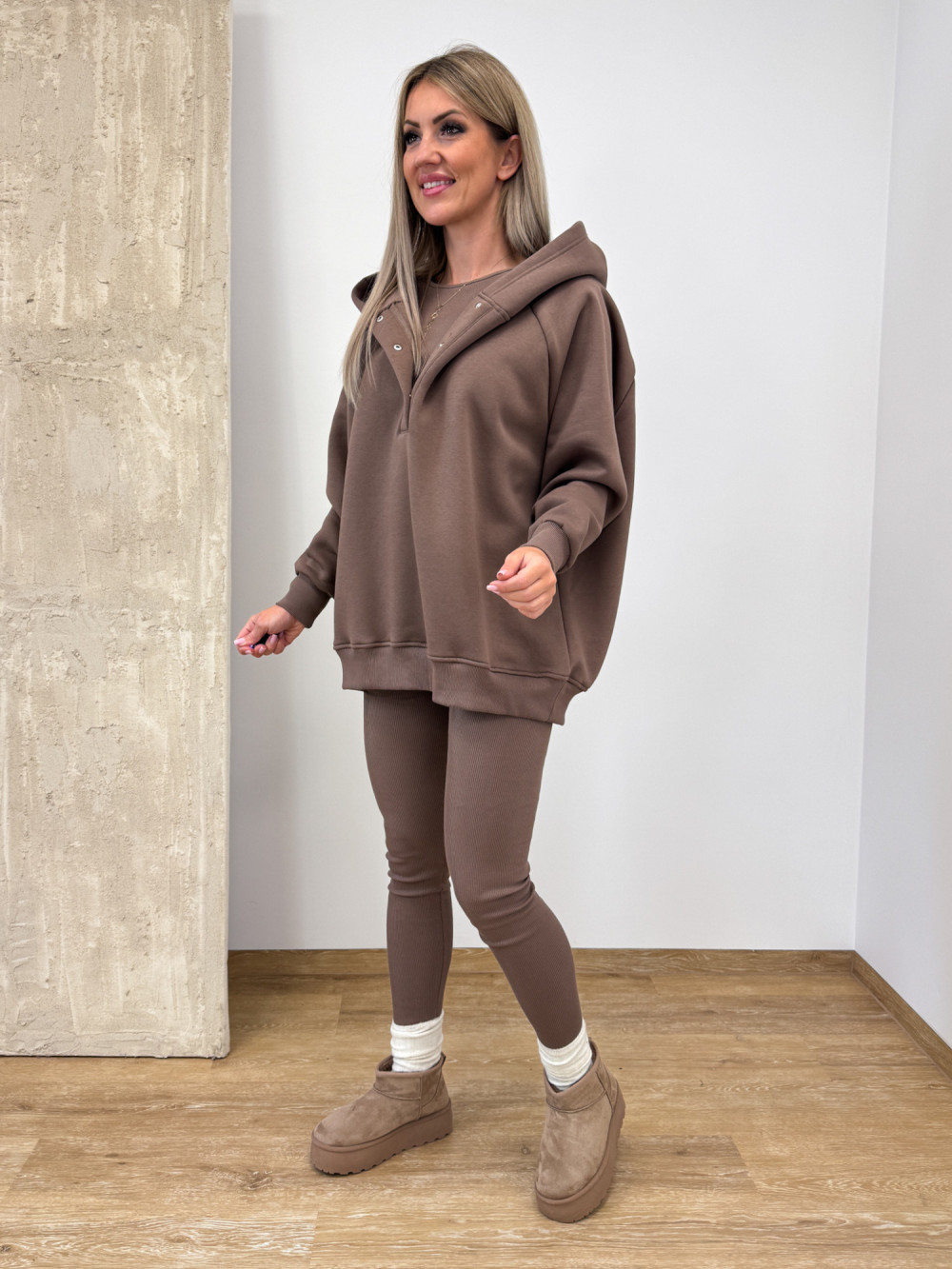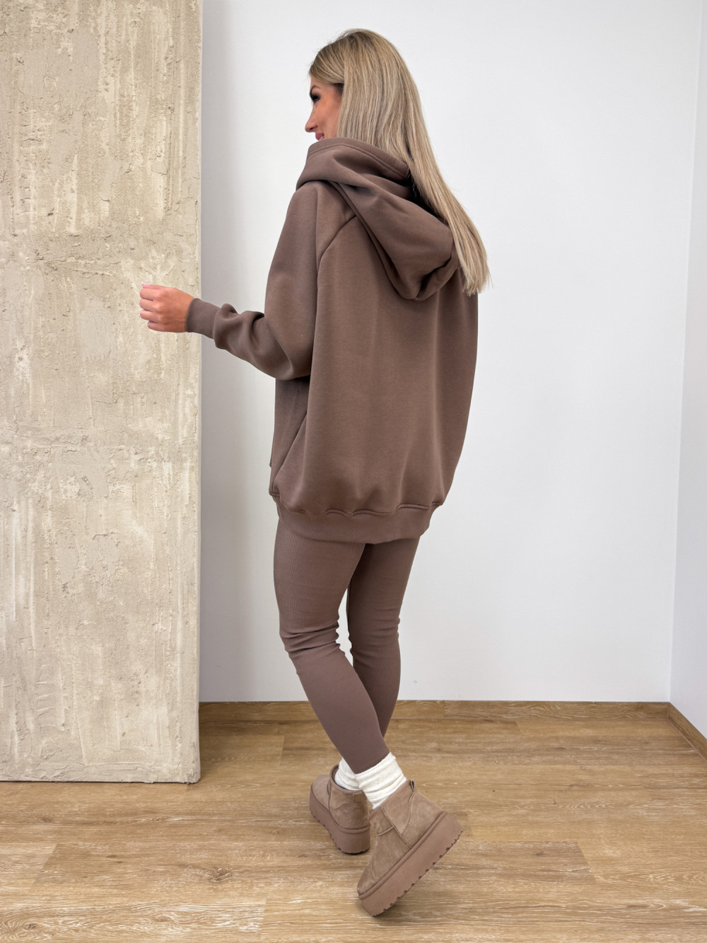 Stylowy i niezwykle komfortowy komplet trzyczęściowy, w skład którego wchodzą: prążkowane legginsy z wysokim stanem na gumce, krótszy top oraz przedłużana bluza o oversizowym kroju z ciepłym, „misiowym” wnętrzem. Bluza zapinana jest z przodu na napy i wyposażona w obfity kaptur, który dodaje całości przytulnego charakteru.