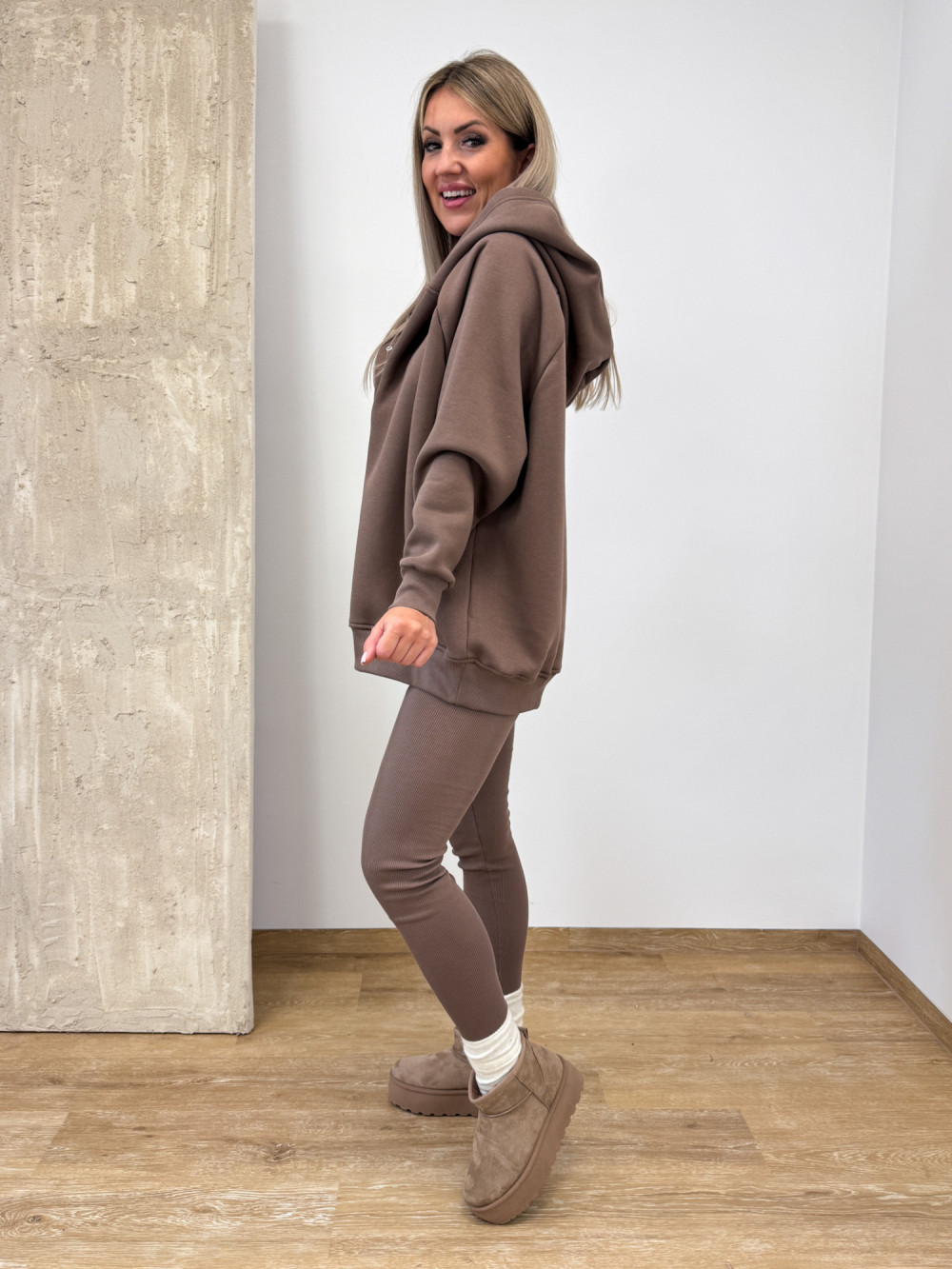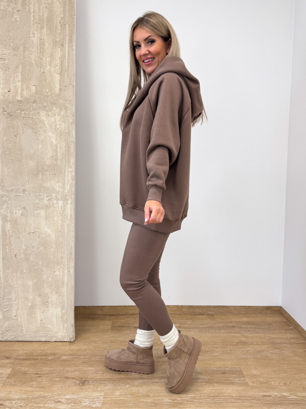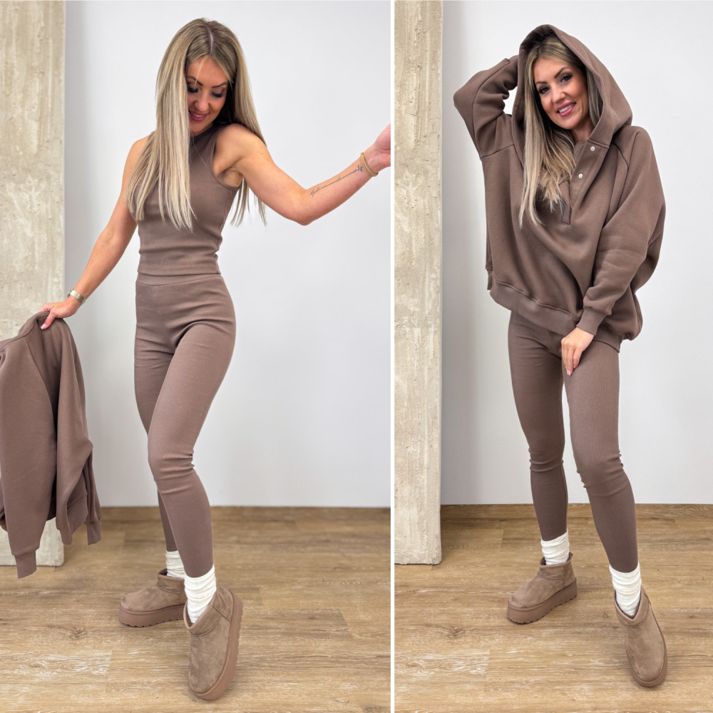 Stylowy i niezwykle komfortowy komplet trzyczęściowy, w skład którego wchodzą: prążkowane legginsy z wysokim stanem na gumce, krótszy top oraz przedłużana bluza o oversizowym kroju z ciepłym, „misiowym” wnętrzem. Bluza zapinana jest z przodu na napy i wyposażona w obfity kaptur, który dodaje całości przytulnego charakteru.