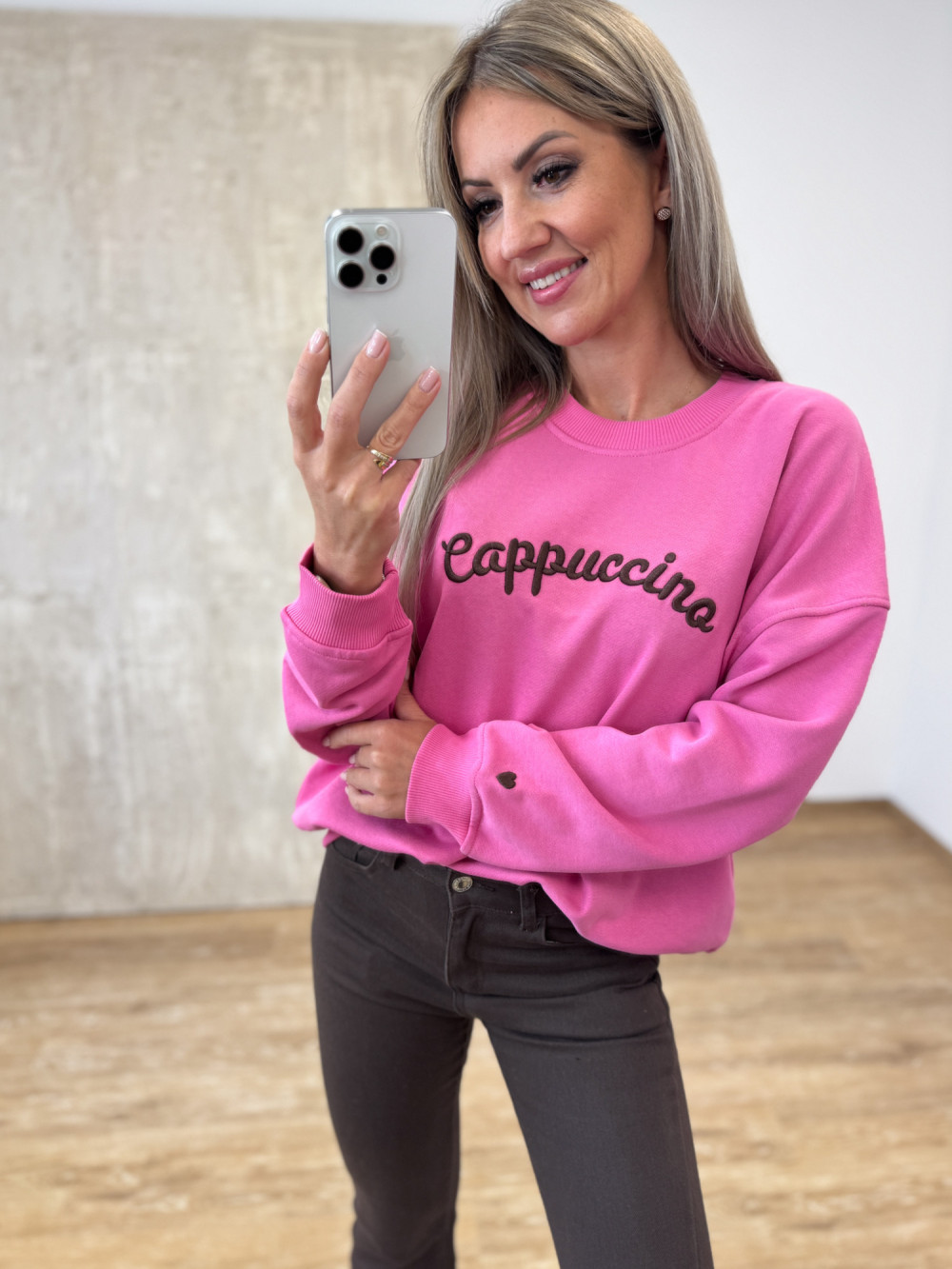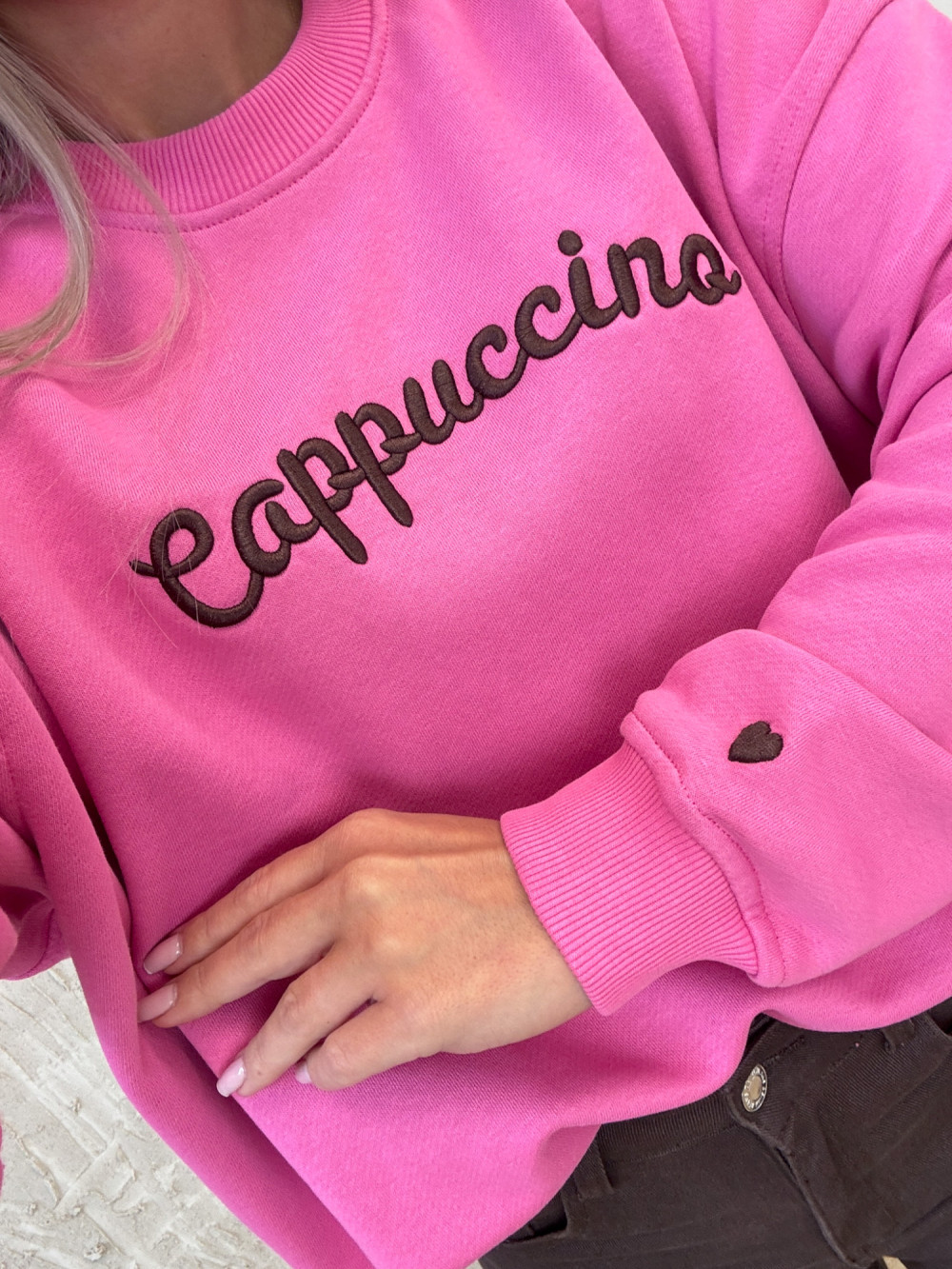 Miękka i wygodna bluza o oversizowym kroju, uszyta z wysokiej jakości bawełny. Z przodu zdobi ją wyszywany napis cappuccino, a na dole rękawa subtelne serduszko, które dodaje uroku. Model dostępny w dwóch wersjach kolorystycznych. Idealna na co dzień – łączy luz, wygodę i kobiecy detal.