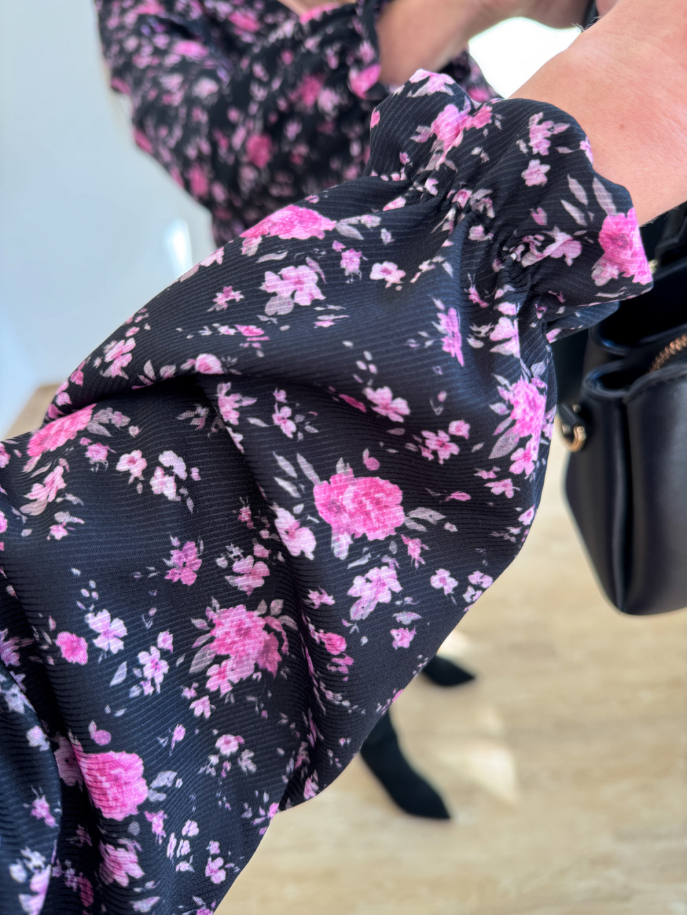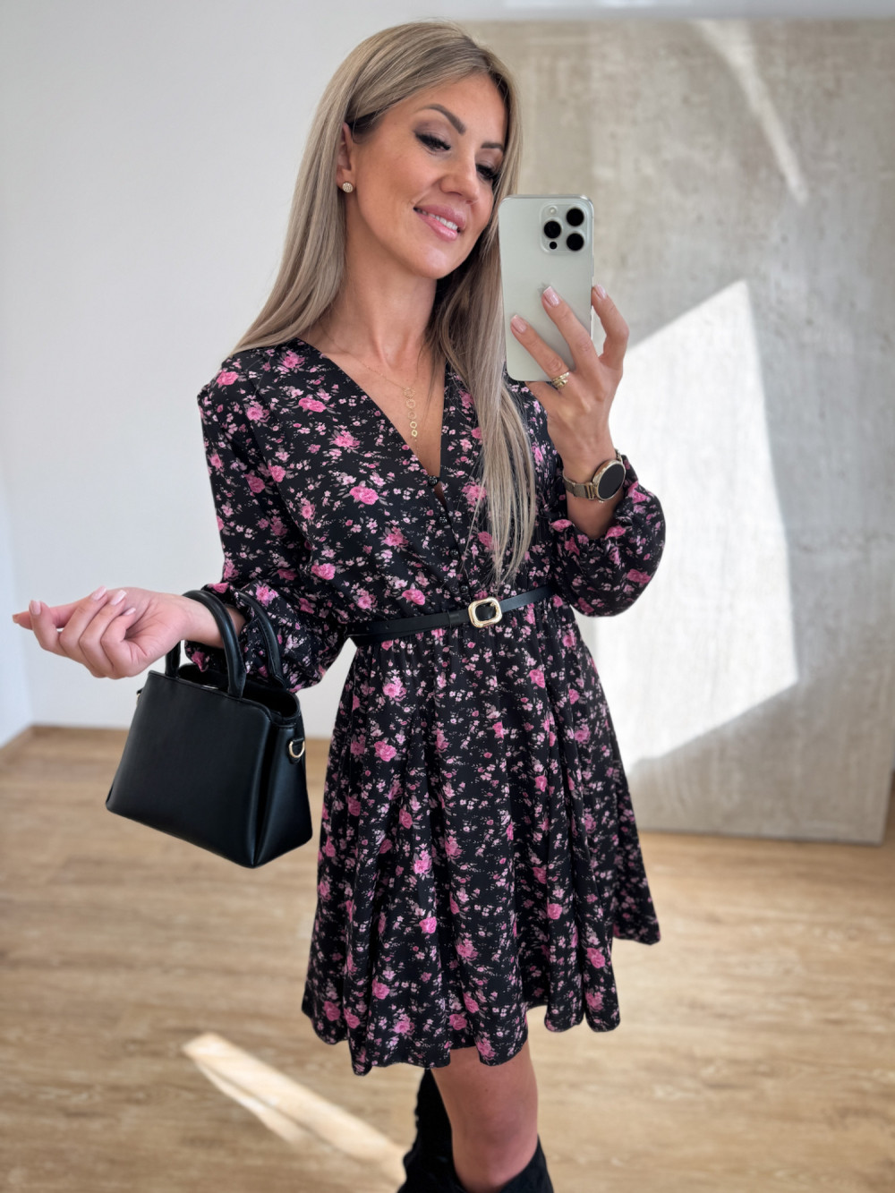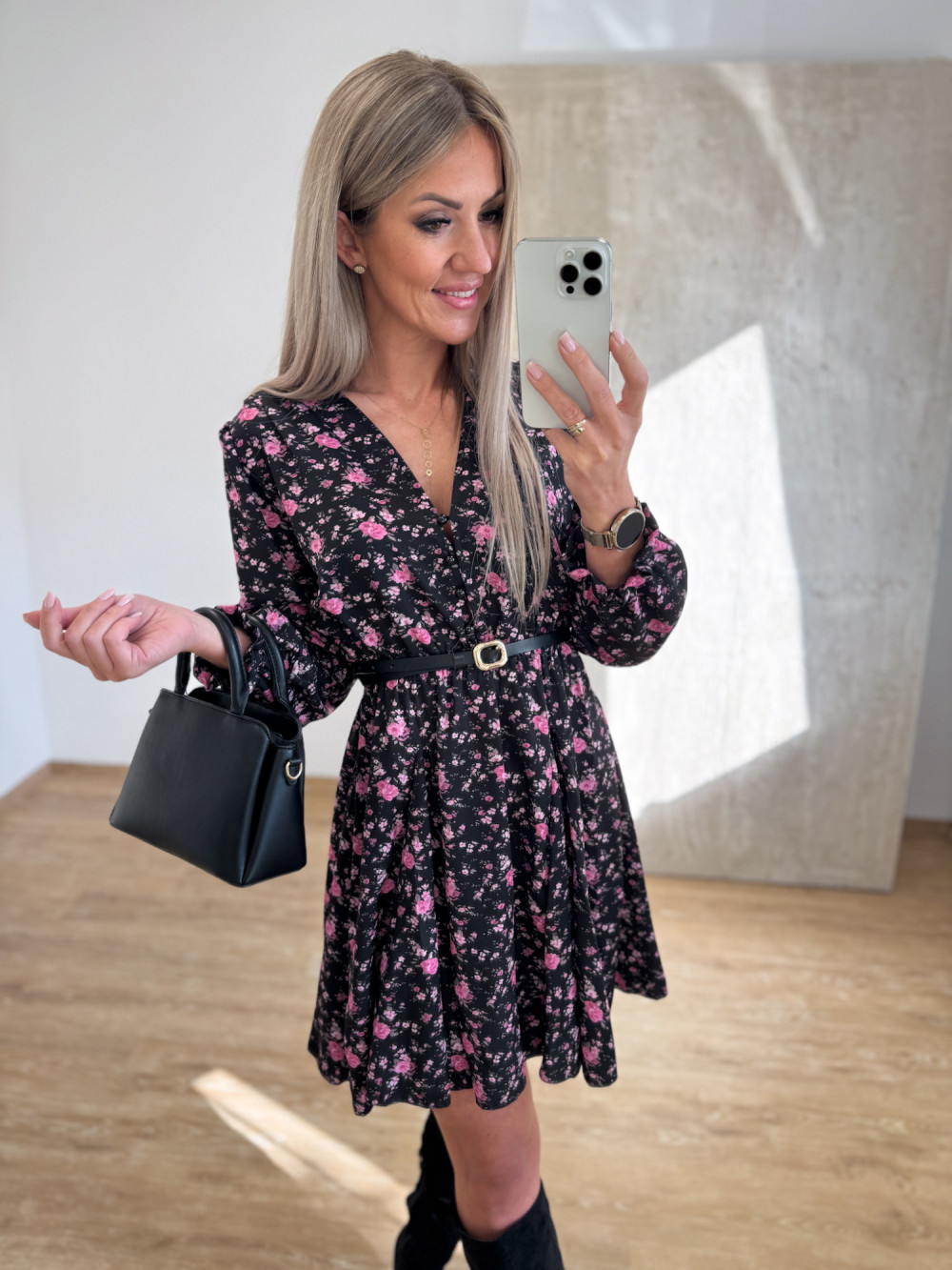Sukienka z Długim Rękawem Krótka Laura - Czarna w Fuksjowe Róże