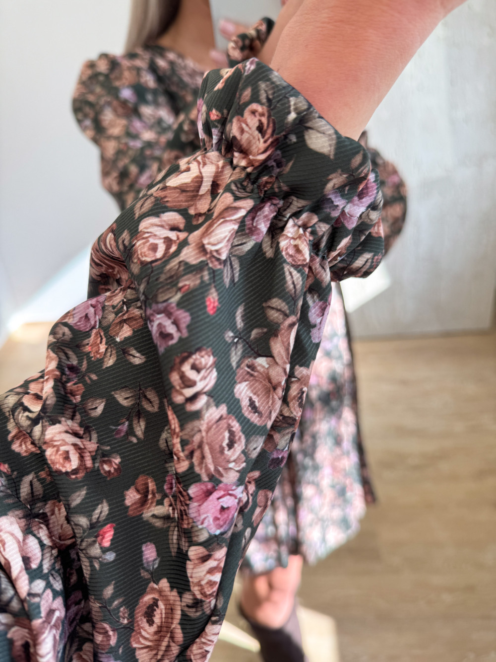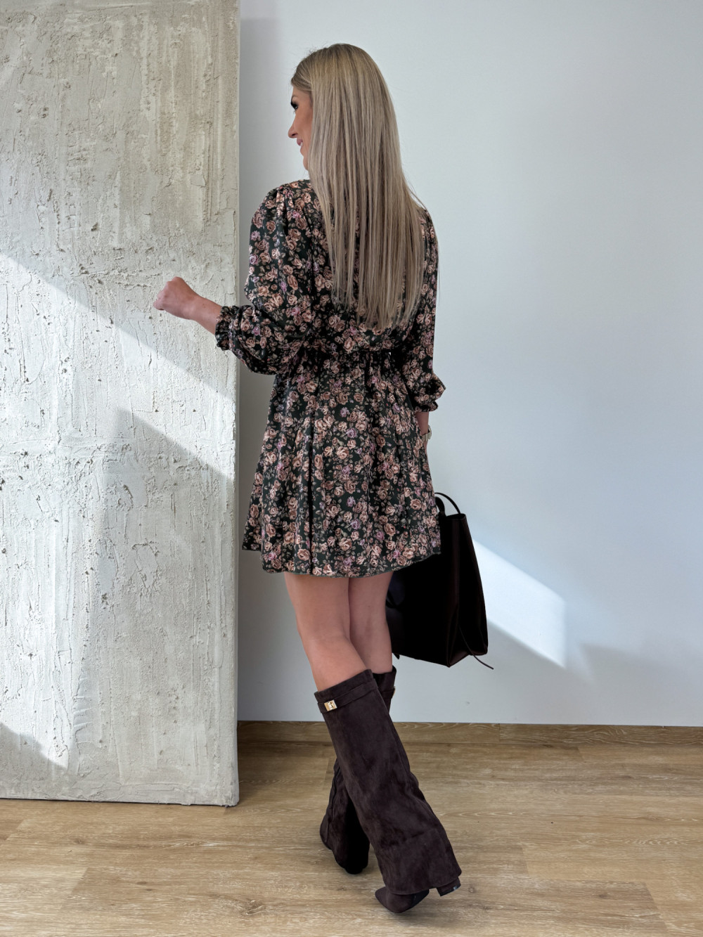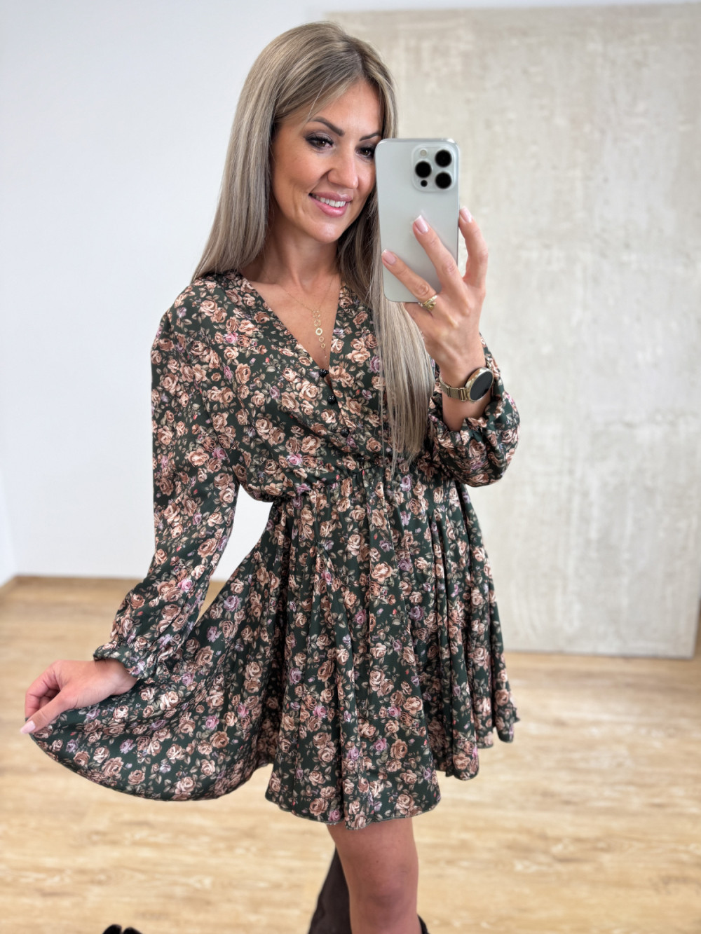 Sukienka z Długim Rękawem Krótka Laura - Zielona w Beżowe Kwiaty
