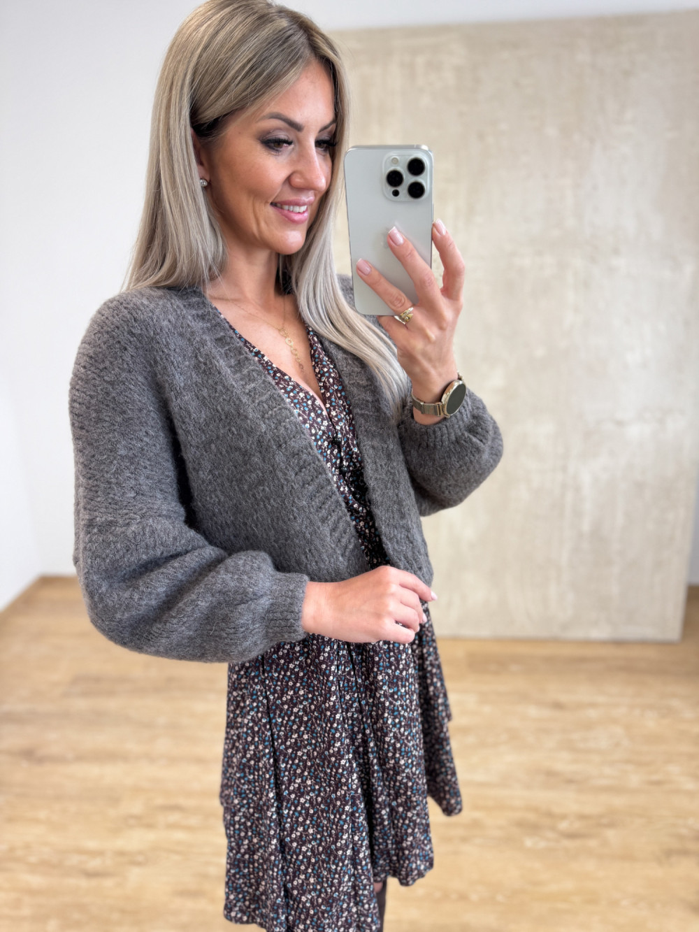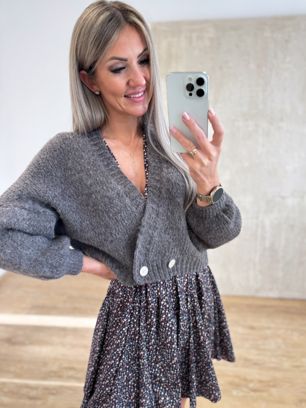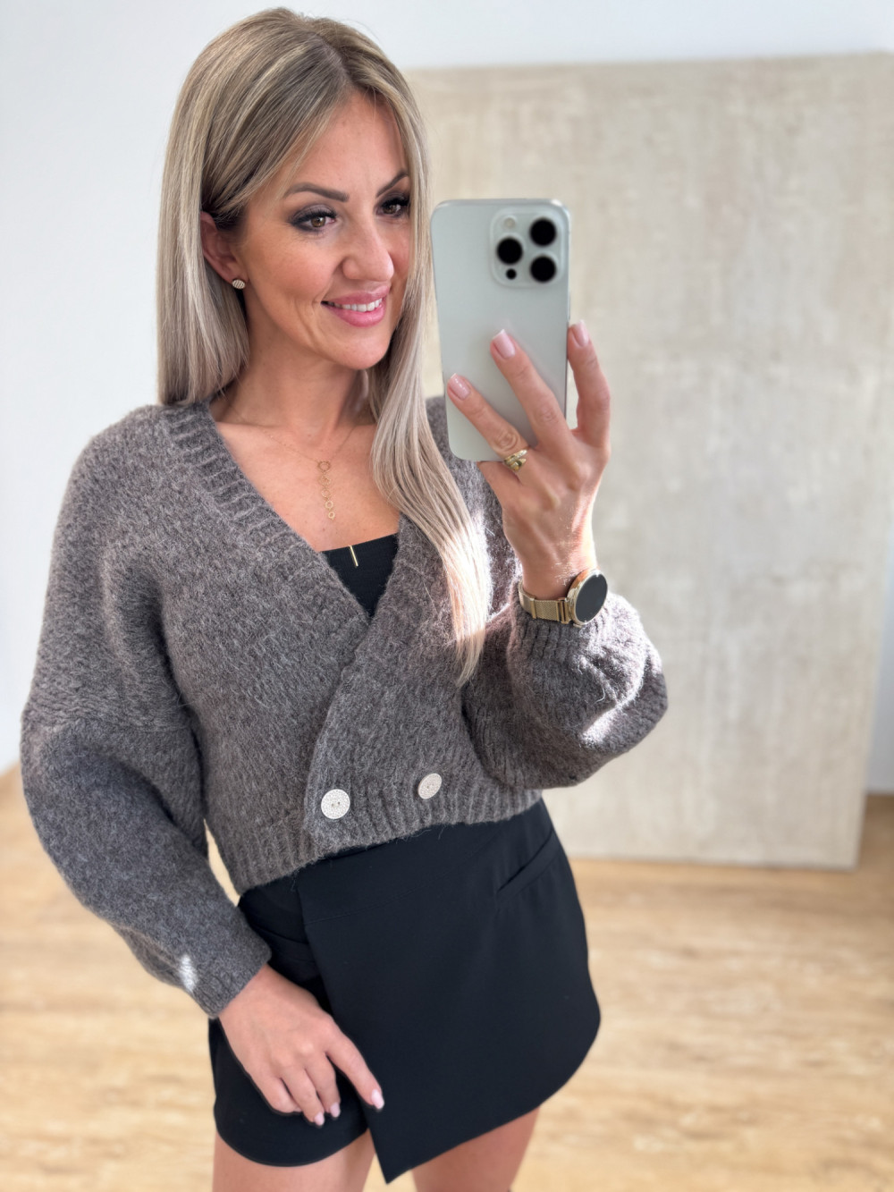 Ciepły i miękki sweterek z domieszką wełny, który otuli Cię w chłodniejsze dni. Krótki fason do pasa z lekko wydłużonym tyłem prezentuje się nowocześnie i lekko. Dwa guziki u dołu pozwalają zapiąć kardigan tak, by nadać mu kształt bomberki – stylowo i z charakterem. To model, który łączy przytulny komfort z modnym akcentem, idealny do codziennych stylizacji.