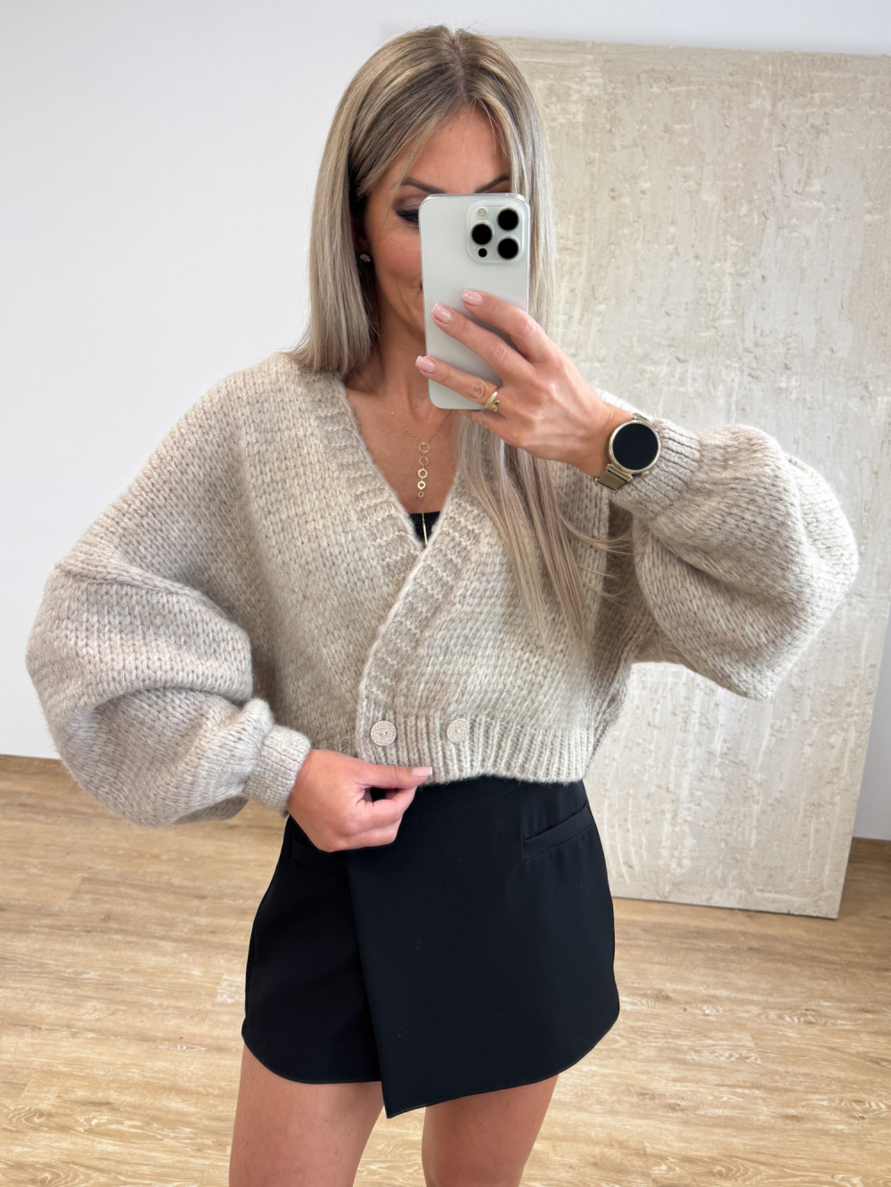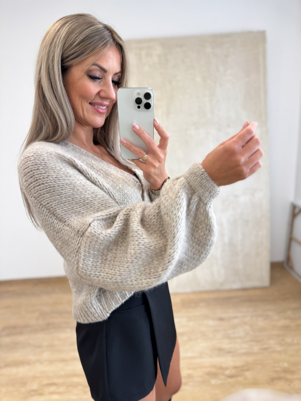 Ciepły i miękki sweterek z domieszką wełny, który otuli Cię w chłodniejsze dni. Krótki fason do pasa z lekko wydłużonym tyłem prezentuje się nowocześnie i lekko. Dwa guziki u dołu pozwalają zapiąć kardigan tak, by nadać mu kształt bomberki – stylowo i z charakterem. To model, który łączy przytulny komfort z modnym akcentem, idealny do codziennych stylizacji.