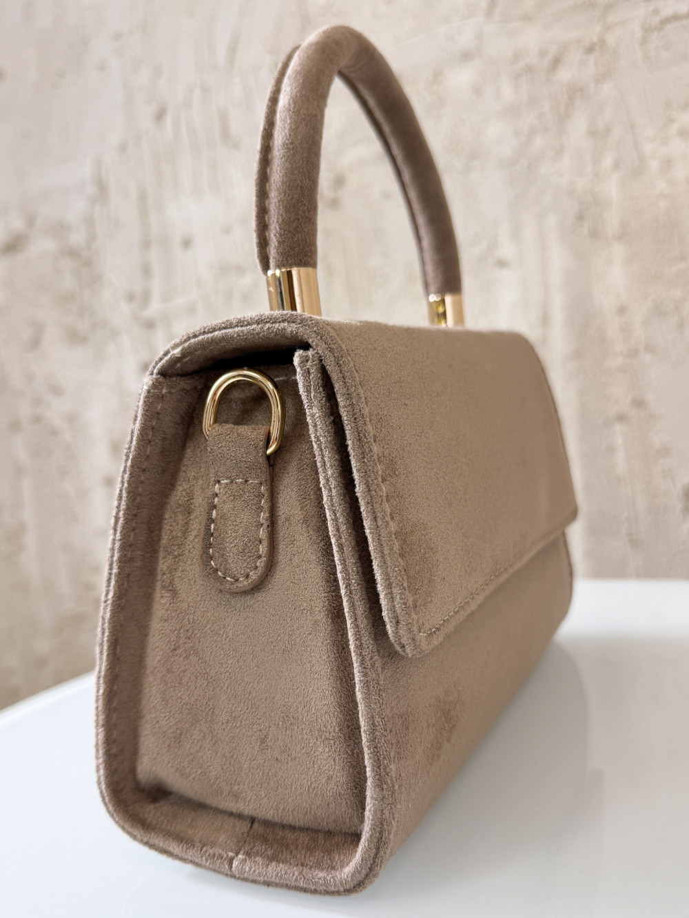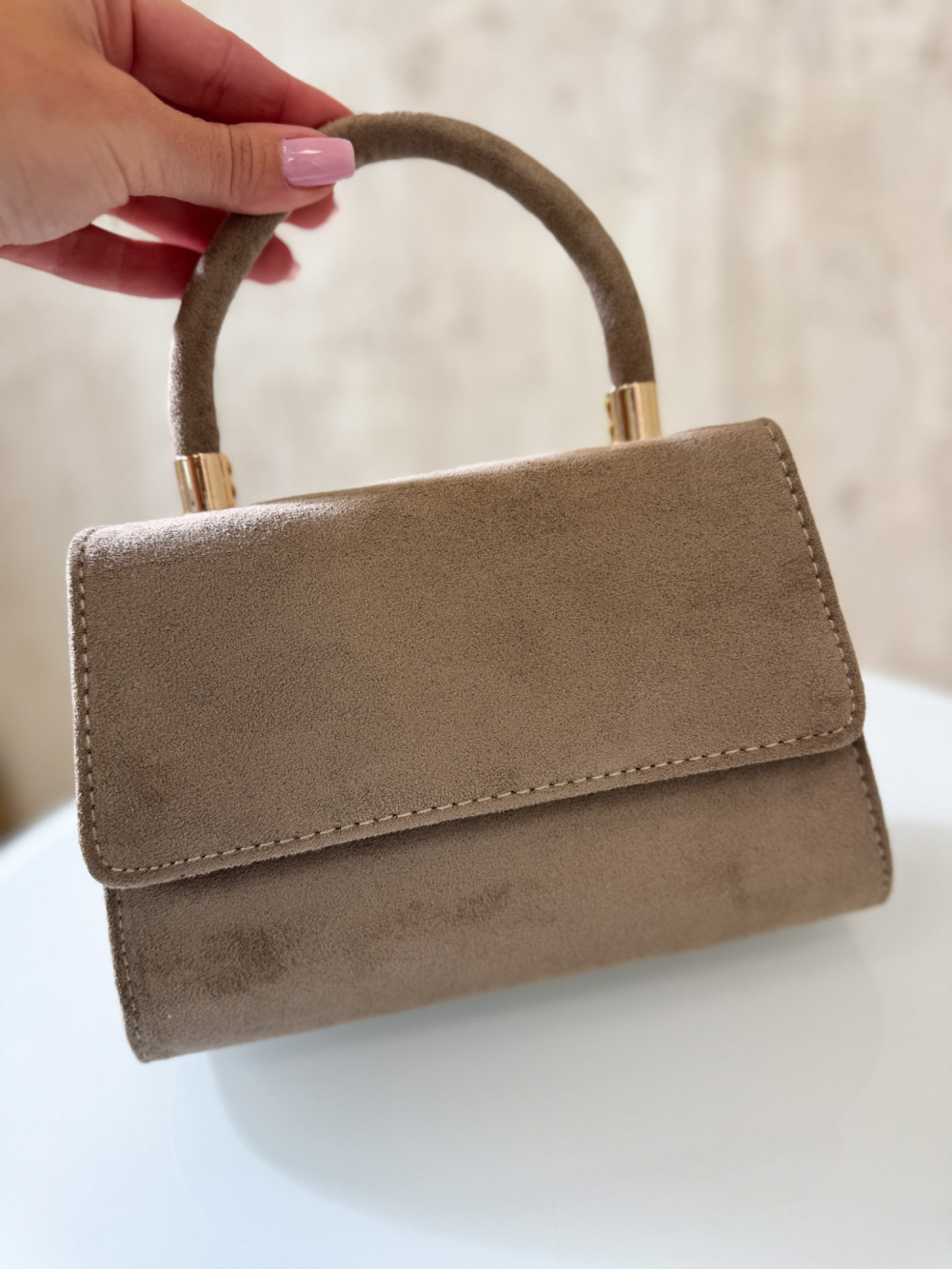 Stylowa mała usztywniana torebka z zamszu, która łączy elegancję z funkcjonalnością. Wyposażona w uchwyt do trzymania w dłoni oraz regulowany pasek zamszowy, dzięki czemu można ją nosić na wiele sposobów. Torebka zapinana na zatrzask, a wewnątrz posiada trzy przegrody, w tym jedną zapinana na suwak, co ułatwia utrzymanie porządku.