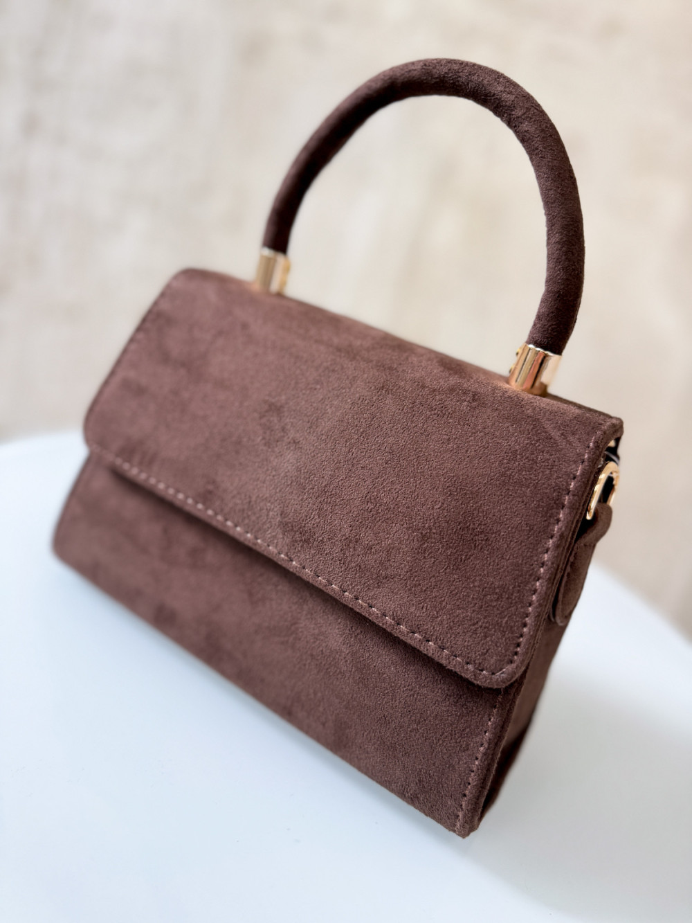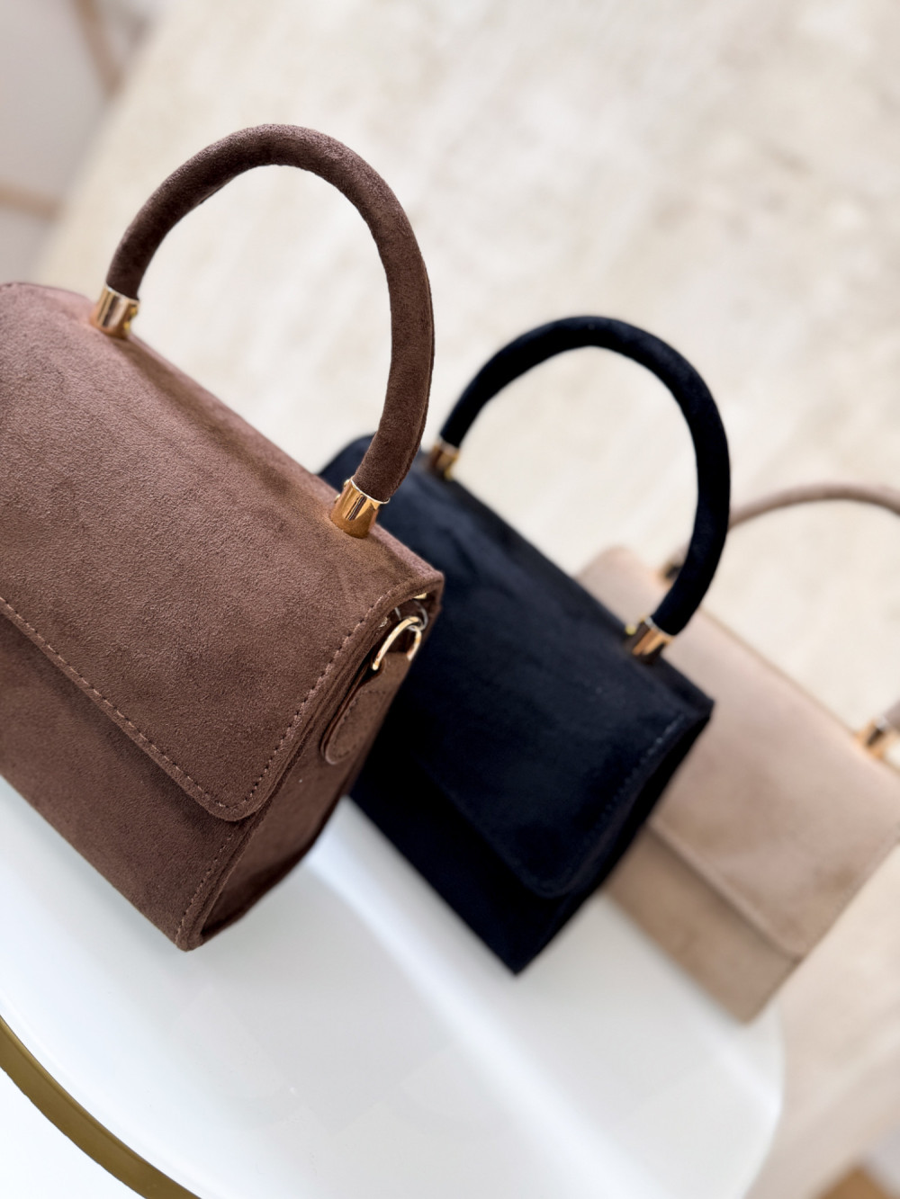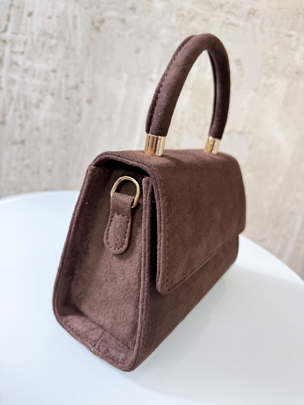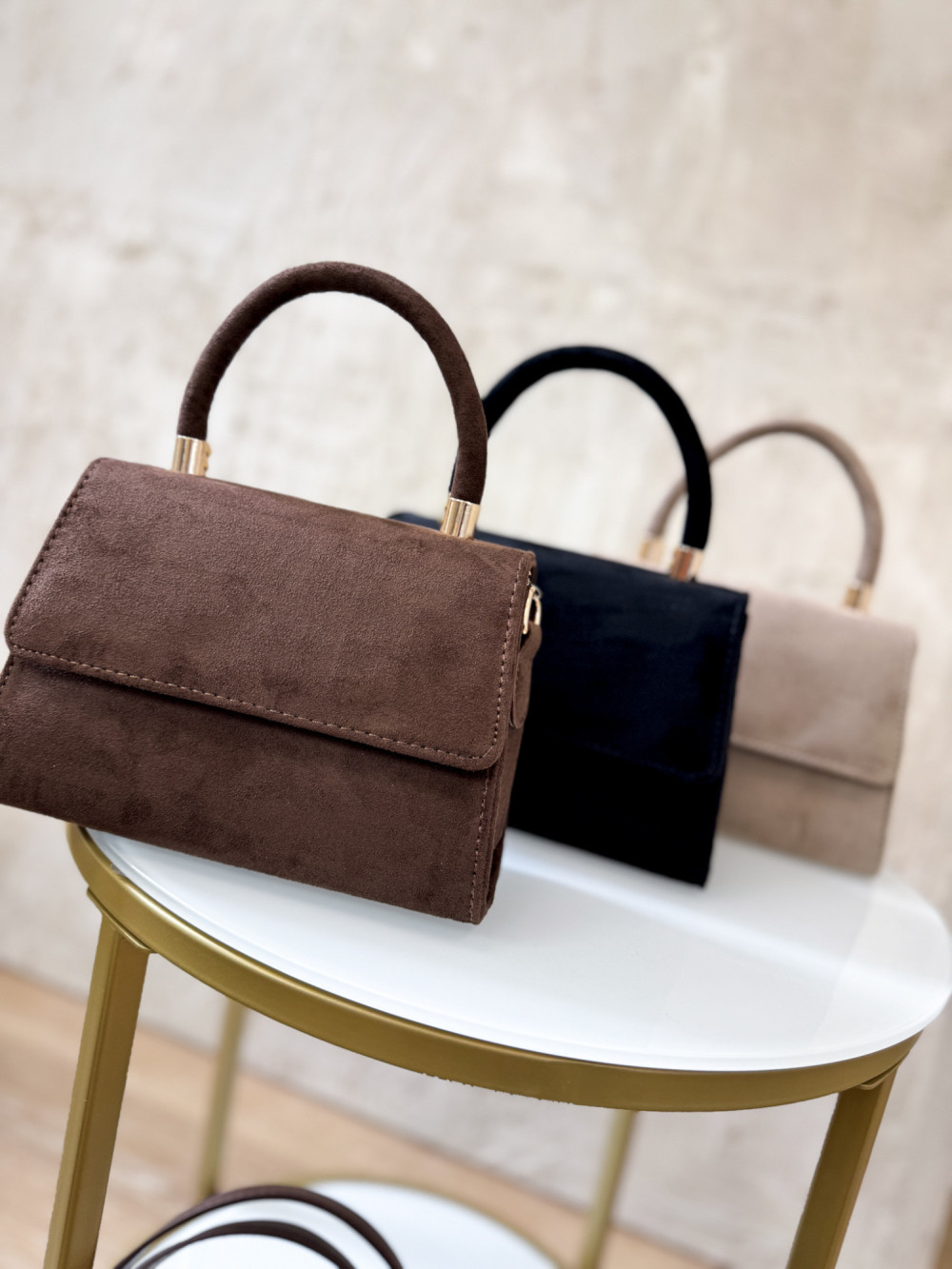 Stylowa mała usztywniana torebka z zamszu, która łączy elegancję z funkcjonalnością. Wyposażona w uchwyt do trzymania w dłoni oraz regulowany pasek zamszowy, dzięki czemu można ją nosić na wiele sposobów. Torebka zapinana na zatrzask, a wewnątrz posiada trzy przegrody, w tym jedną zapinana na suwak, co ułatwia utrzymanie porządku.