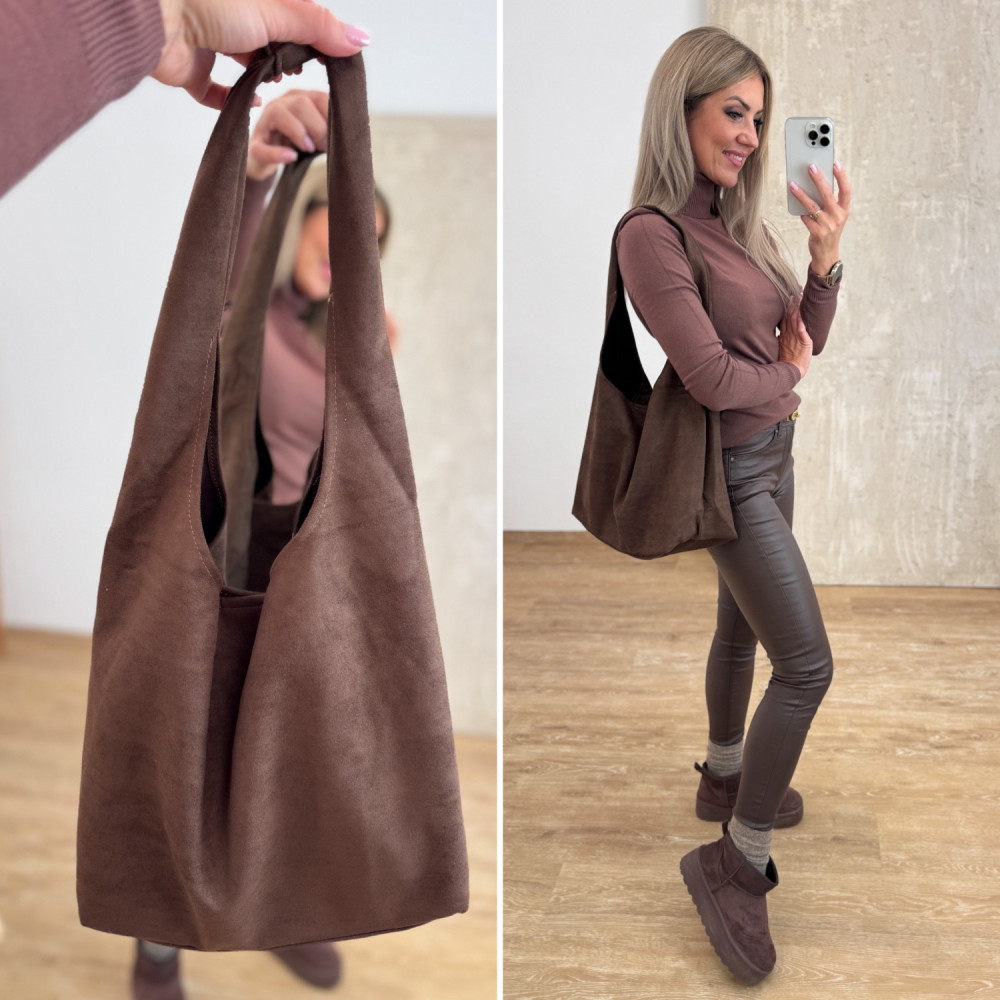 Stylowa i niezwykle praktyczna torebka z miękkiego zamszu o luźnym kroju typu worek. Lekka, przyjemna w dotyku i pojemna – idealna do codziennych stylizacji. Model zapinany na zatrzask, a wewnątrz znajduje się dodatkowa kosmetyczka na zamek, która pozwala wygodnie przechować drobiazgi i najcenniejsze rzeczy.