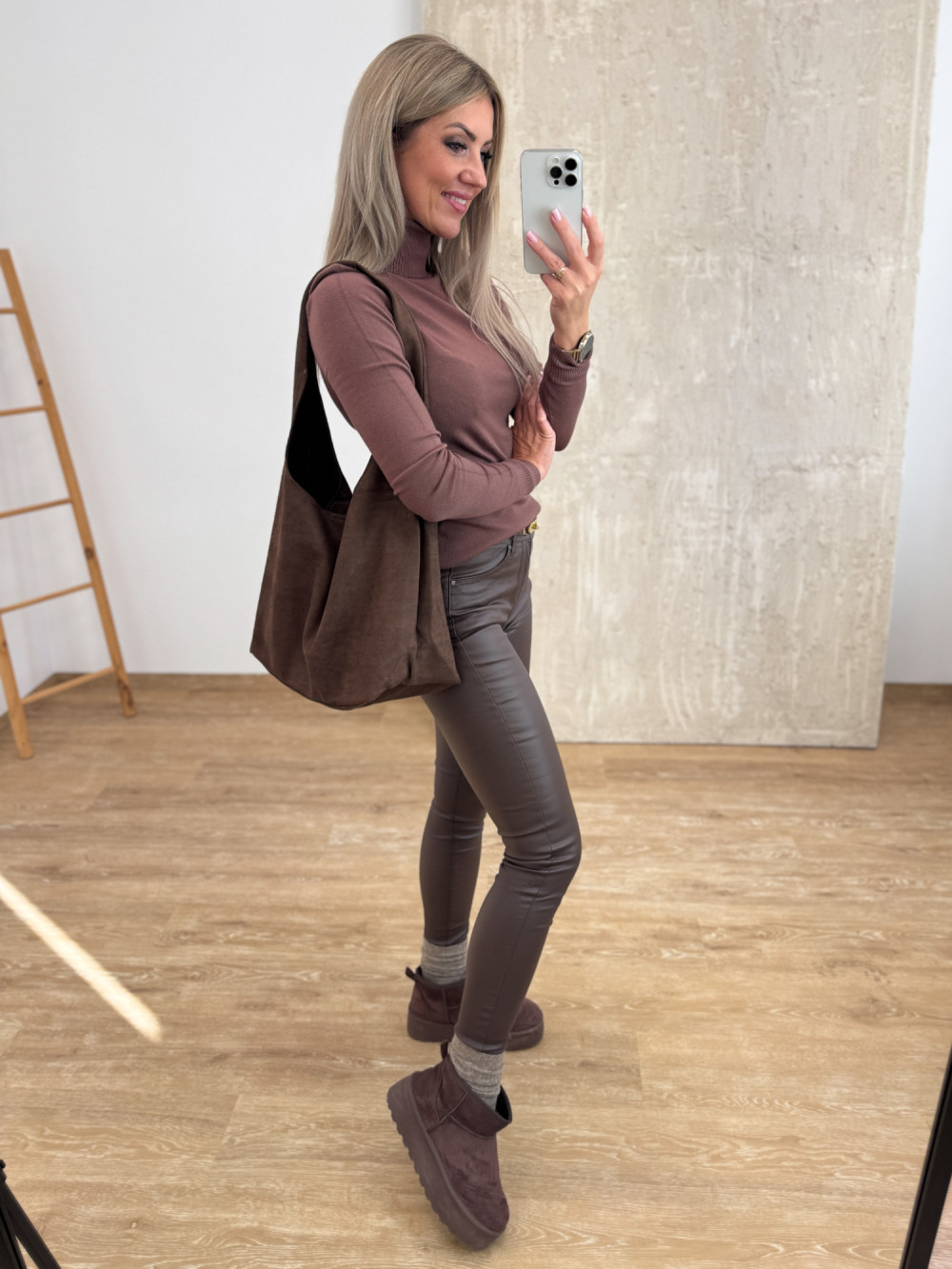 Minimalistyczna forma i miękka konstrukcja sprawiają, że torebka doskonale dopasowuje się do kształtu sylwetki, łącząc funkcjonalność z modnym, miejskim stylem.