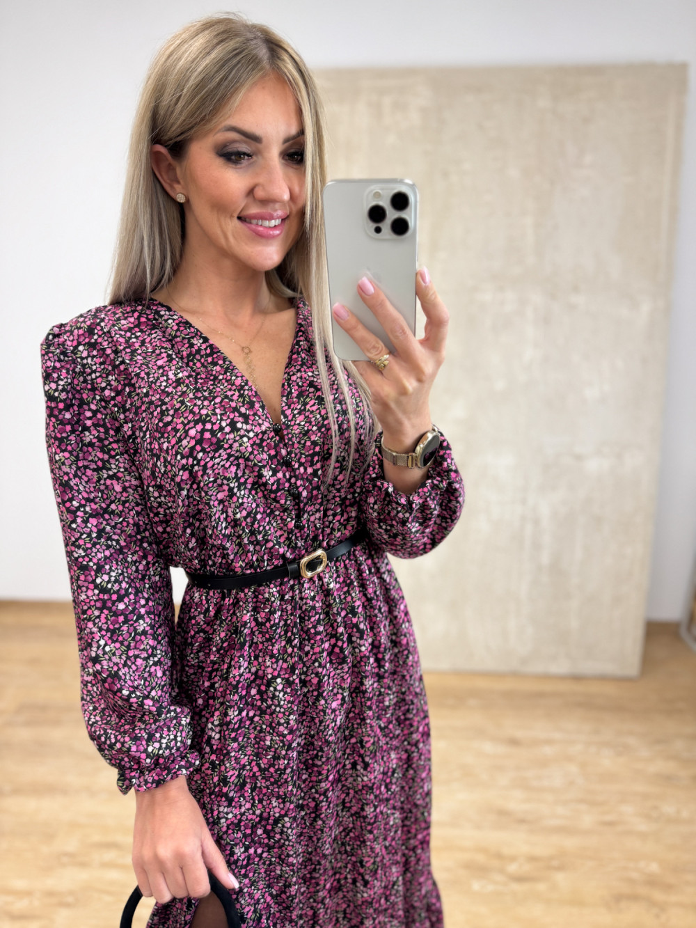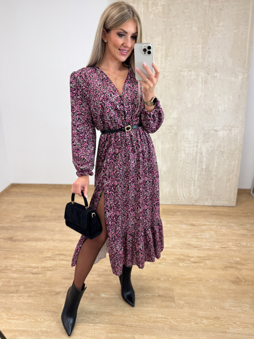 Sukienka z Długim Rękawem Midi Laura - Czarna Drobne Różowe Kwiatki
