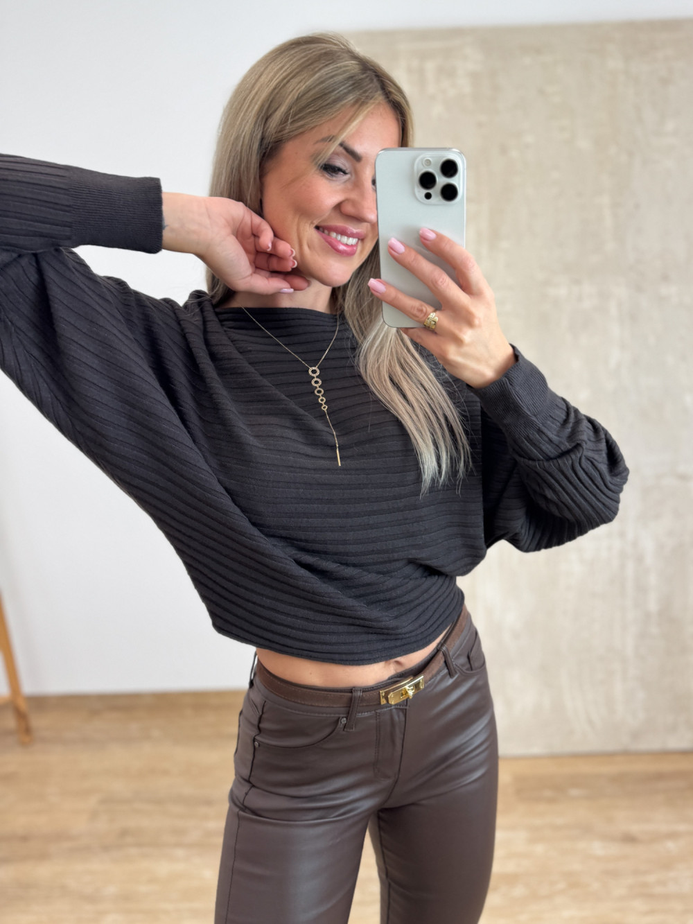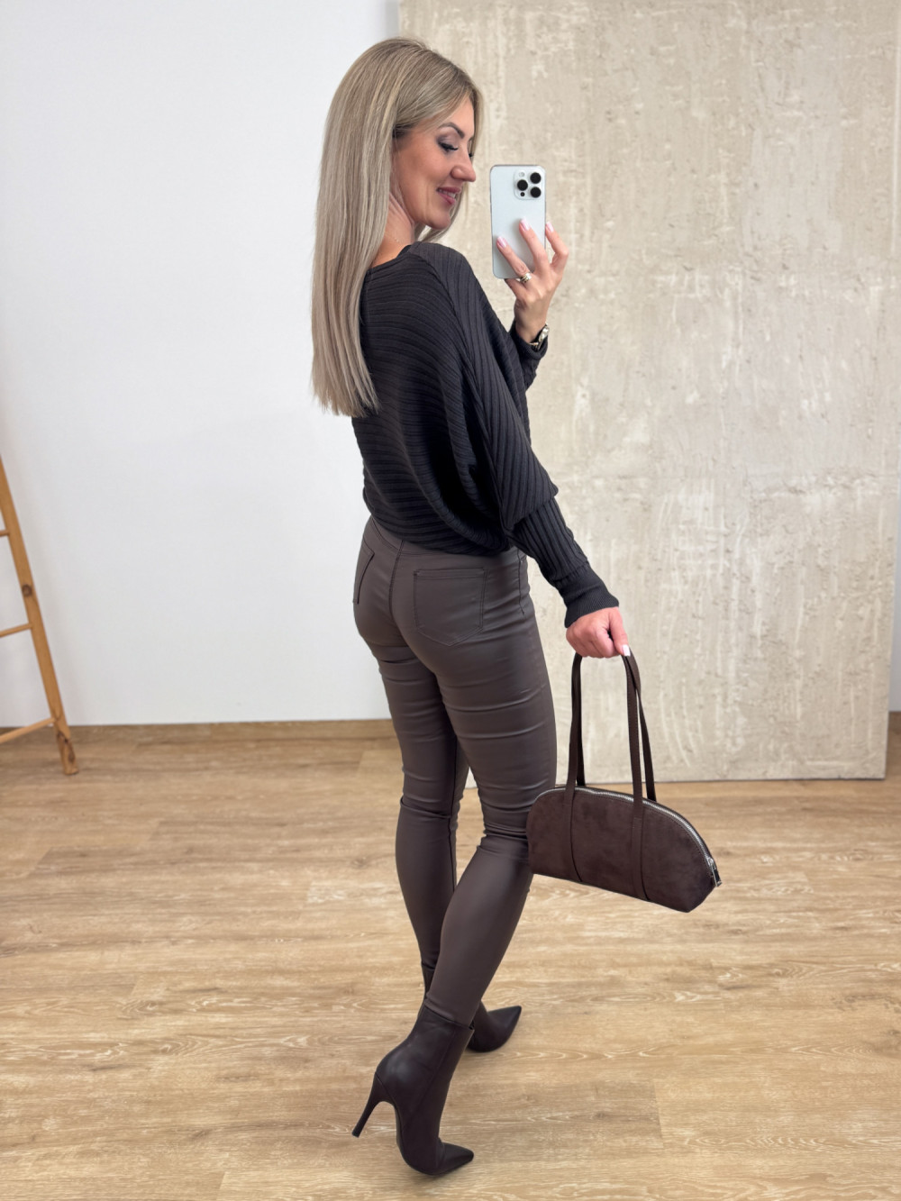 Przepiękny model swetra o luźnym, nietoperzowym kroju, który zapewnia pełen komfort i swobodę ruchów. Jego wyjątkowy charakter podkreślają poziome tłoczenia w strukturze materiału, nadające całości oryginalnego i stylowego wyglądu. Miękka, przyjemna w dotyku dzianina, tworzy kobiecy, lekko nonszalancki efekt. Idealny zarówno do jeansów, jak i eleganckich spodni czy spódnic — sprawdzi się w każdej stylizacji, niezależnie od okazji.