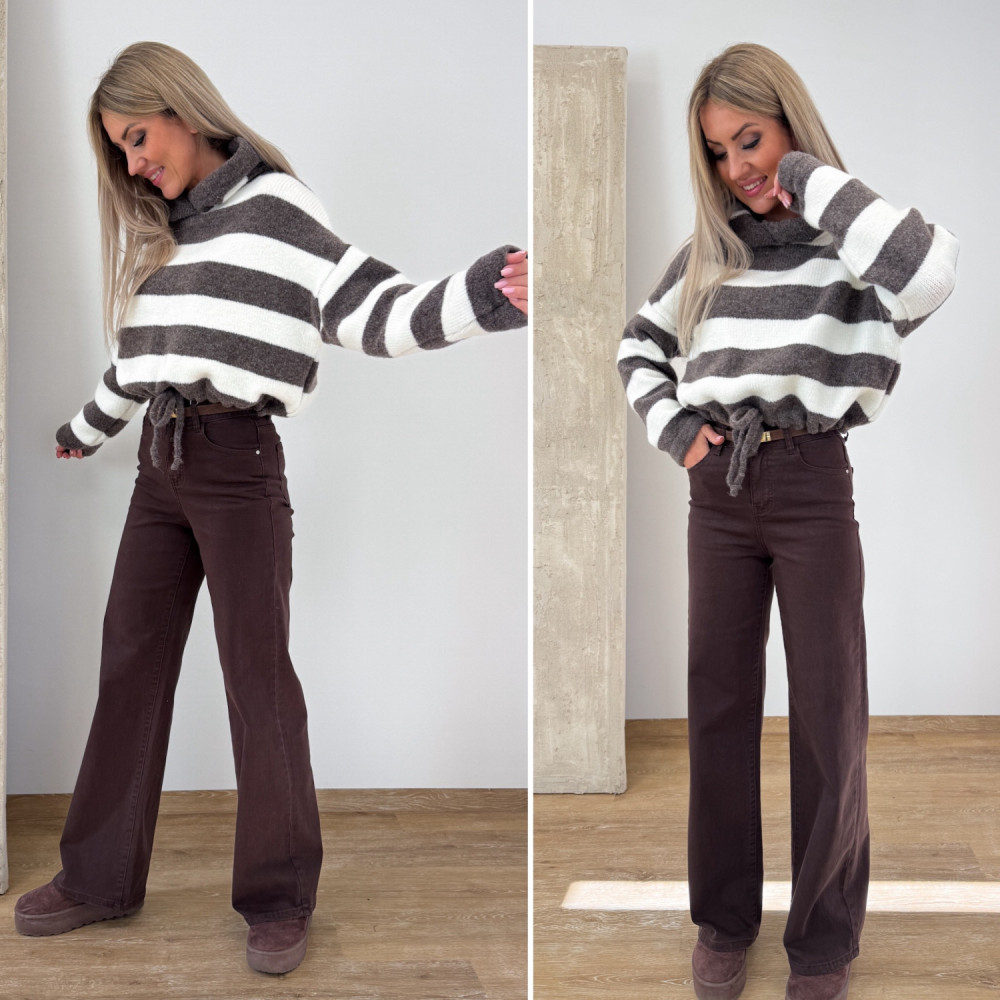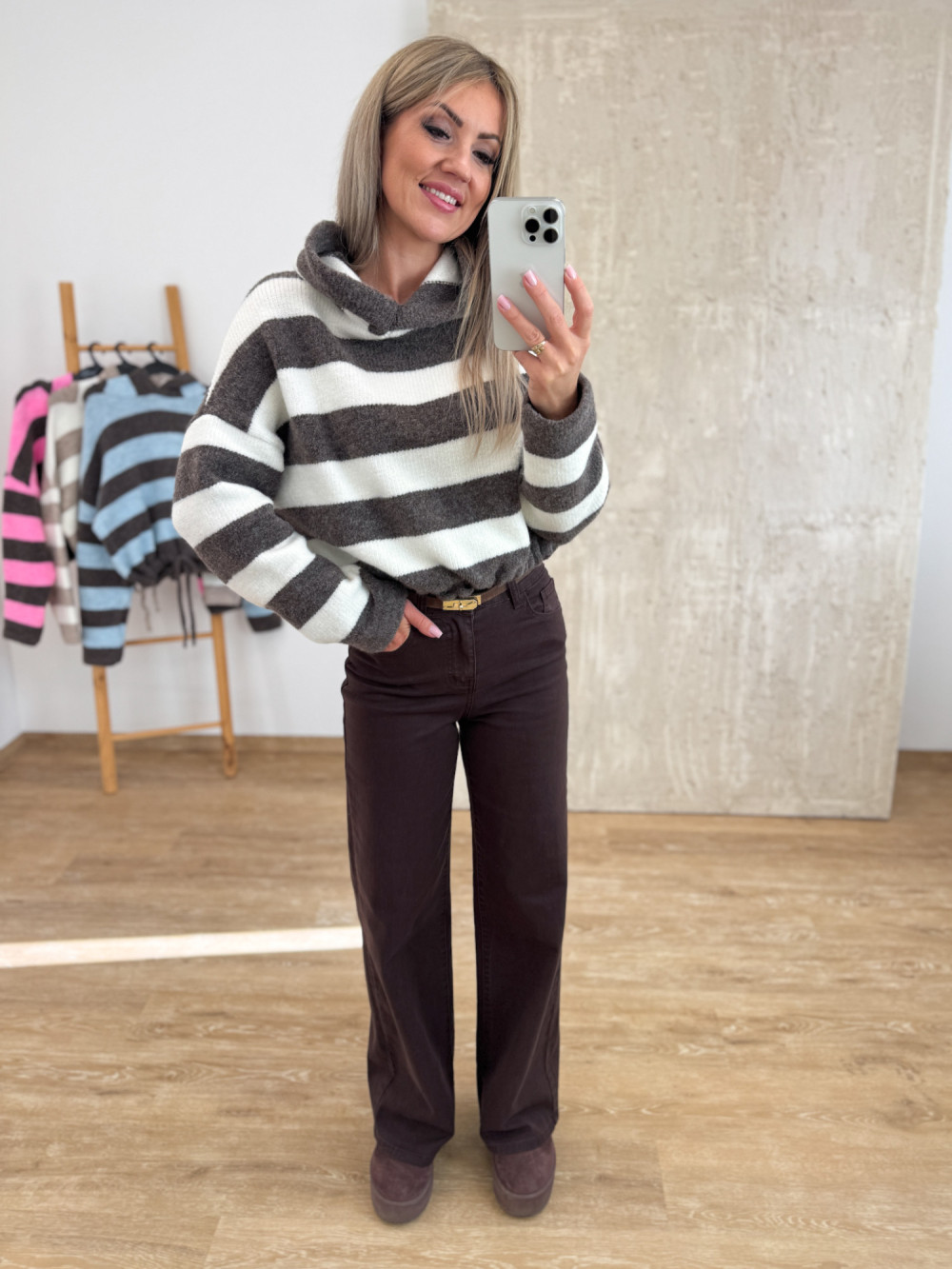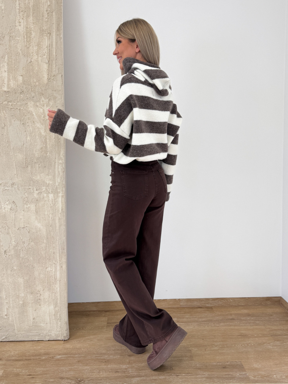 Sweter w Pasy z Kapturem Betis - Czekolada z Śmietanką