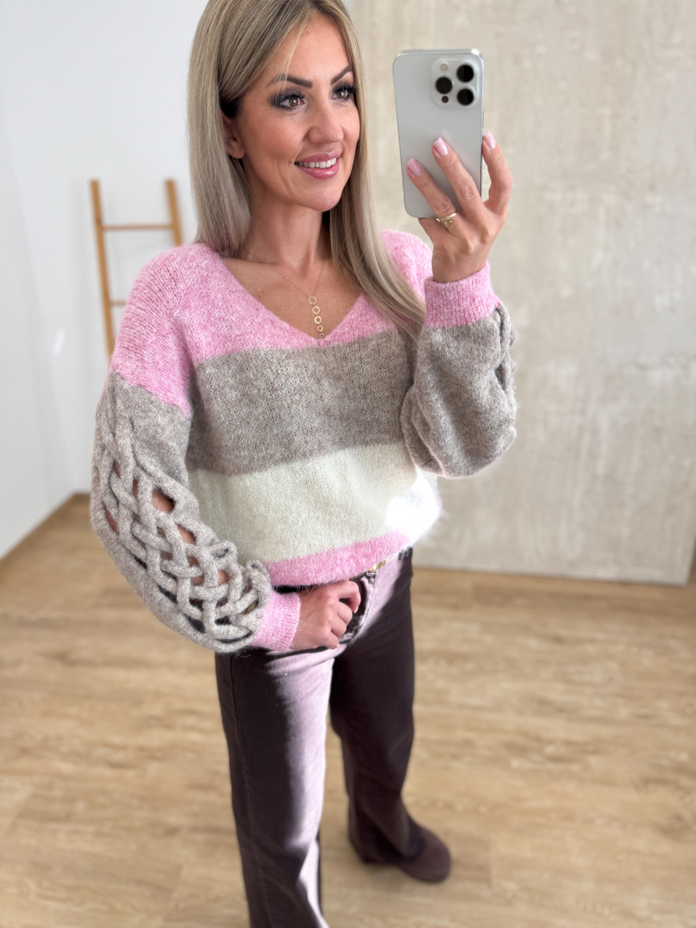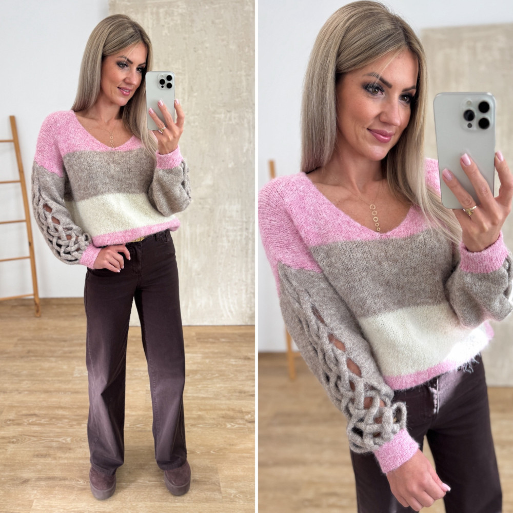 Sweter z Ozdobnym Rękawem Trenza - Róż/Beż/Wanilia