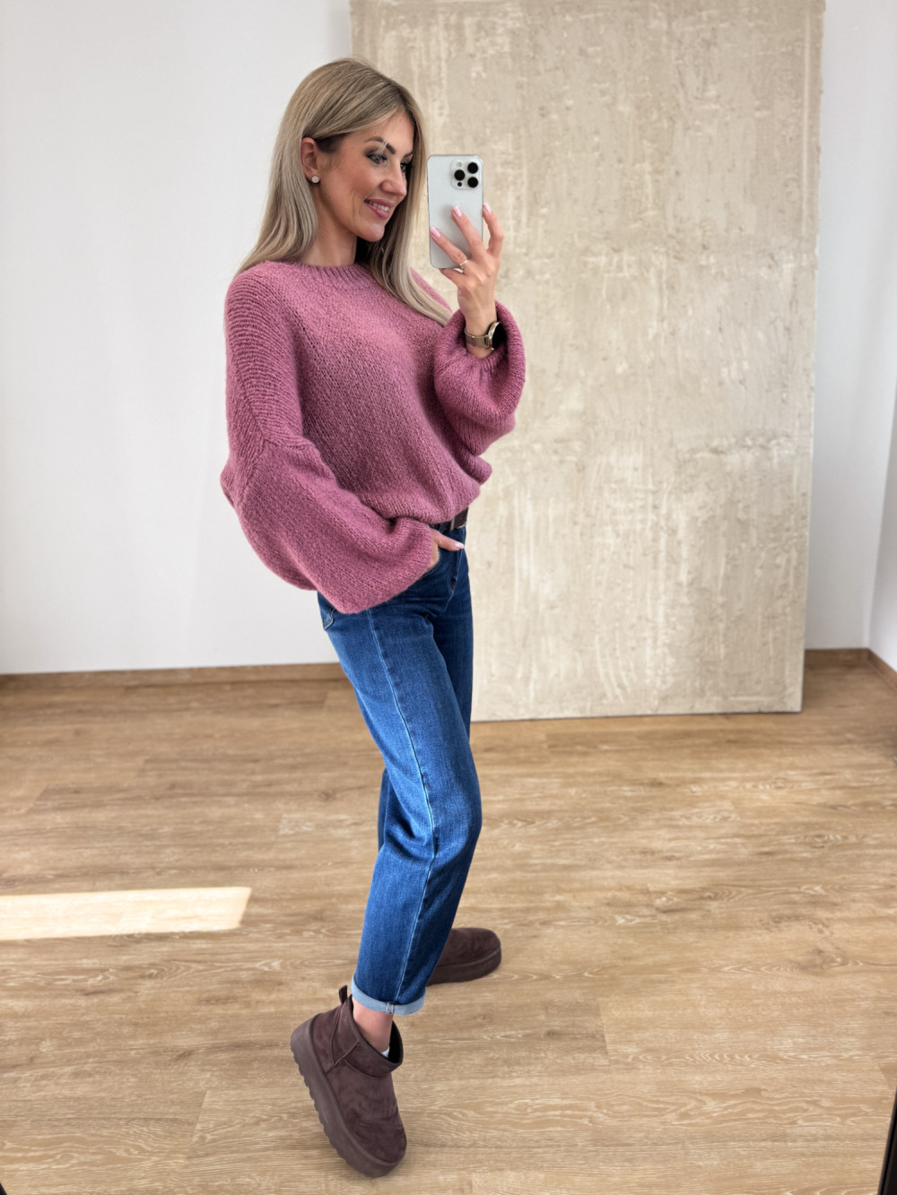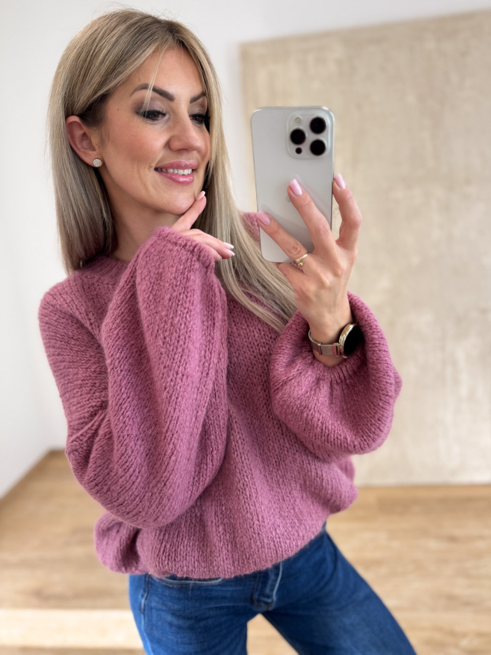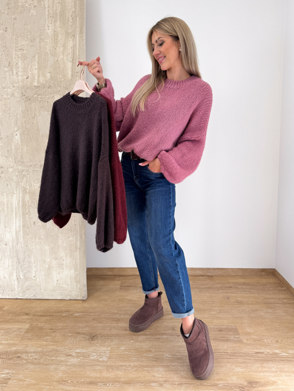 Dół swetra i rękawy zakończone gumką wszytą w rulon, dzięki czemu sweter pięknie układa się na sylwetce i zachowuje fason podczas noszenia.