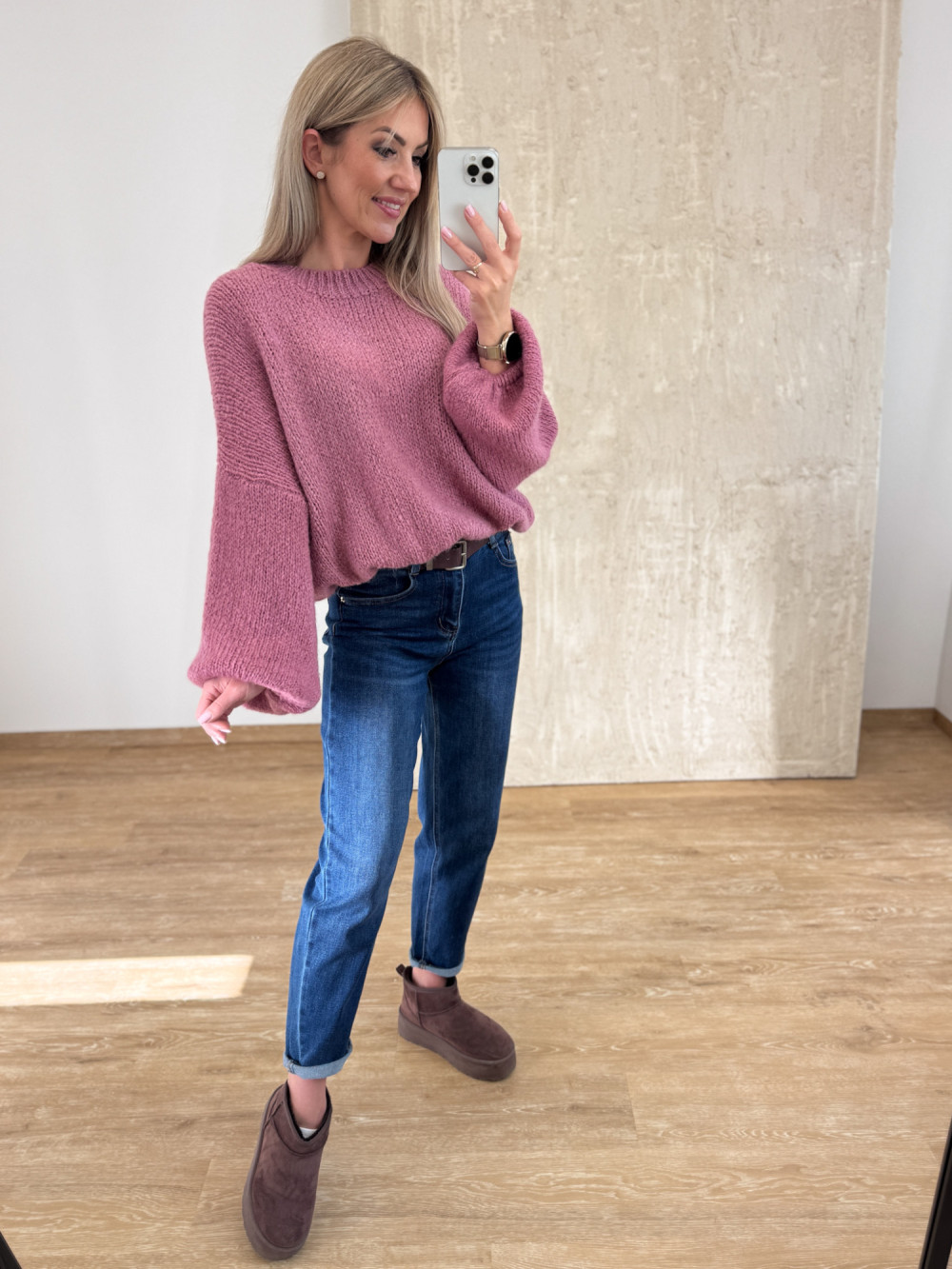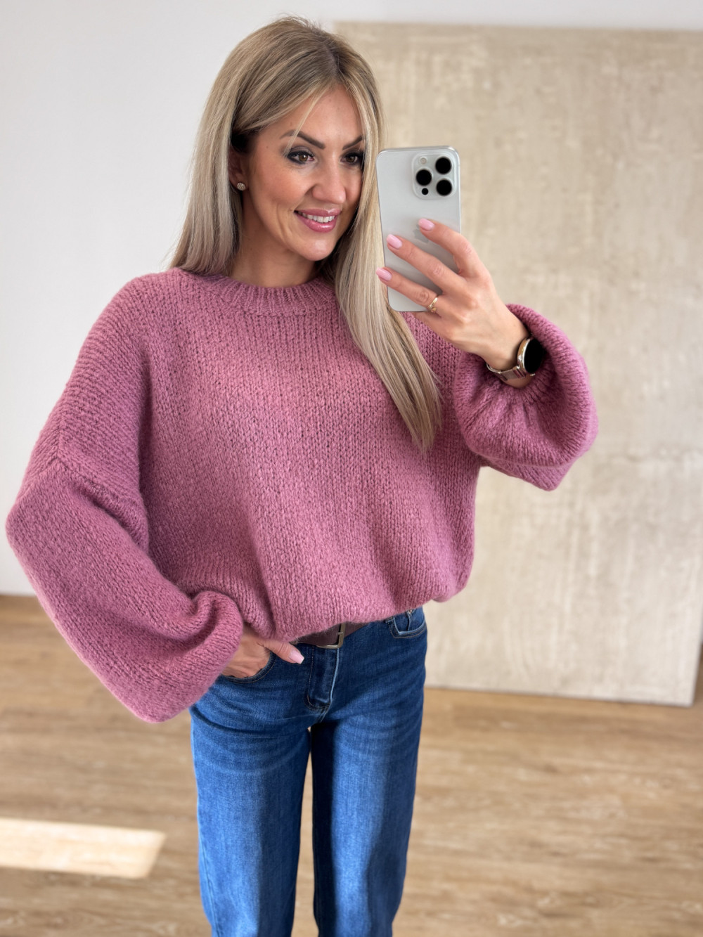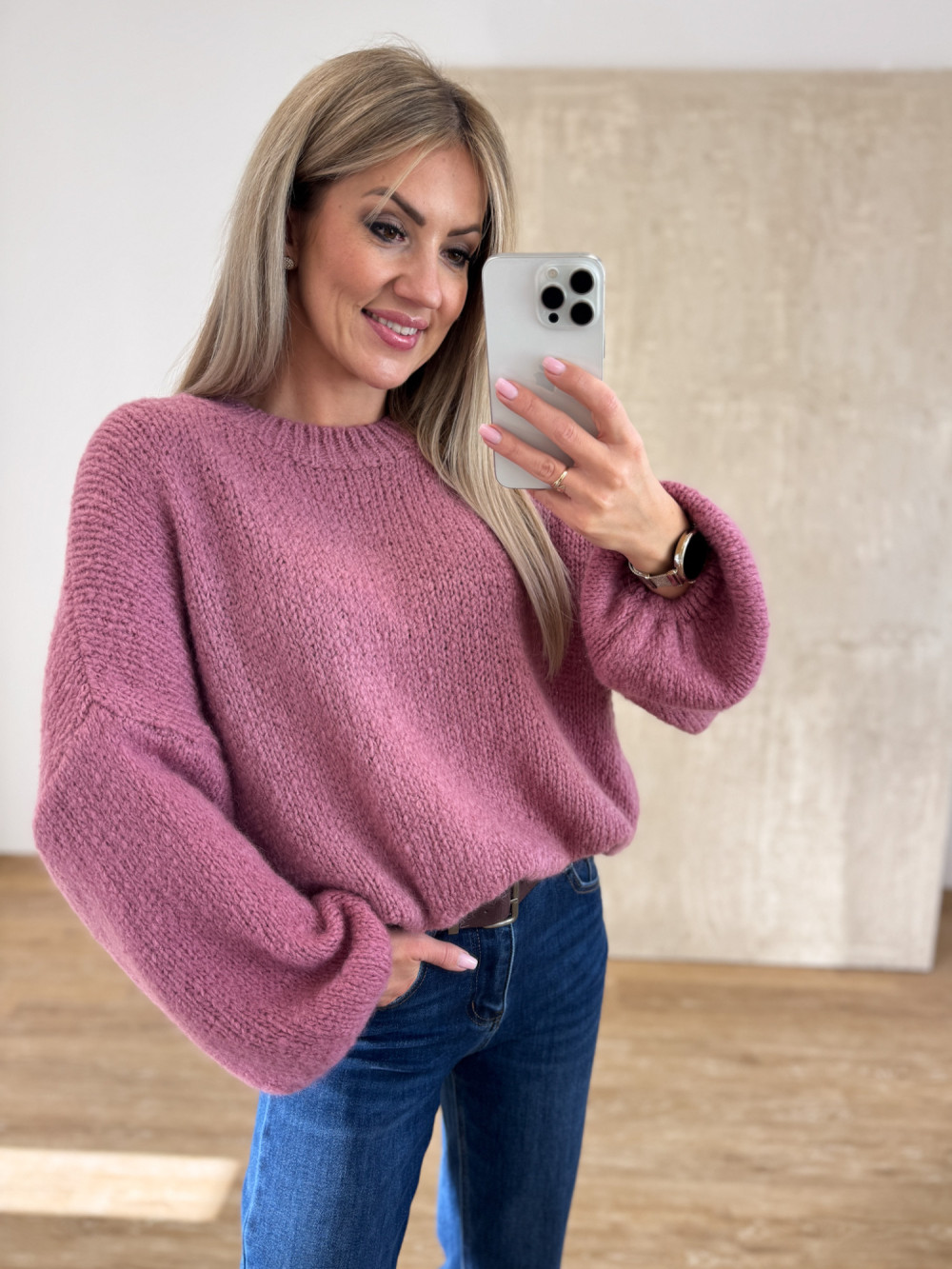 Dół swetra i rękawy zakończone gumką wszytą w rulon, dzięki czemu sweter pięknie układa się na sylwetce i zachowuje fason podczas noszenia.