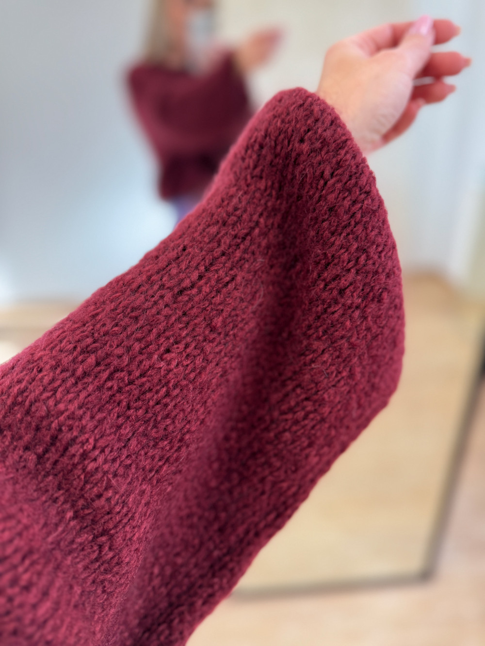 Dół swetra i rękawy zakończone gumką wszytą w rulon, dzięki czemu sweter pięknie układa się na sylwetce i zachowuje fason podczas noszenia.