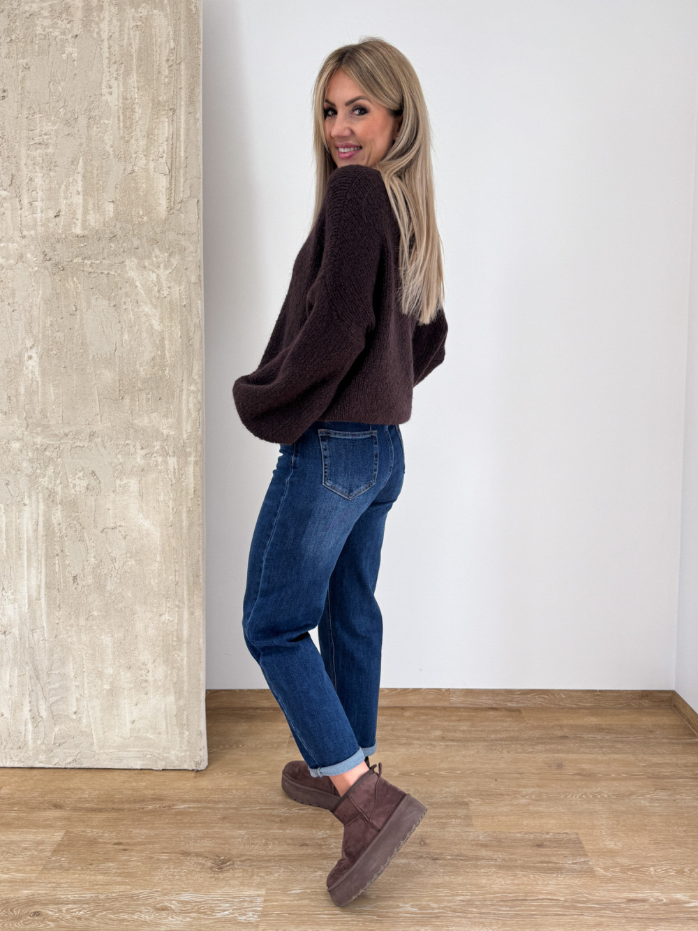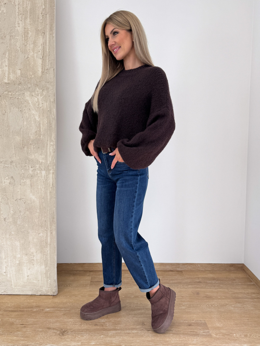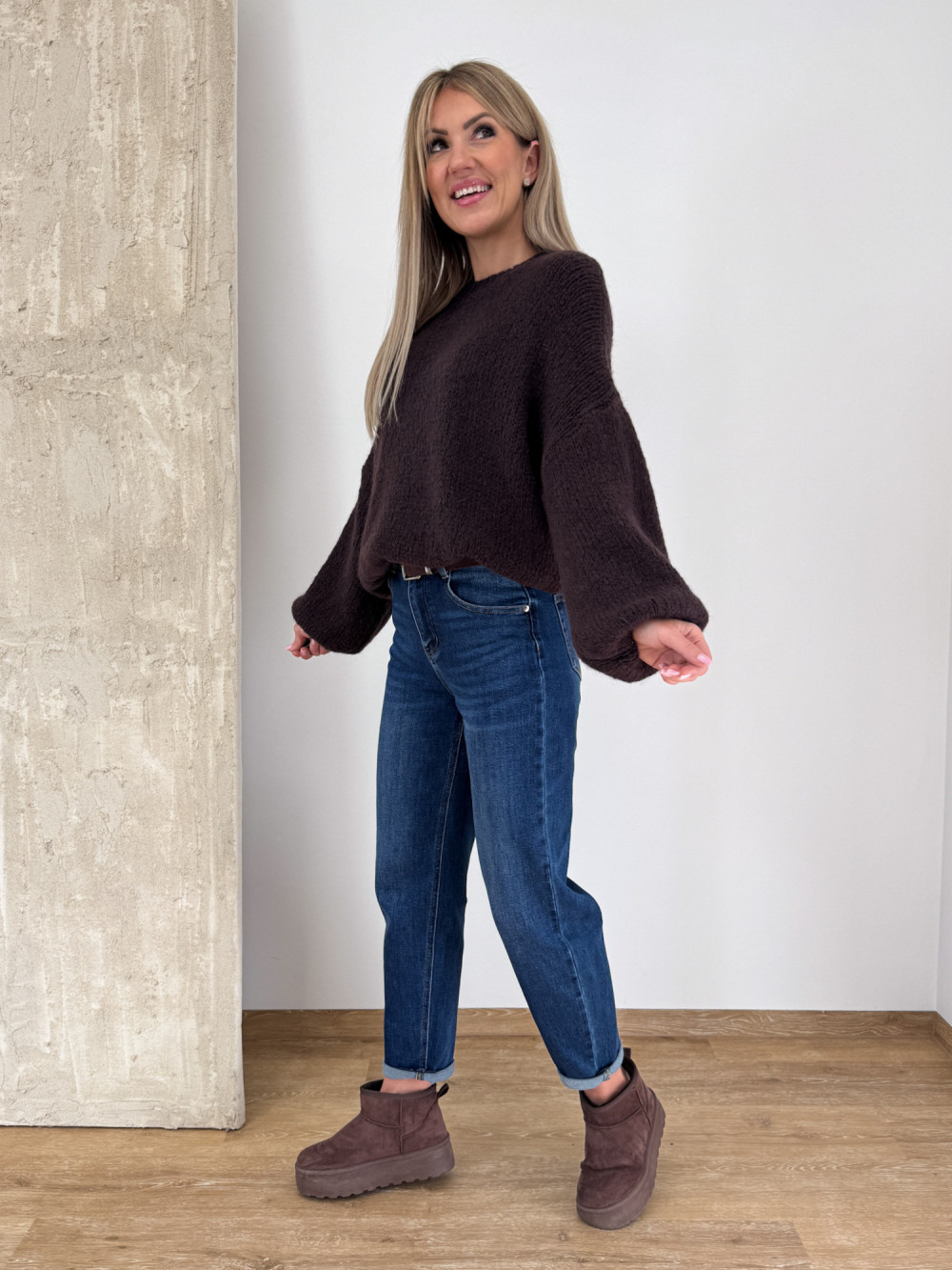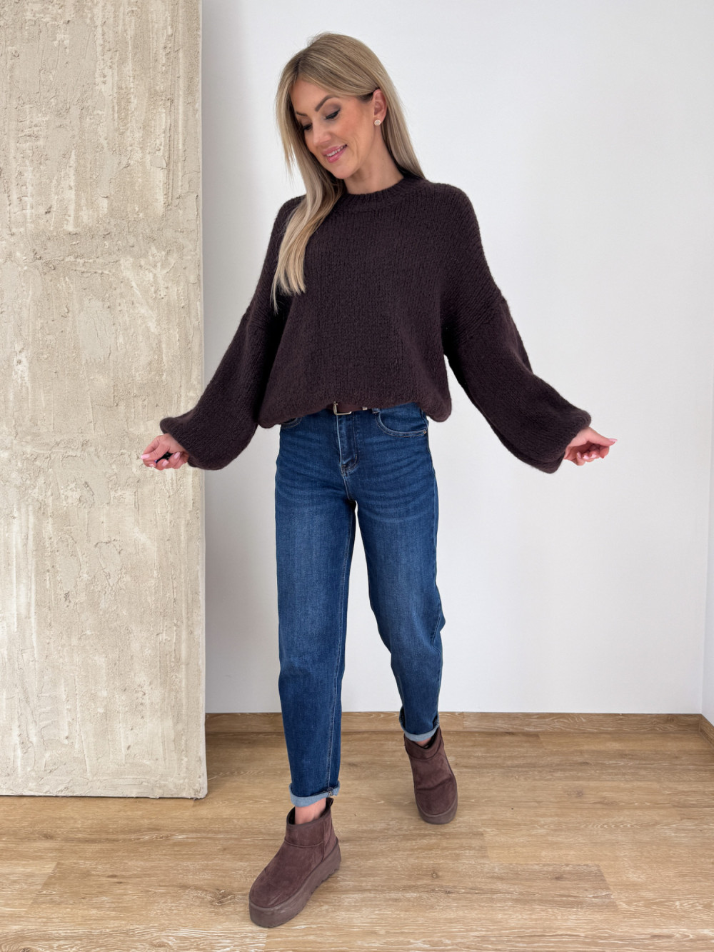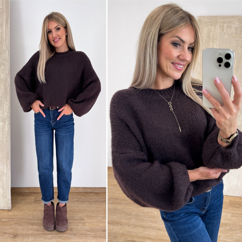 Dół swetra i rękawy zakończone gumką wszytą w rulon, dzięki czemu sweter pięknie układa się na sylwetce i zachowuje fason podczas noszenia.