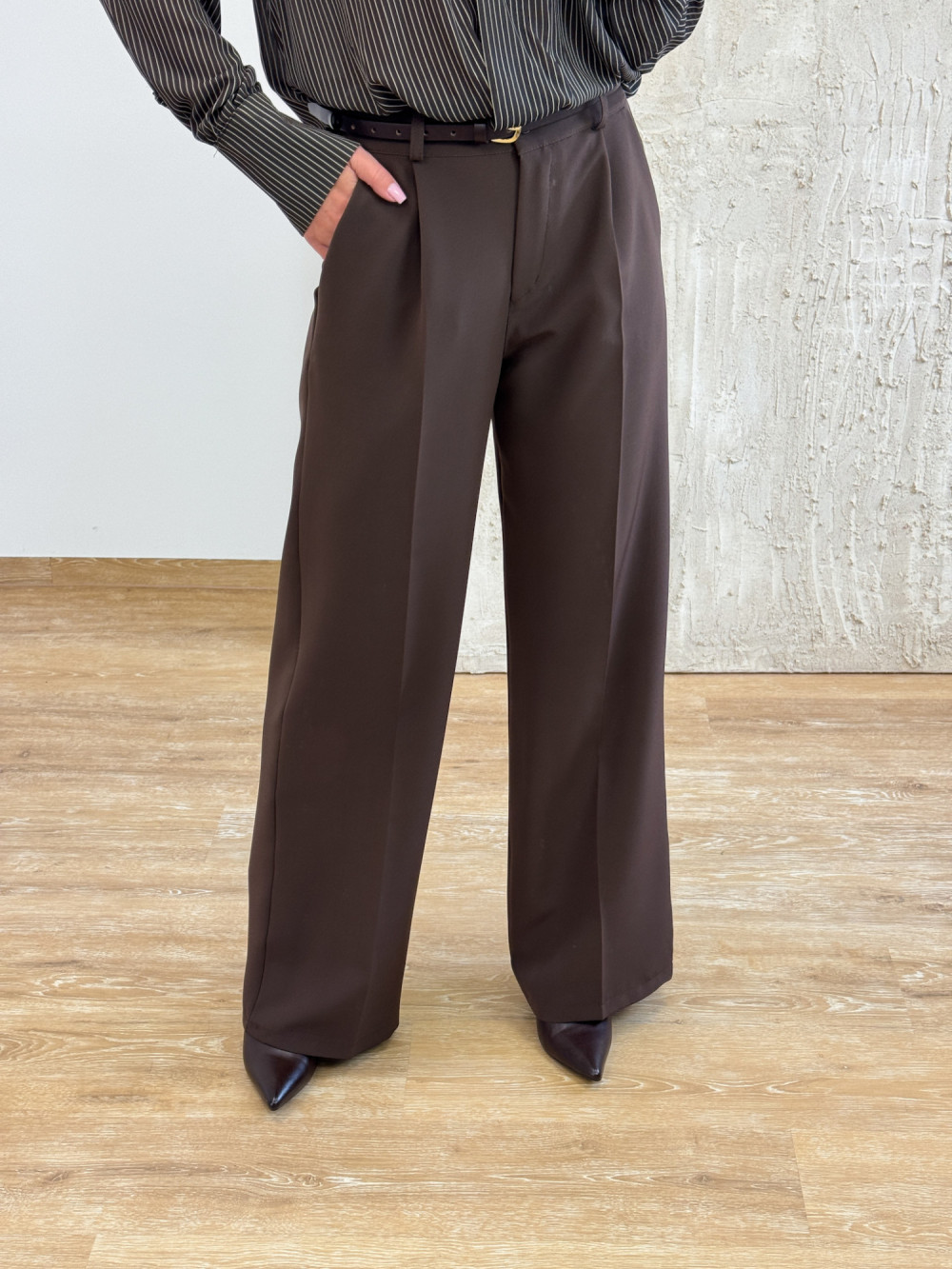 Eleganckie brązowe spodnie materiałowe o kroju szwedów. Długie, z kantem na nogawkach, który optycznie wysmukla sylwetkę.