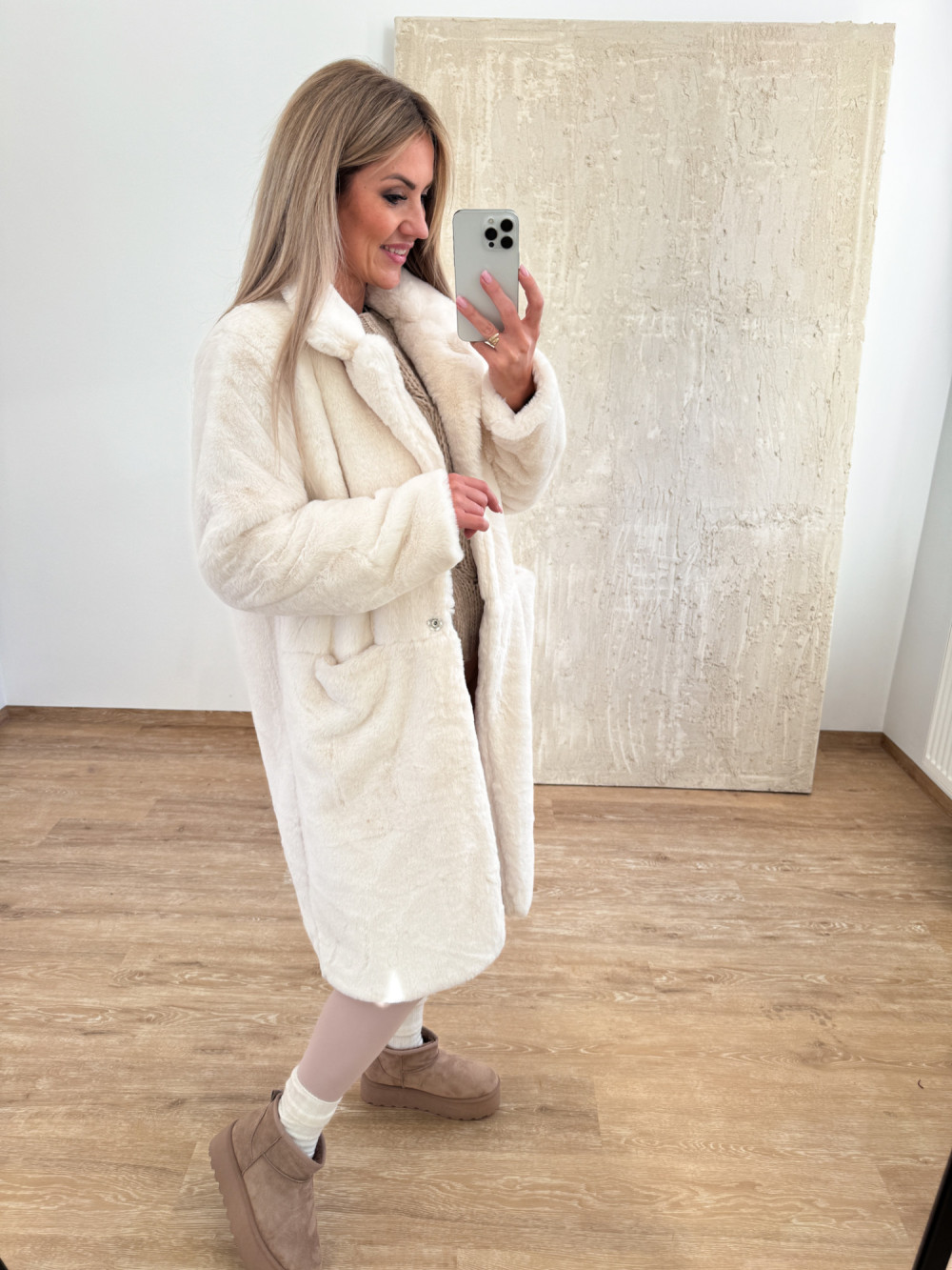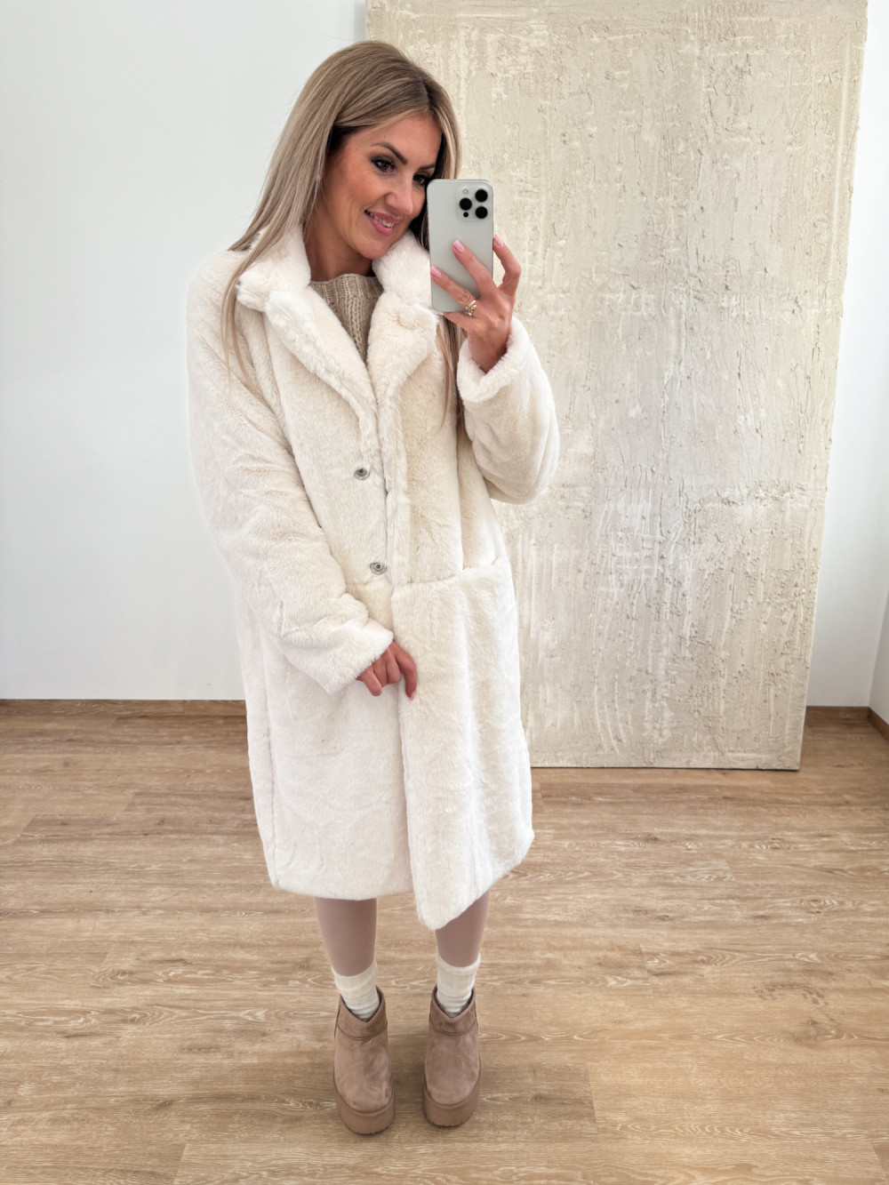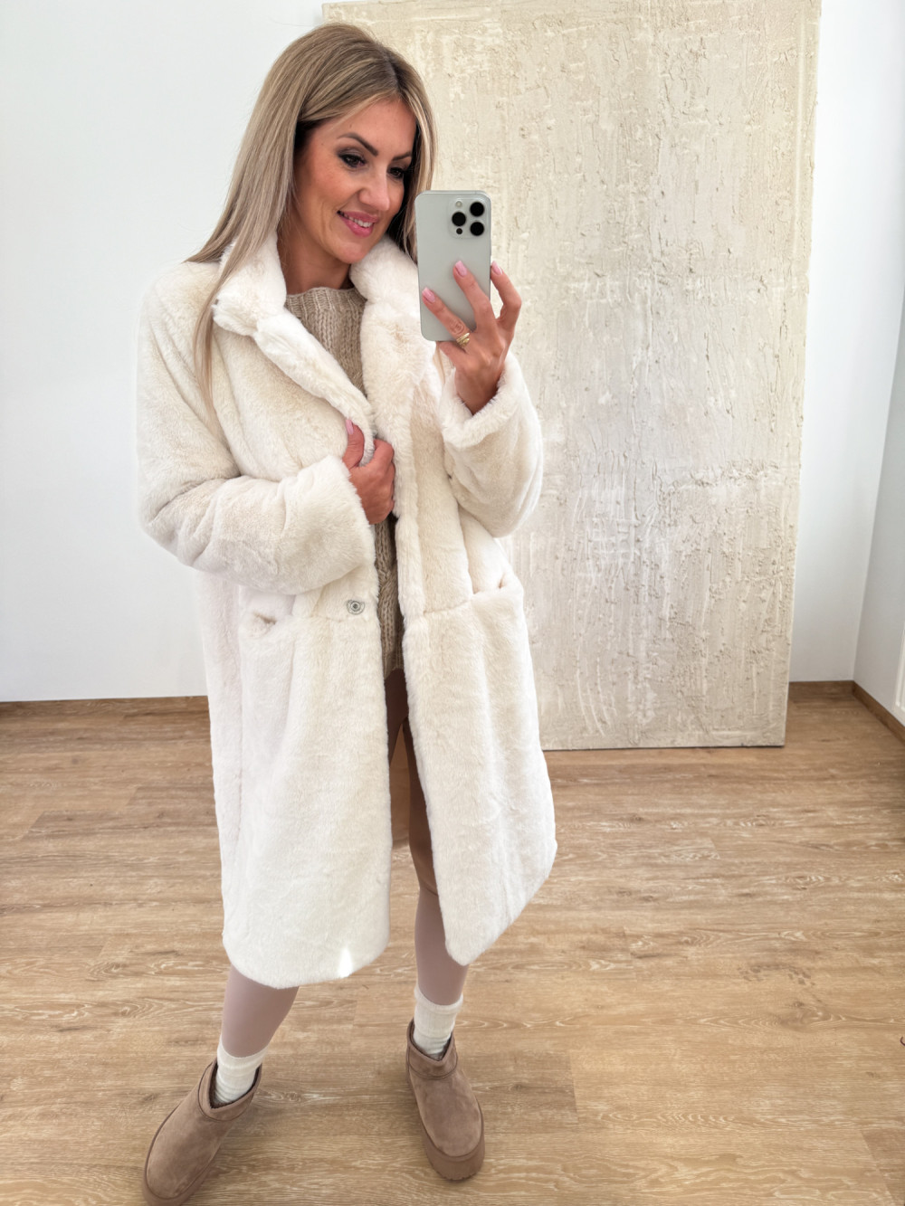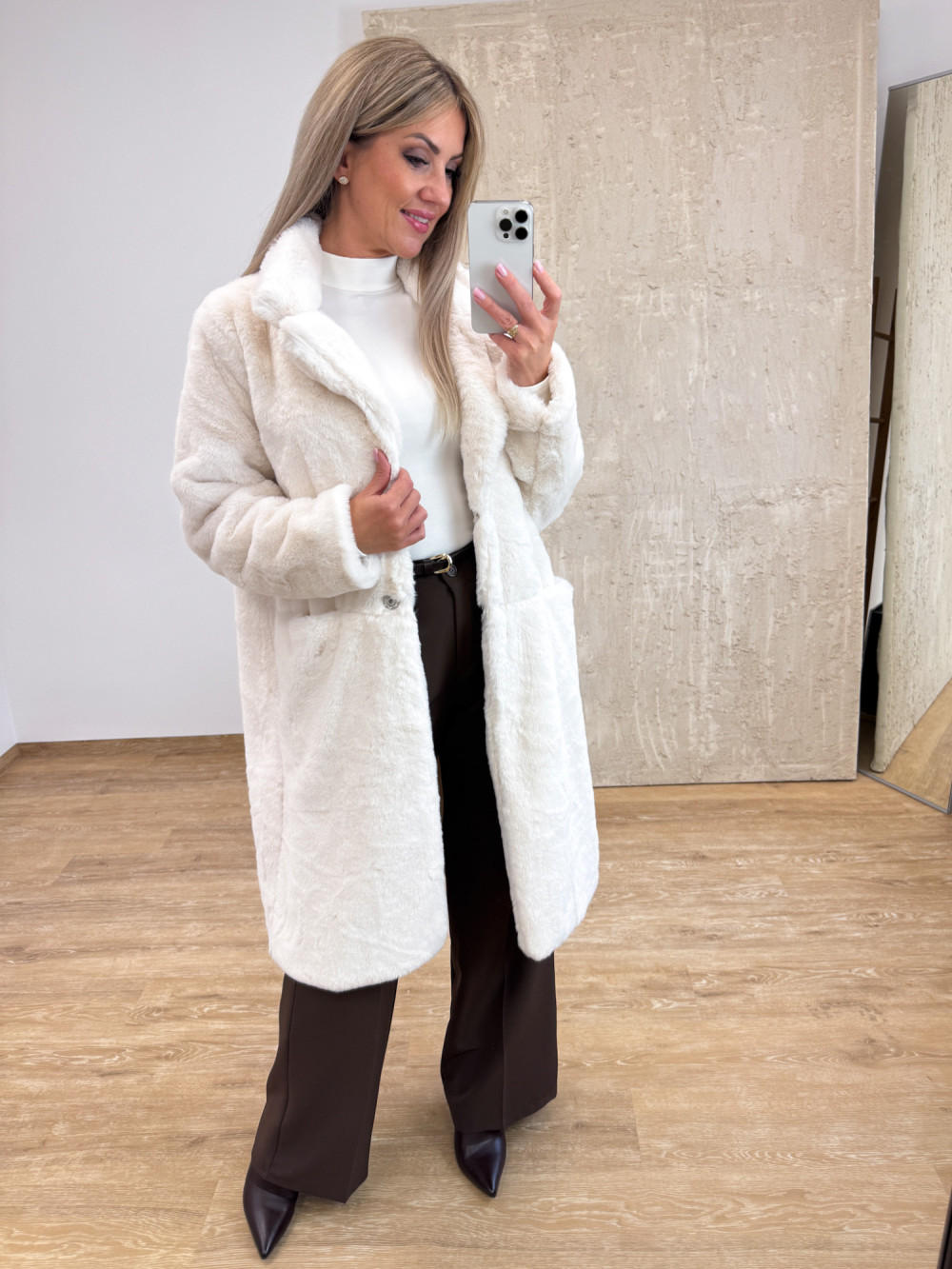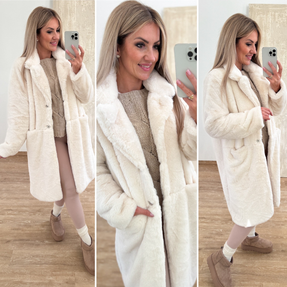Stylowy płaszczyk z miękkiego, puszystego futerka o długości za kolano.