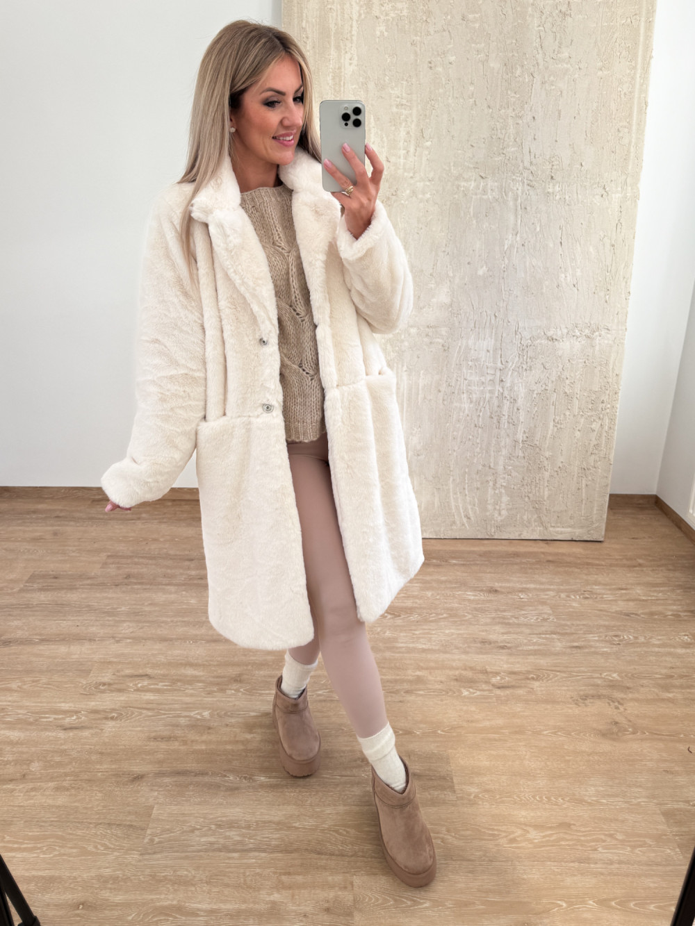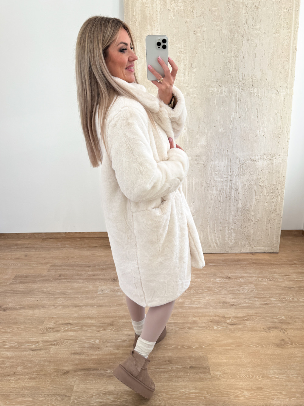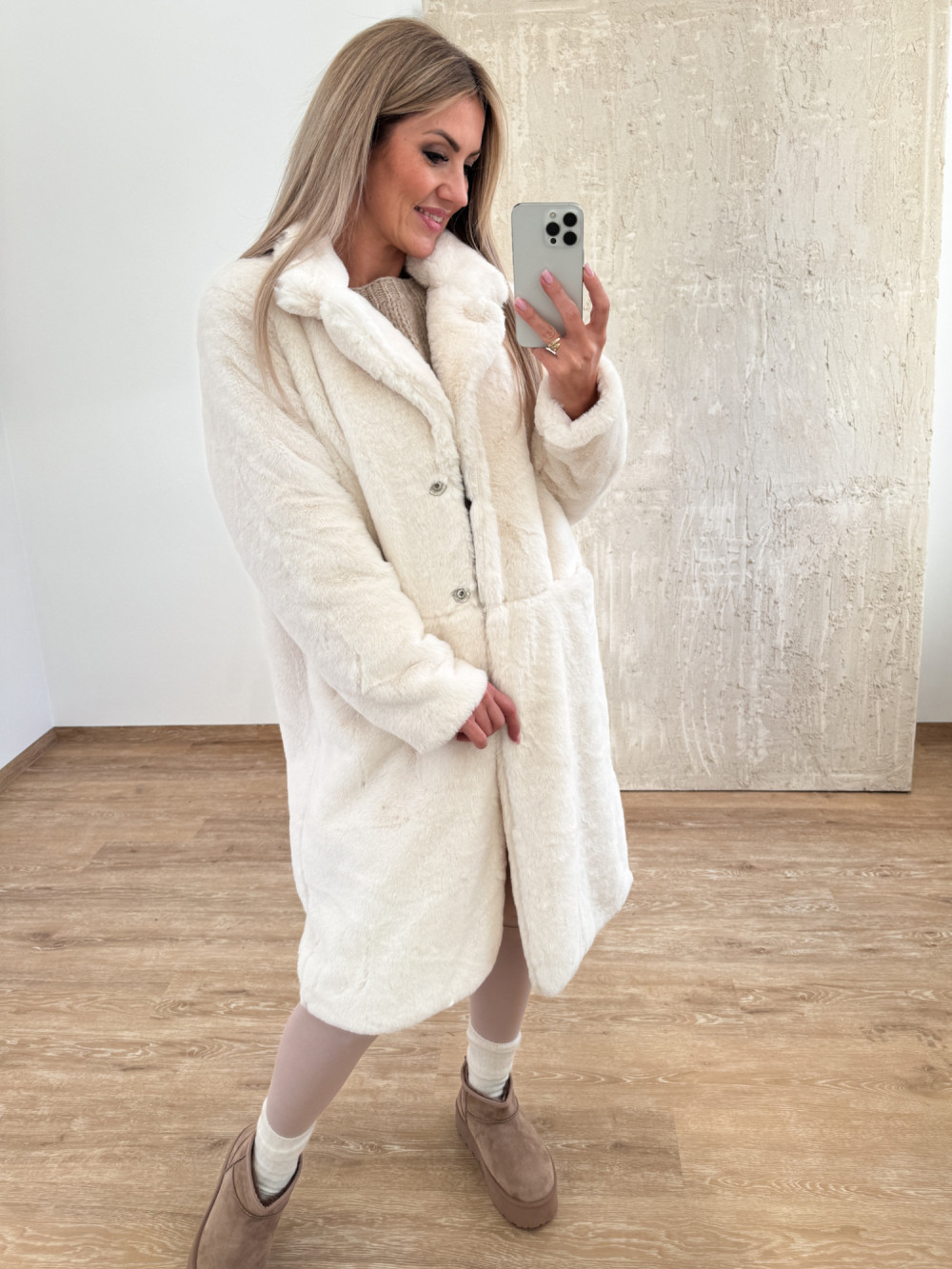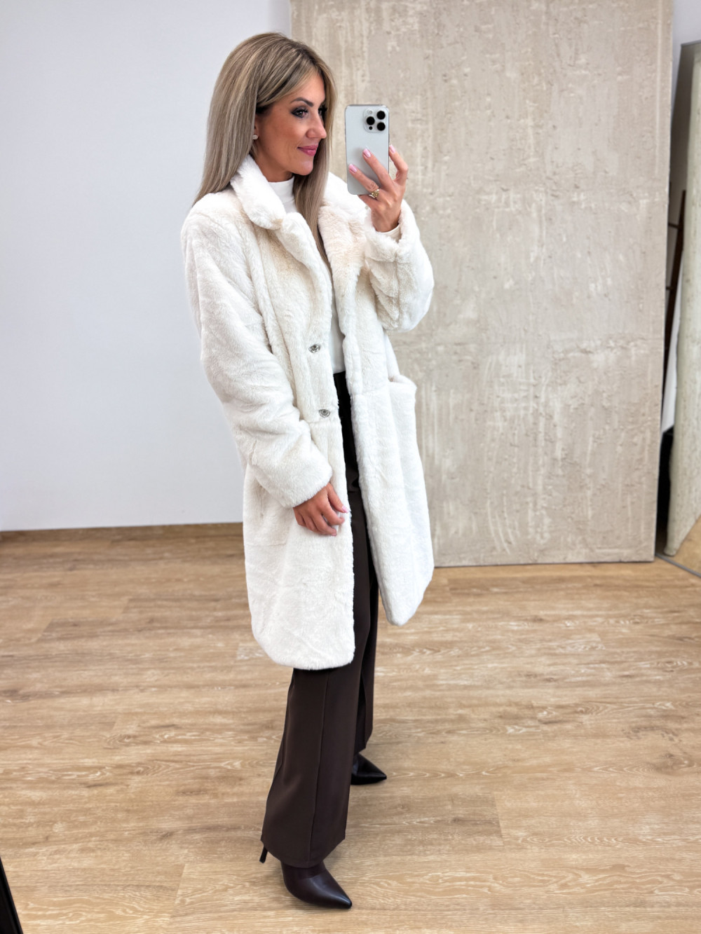 Stylowy płaszczyk z miękkiego, puszystego futerka o długości za kolano.