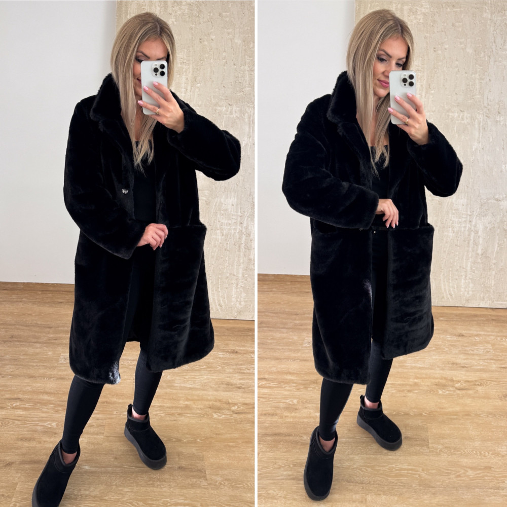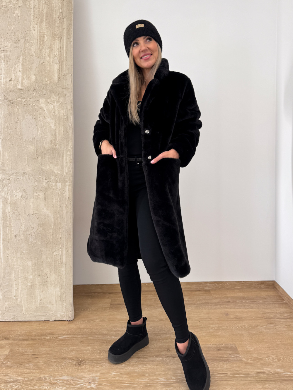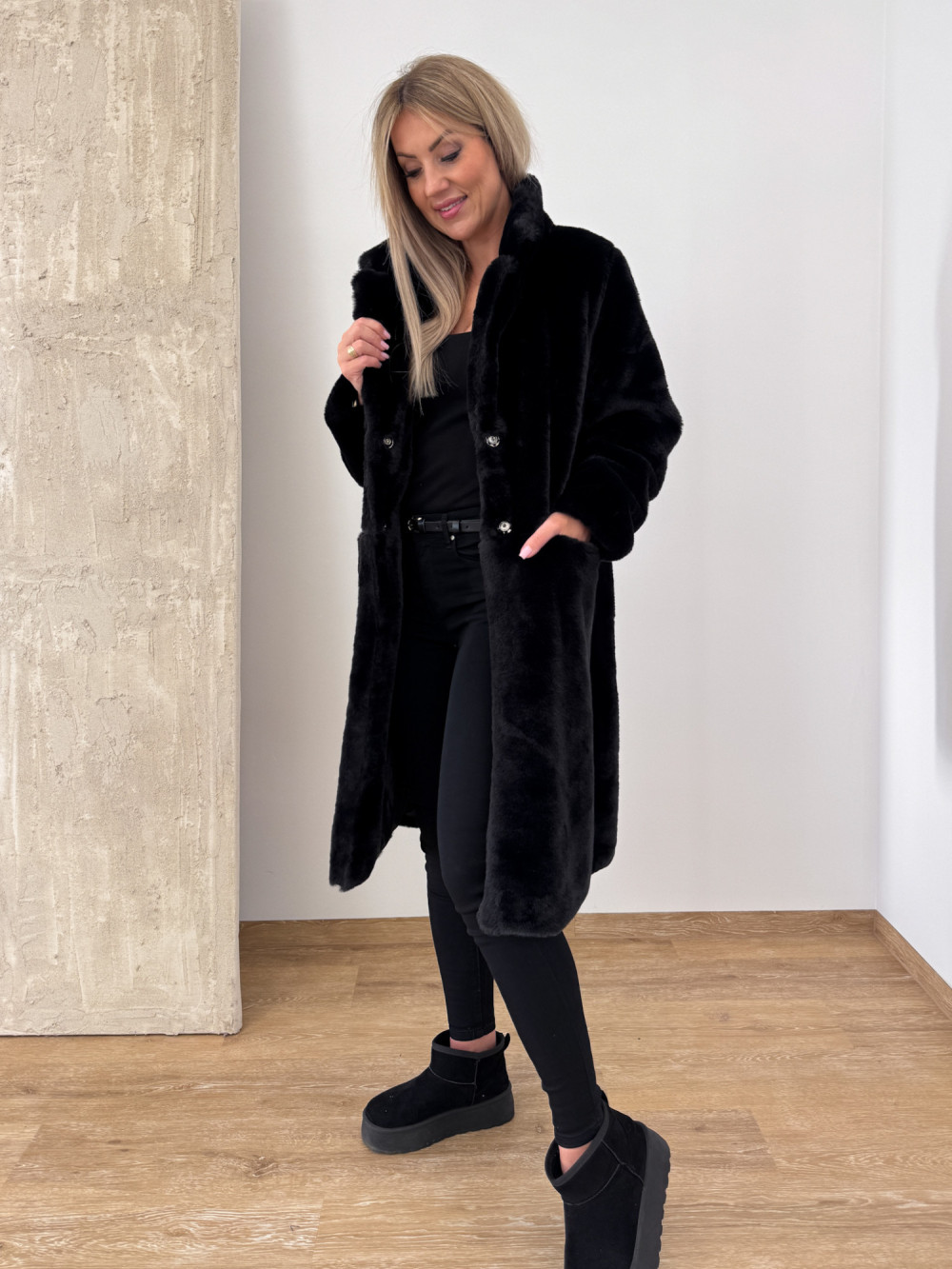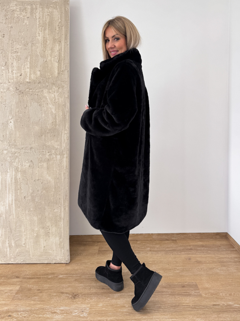Stylowy płaszczyk z miękkiego, puszystego futerka o długości za kolano.