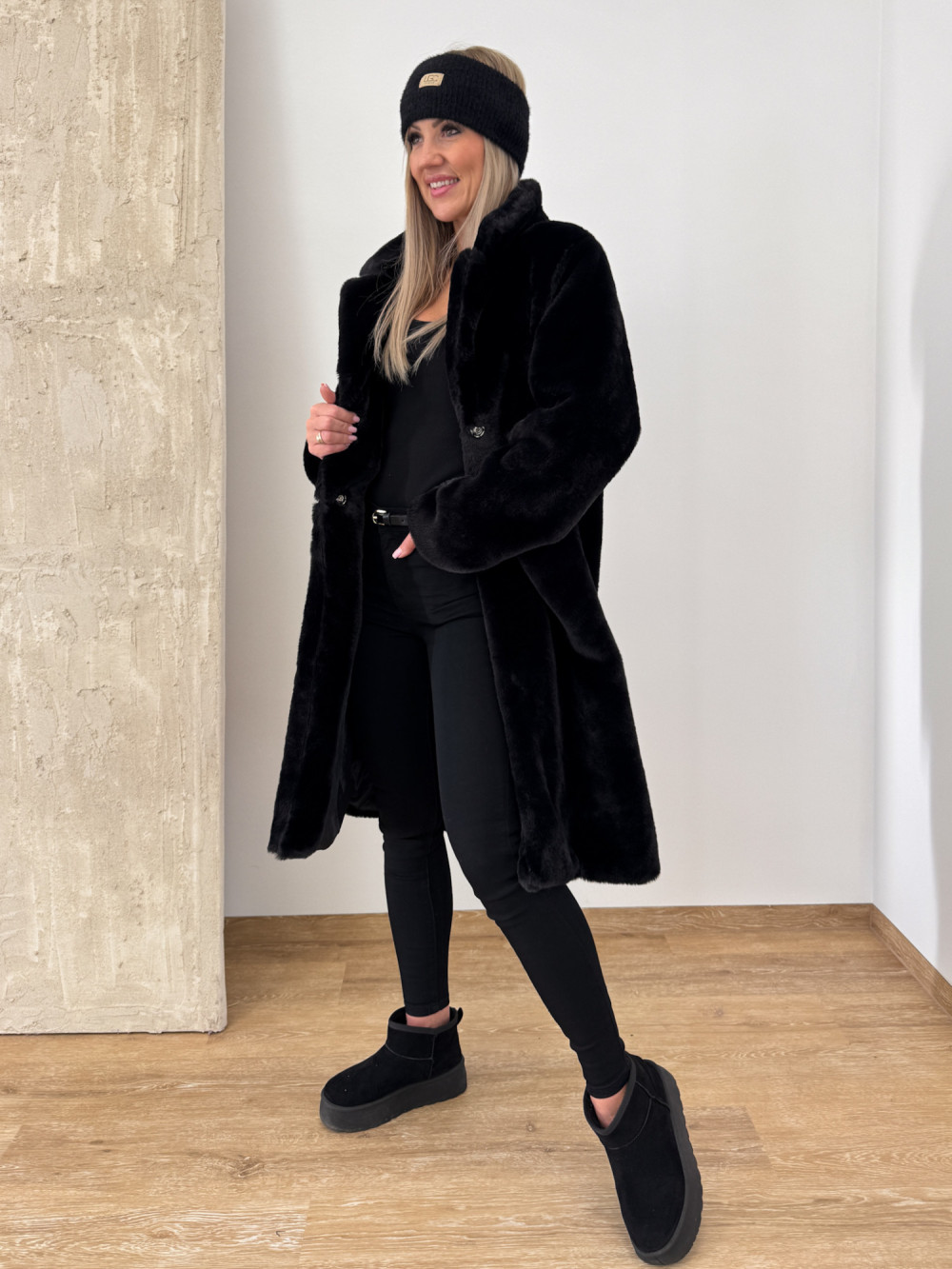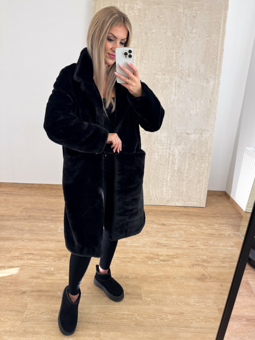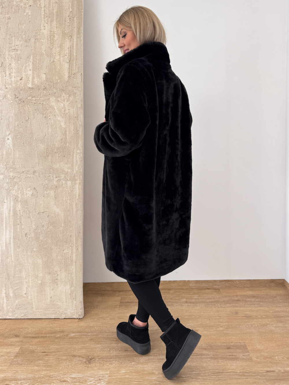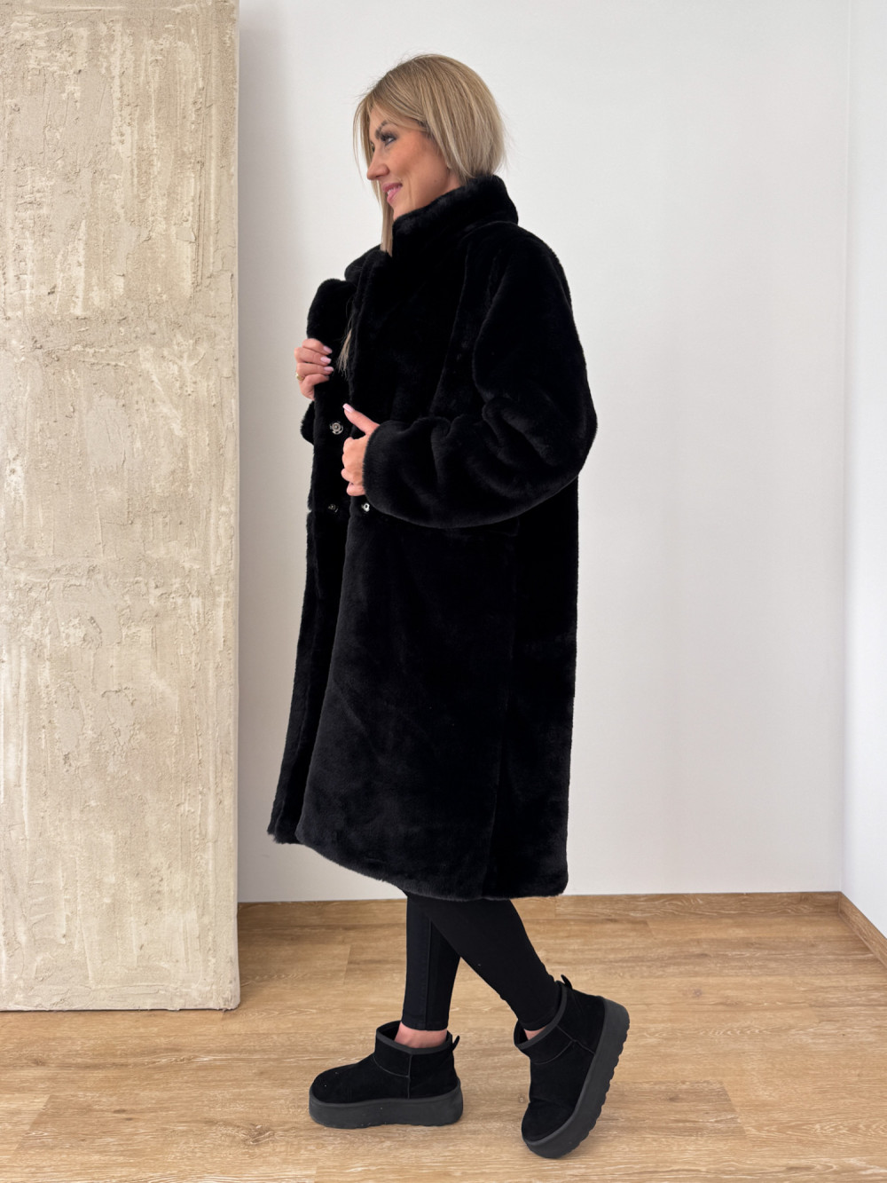 Stylowy płaszczyk z miękkiego, puszystego futerka o długości za kolano.