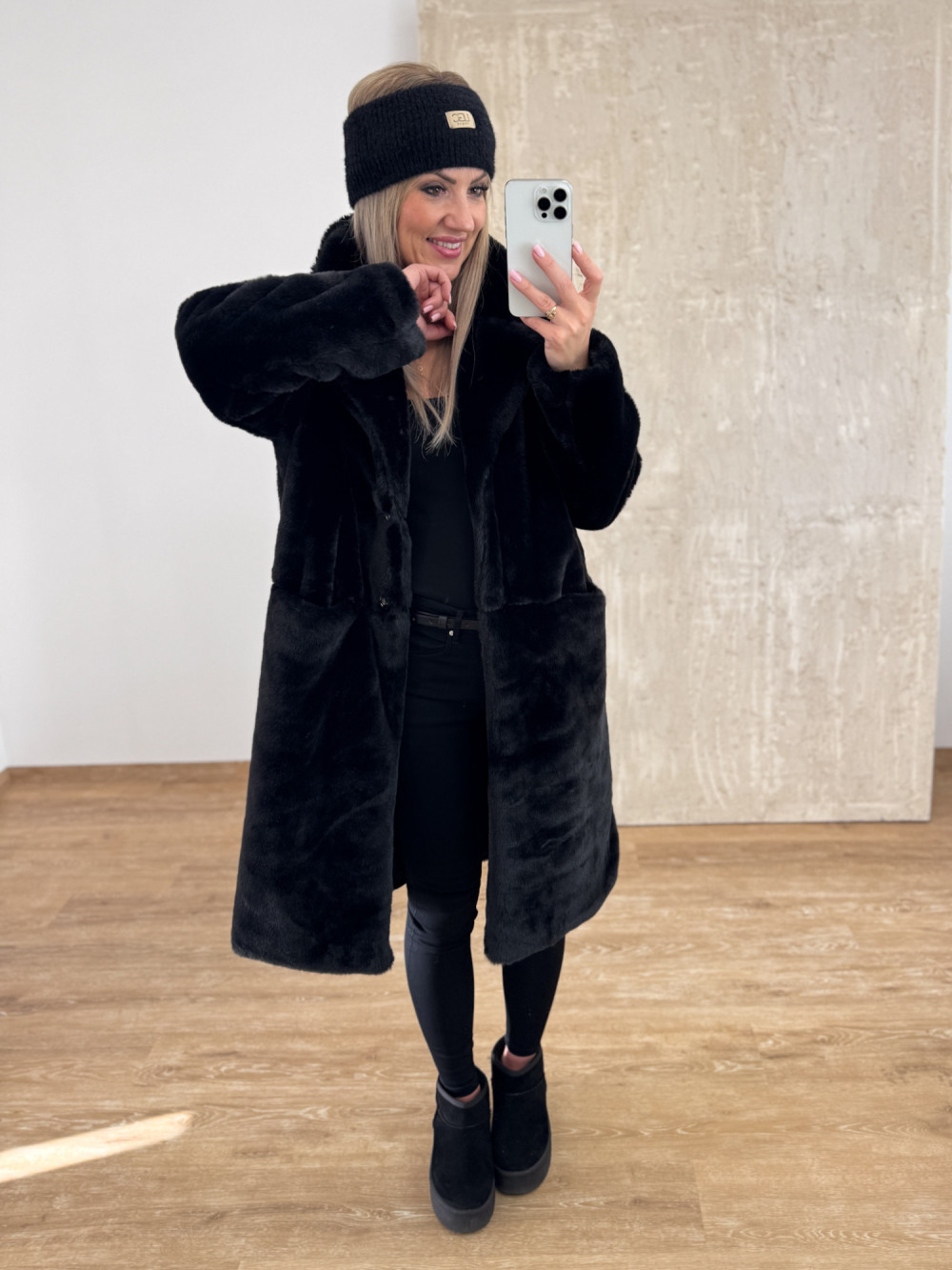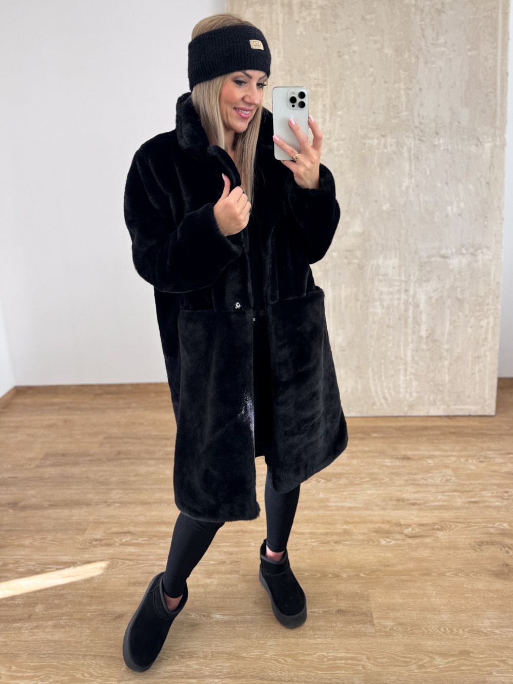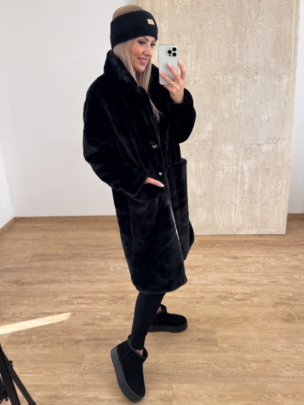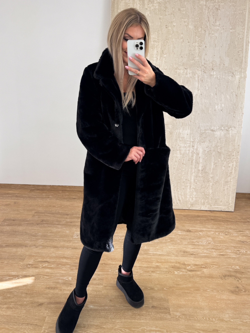 Stylowy płaszczyk z miękkiego, puszystego futerka o długości za kolano.