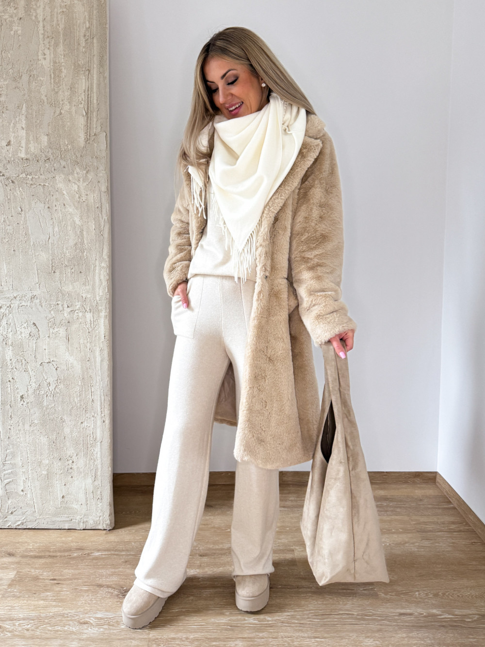 Stylowy płaszczyk z miękkiego, puszystego futerka o długości za kolano.