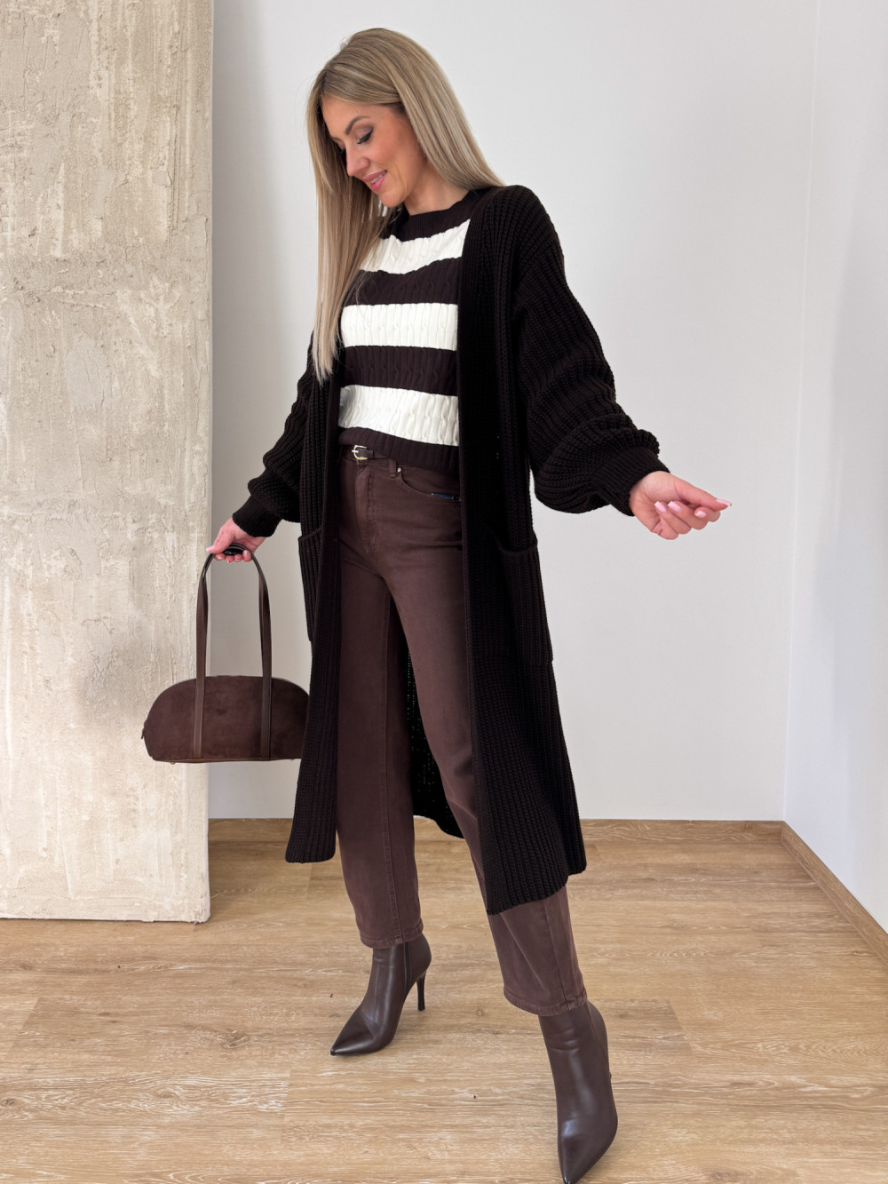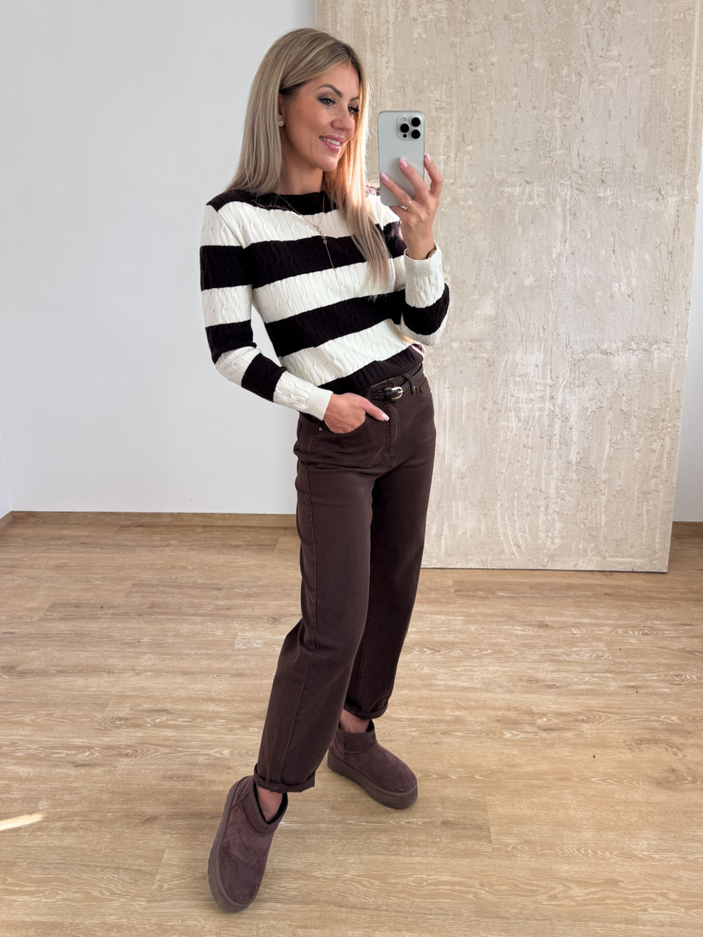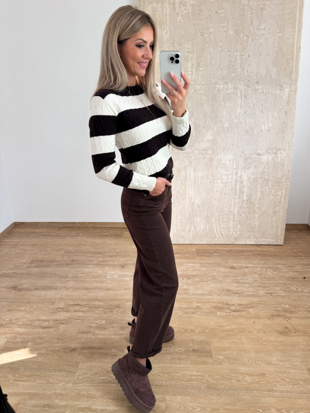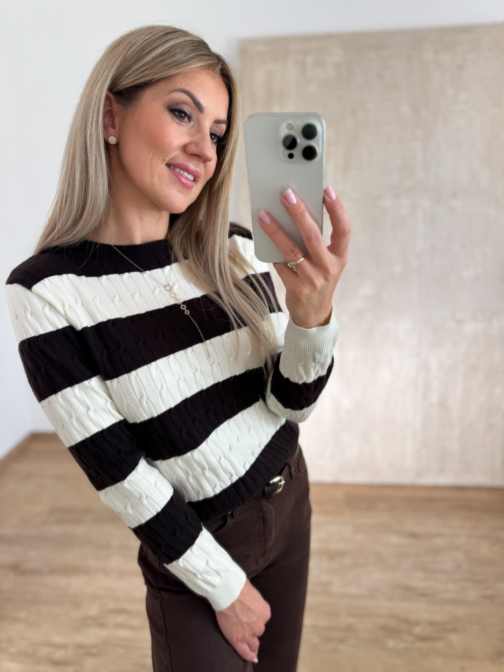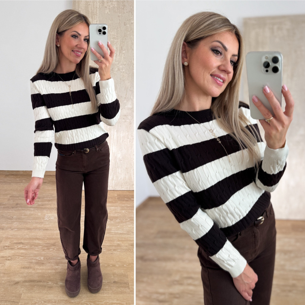 Miękki i stylowy sweter w szerokie czekoladowo–waniliowe pasy, który zachwyca ciepłą kolorystyką i przytulnym charakterem.