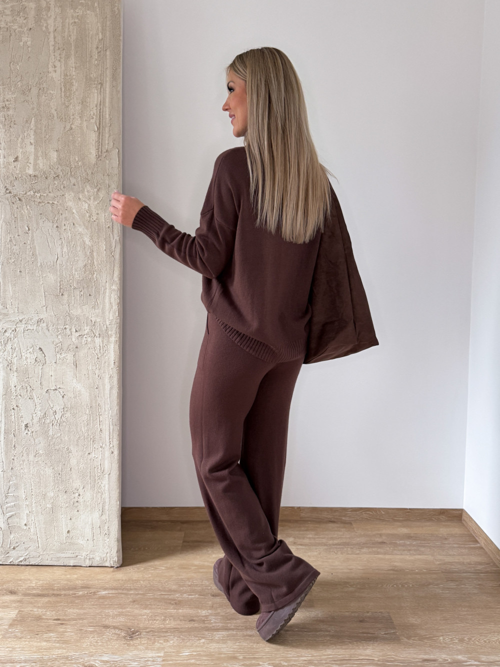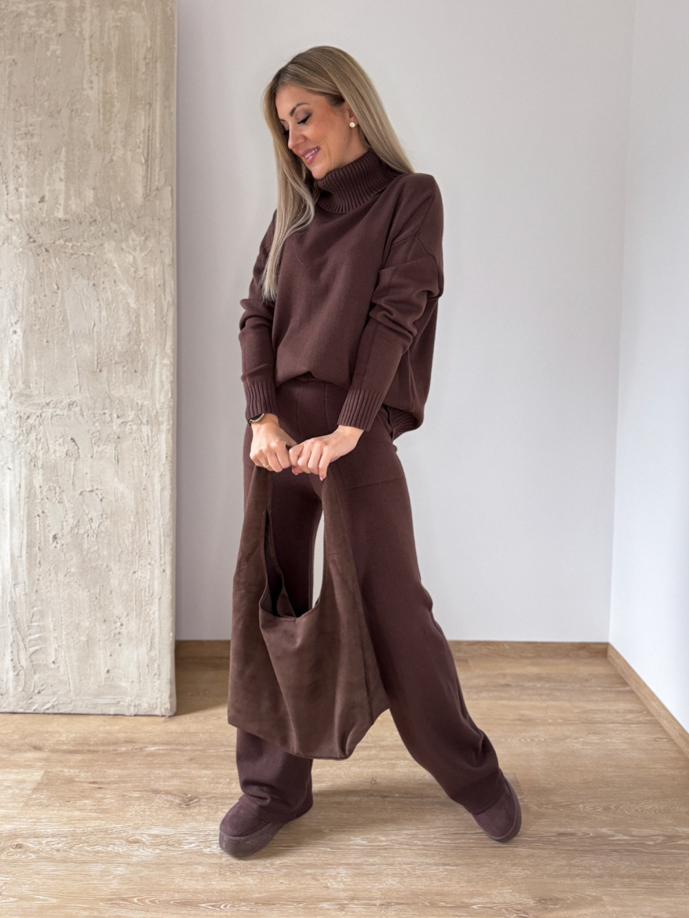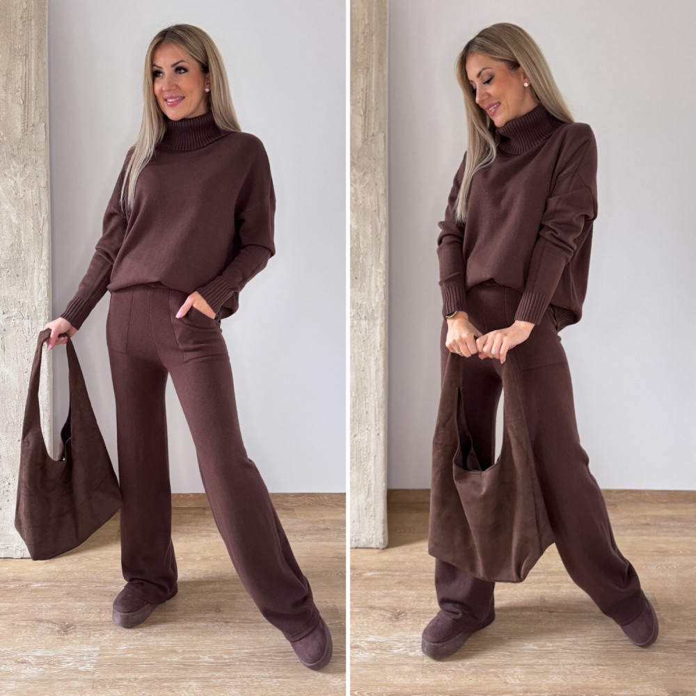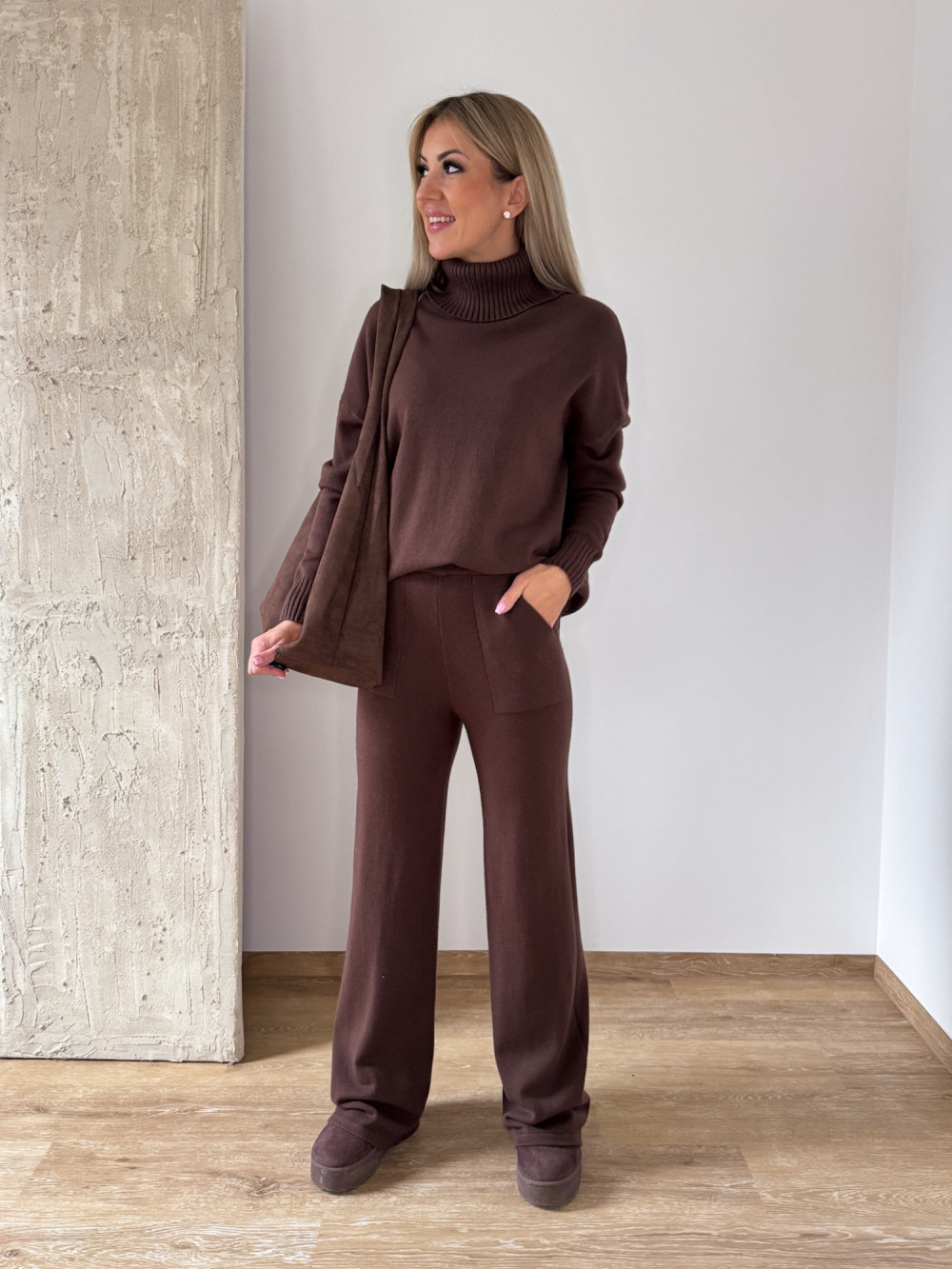 Komplet Sweterkowy Inez Spodnie i Sweter z Golfem - Czekoladowy