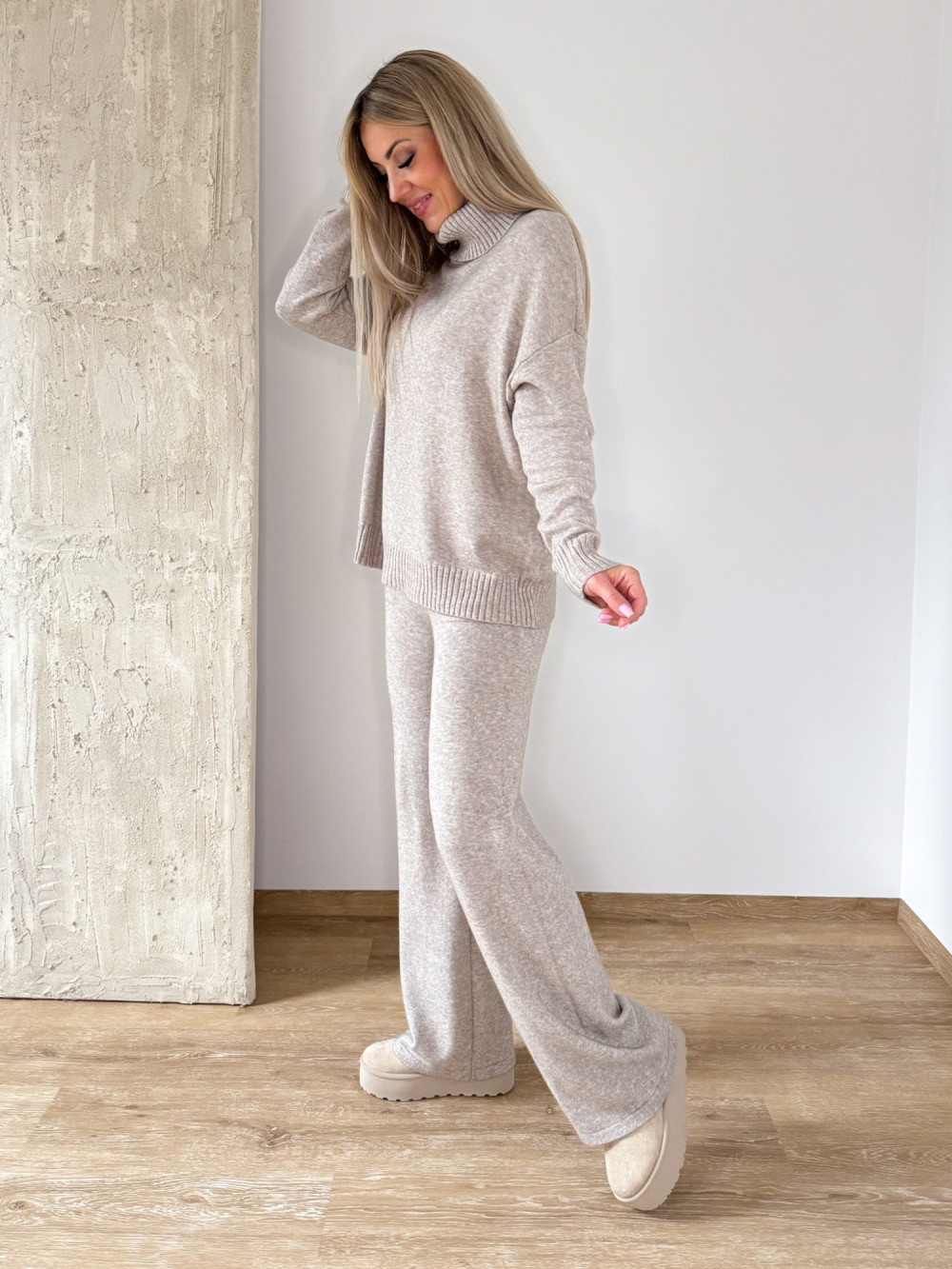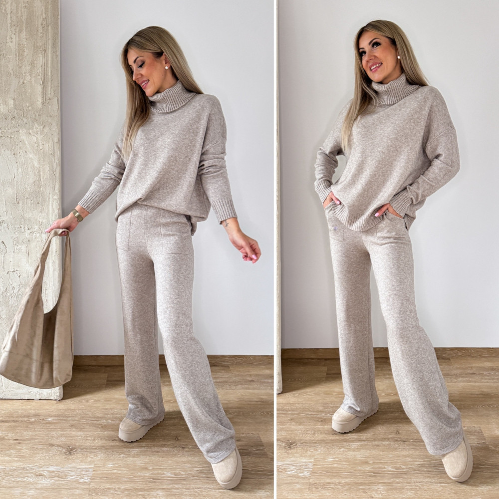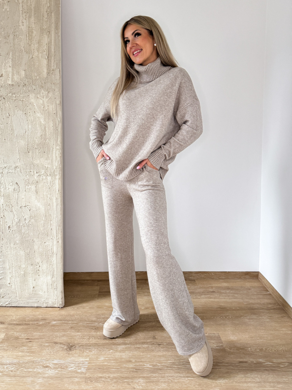 Stylowy komplet dzianinowy składający się z oversizowej góry z luźnym golfem oraz długich, swobodnych spodni na szerokiej gumce w pasie.
