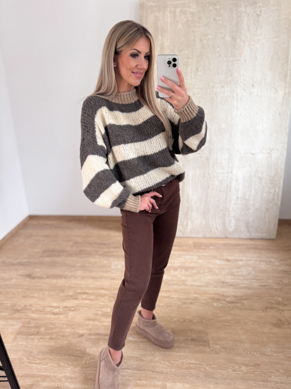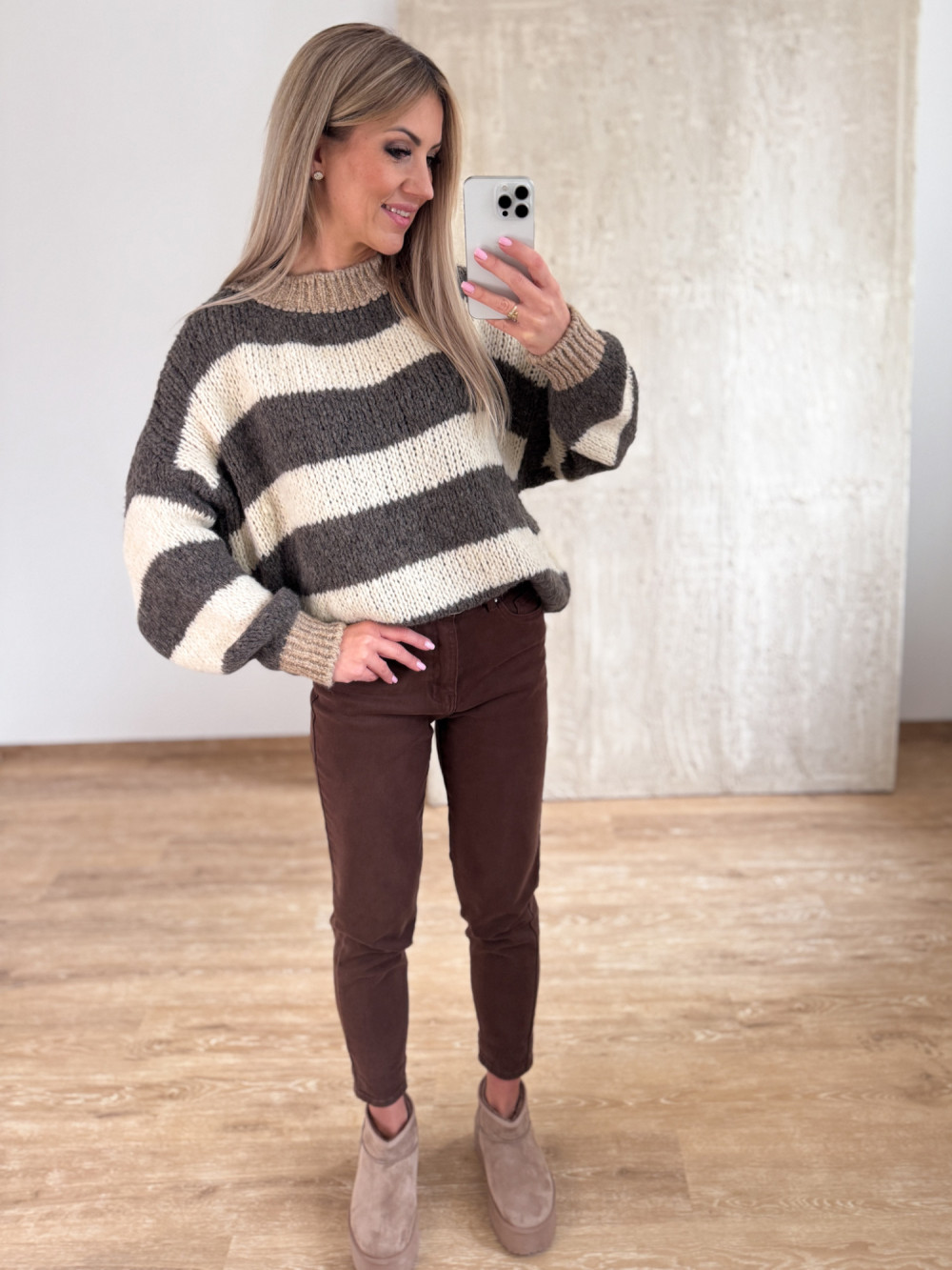 Stylowy sweter w szerokie pasy w odcieniach wanili i fango – idealne połączenie na chłodniejsze dni.