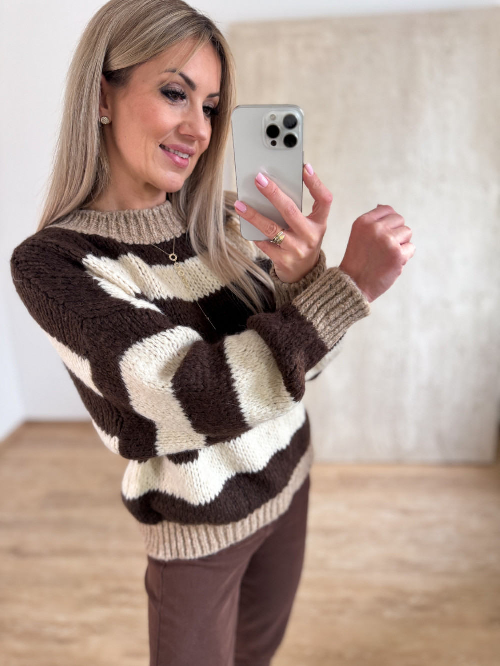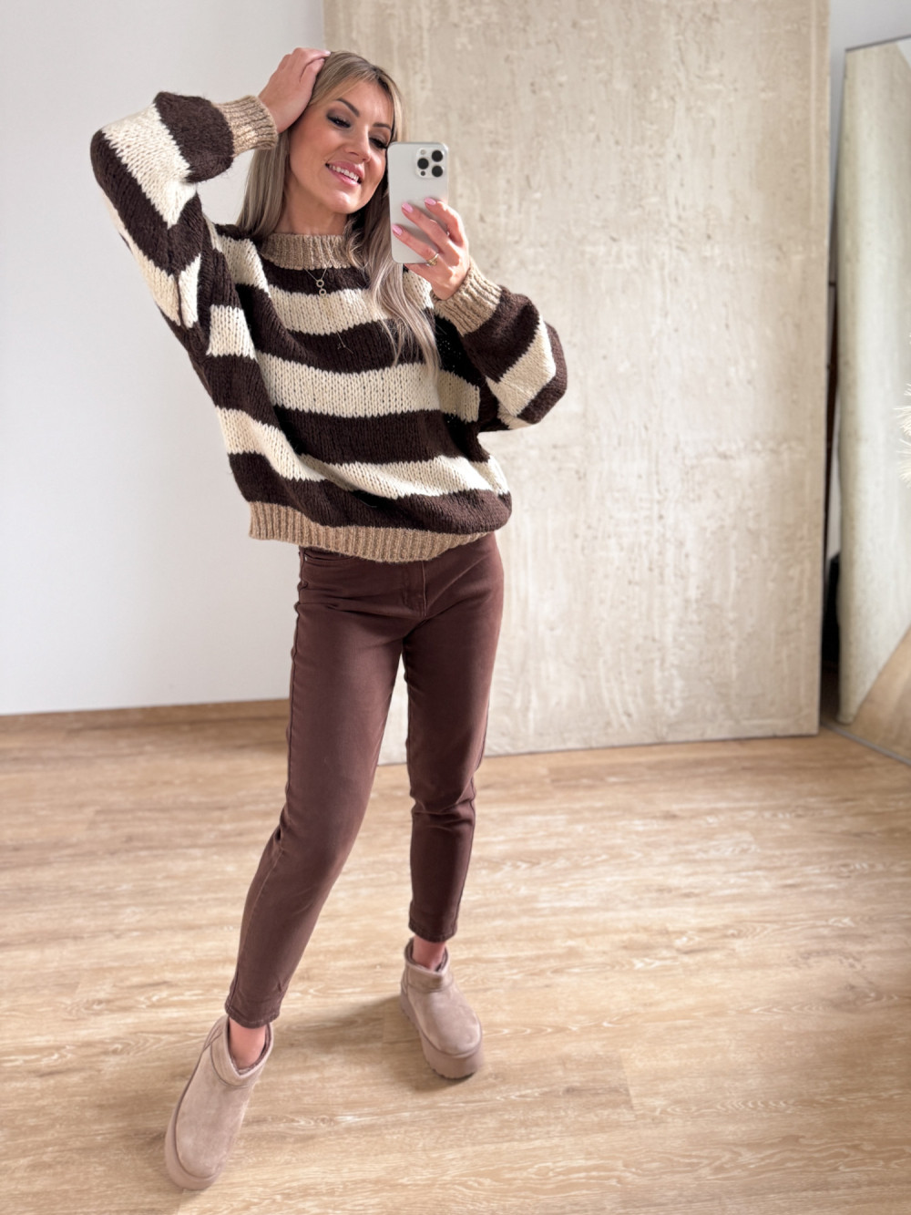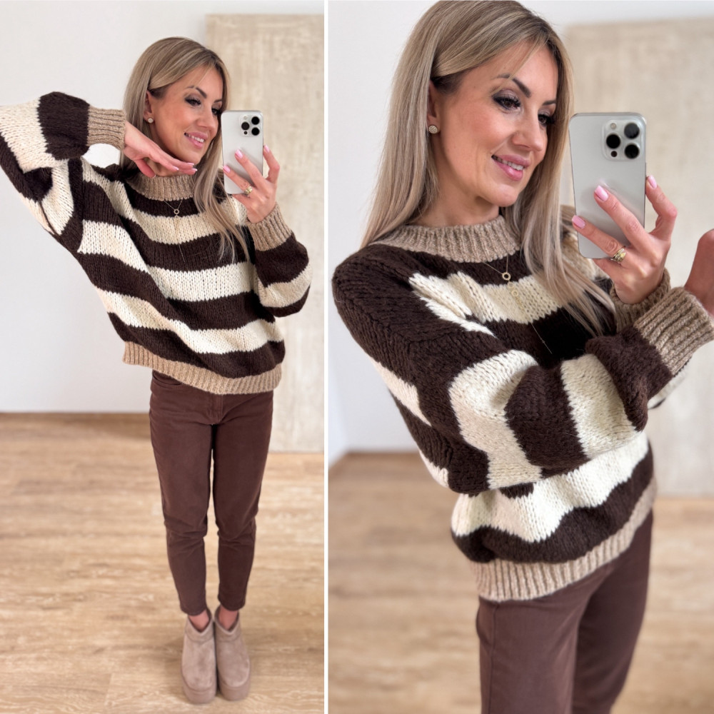 Stylowy sweter w szerokie pasy w odcieniach wanili i czekolady – idealne połączenie na chłodniejsze dni.