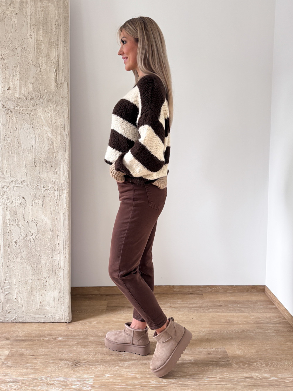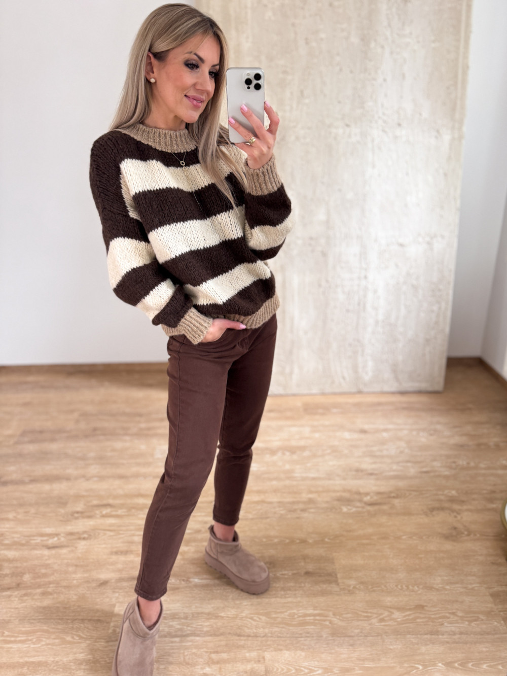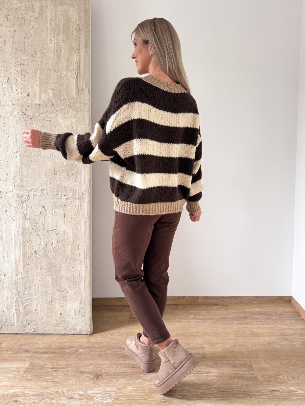 Stylowy sweter w szerokie pasy w odcieniach wanili i czekolady – idealne połączenie na chłodniejsze dni.