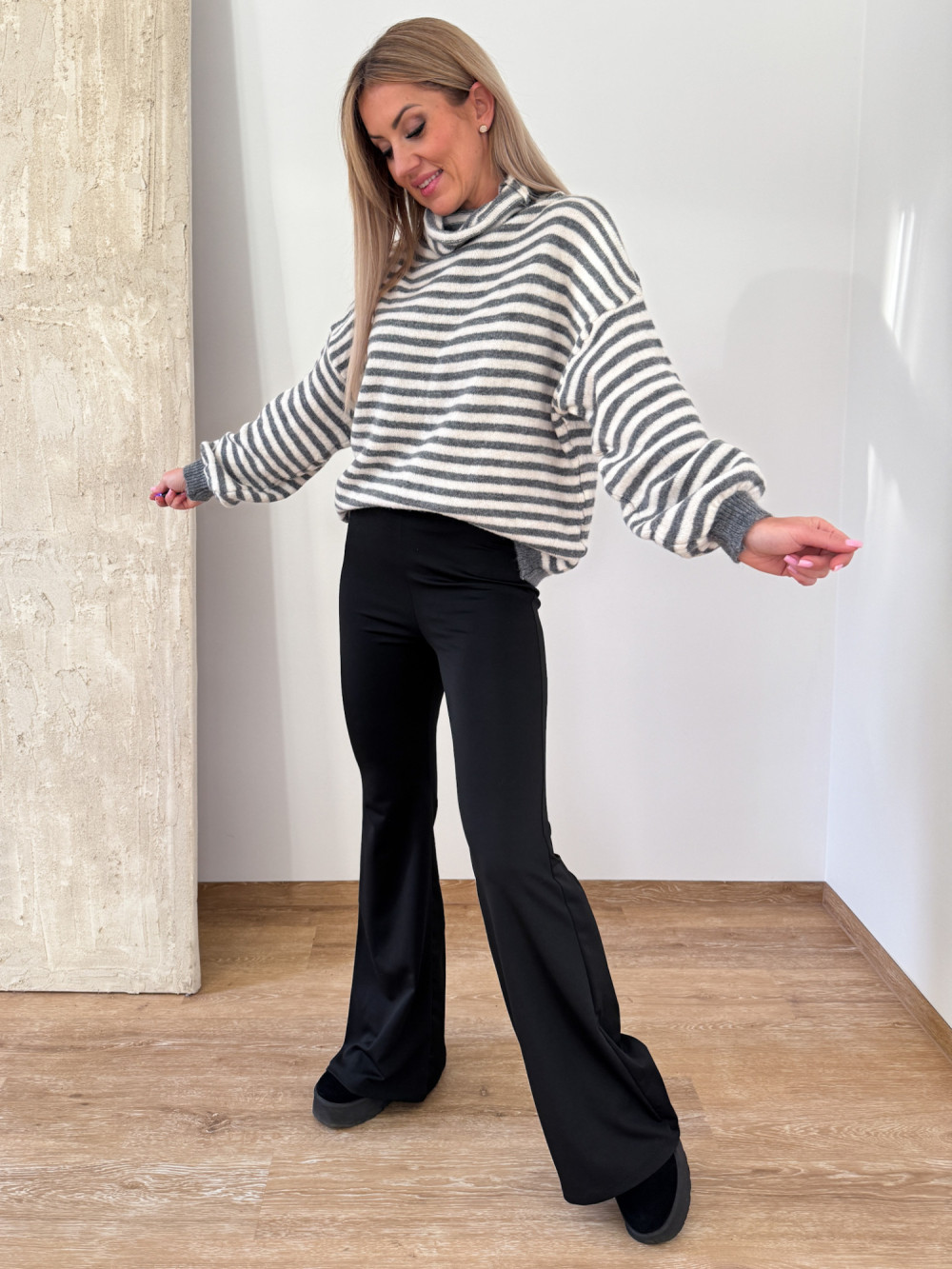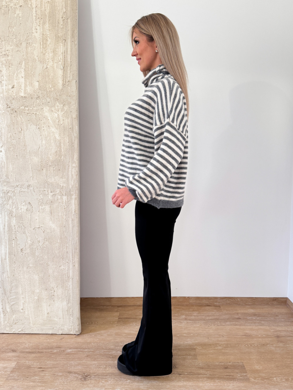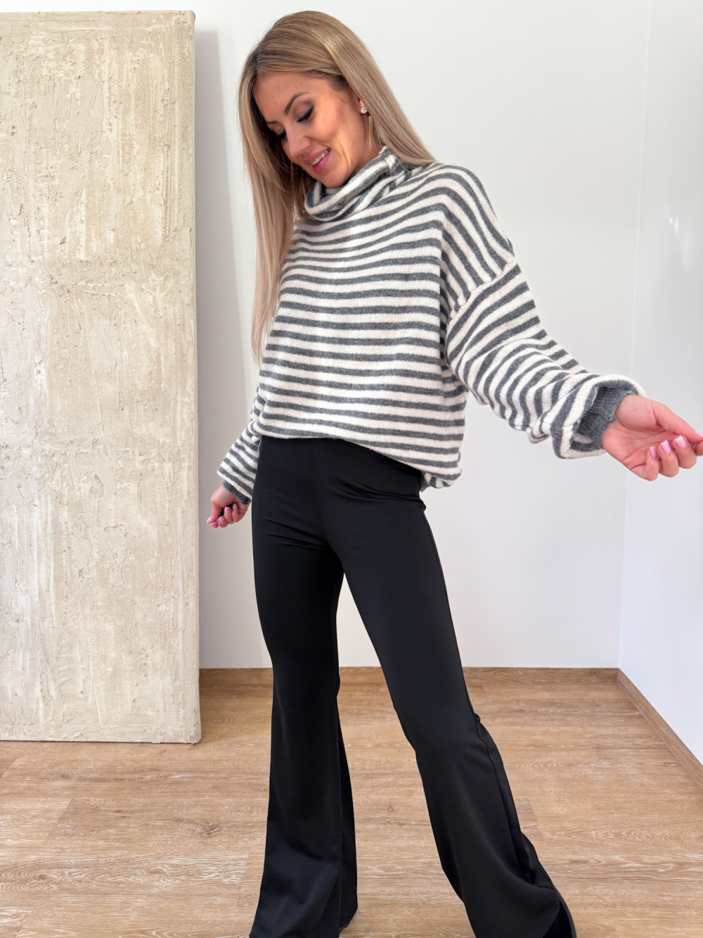 Przytulny oversizowy golf swetrowy w cienkie paseczki w odcieniach śmietanki i szarości.