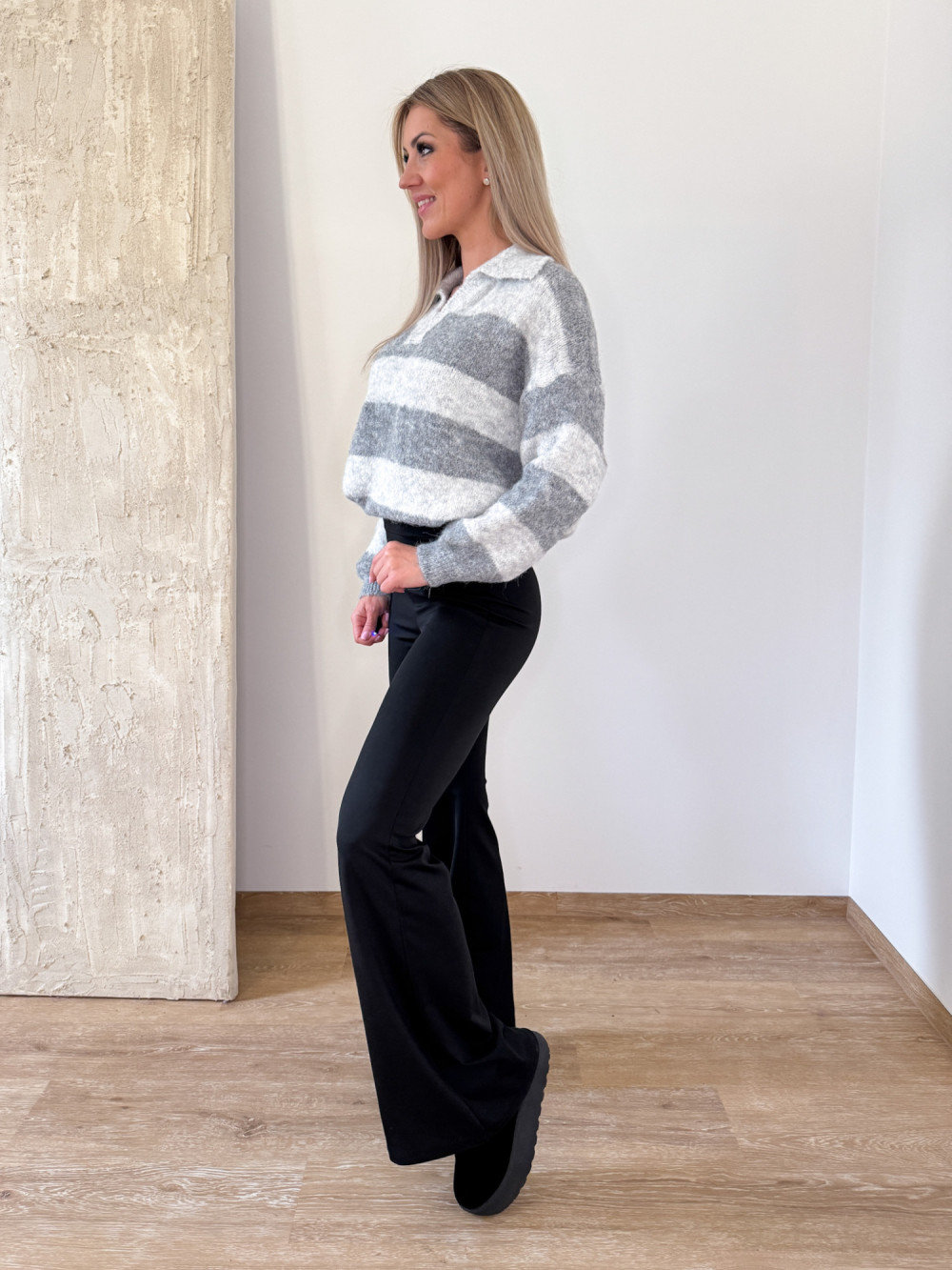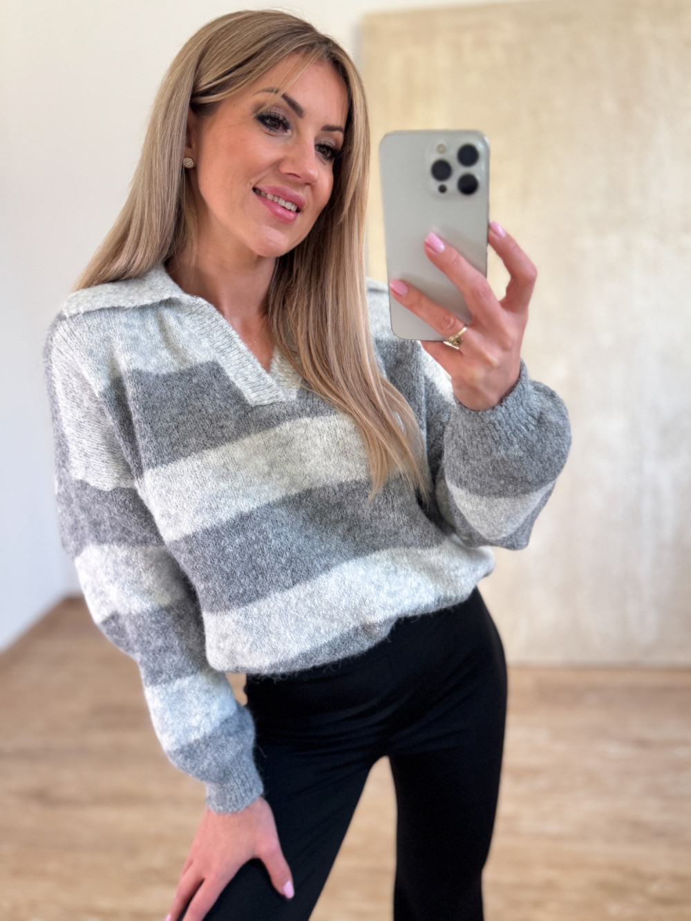 Sweter w Pasy z Kołnierzem - Jasny z Ciemnym Szarym