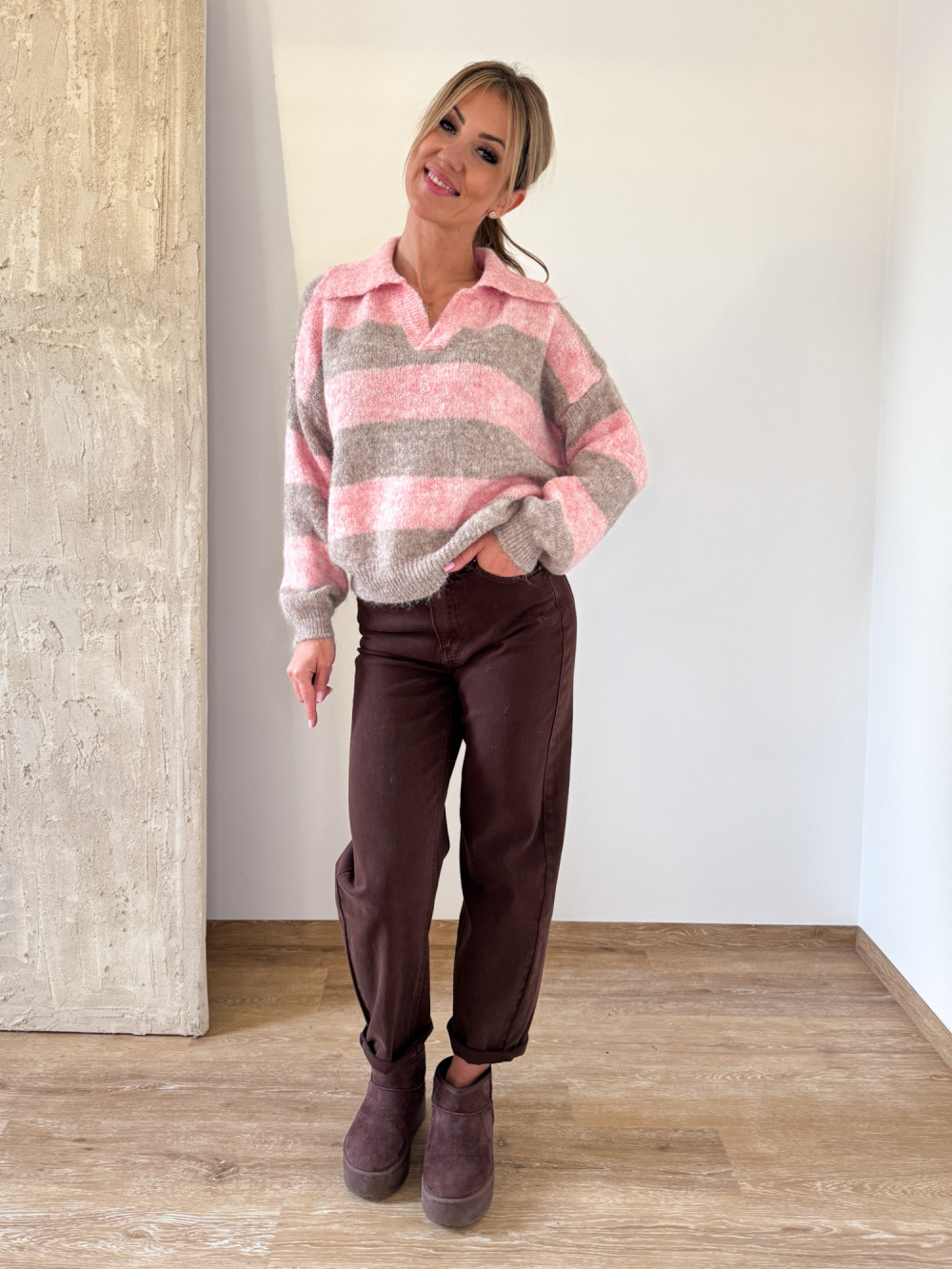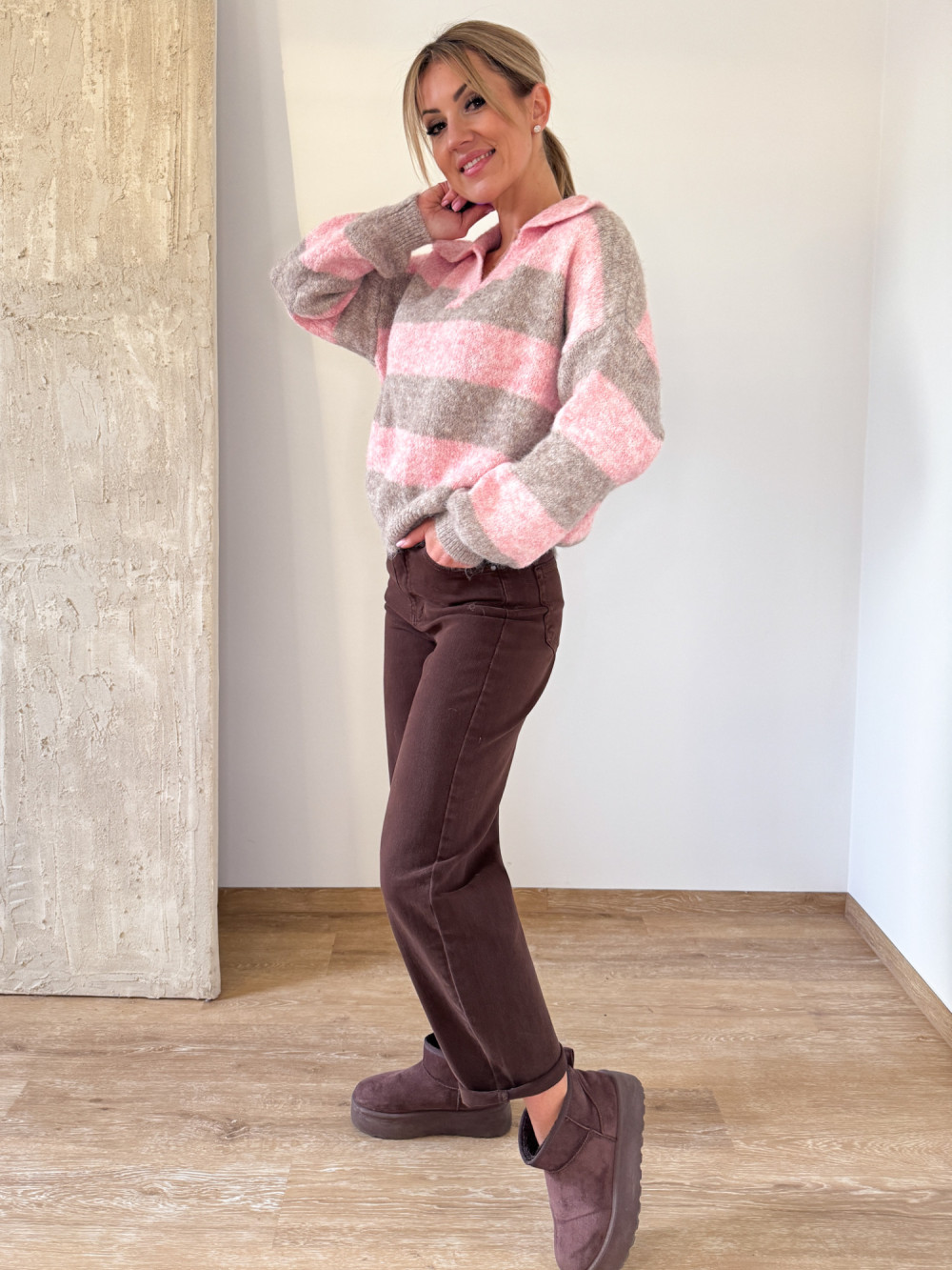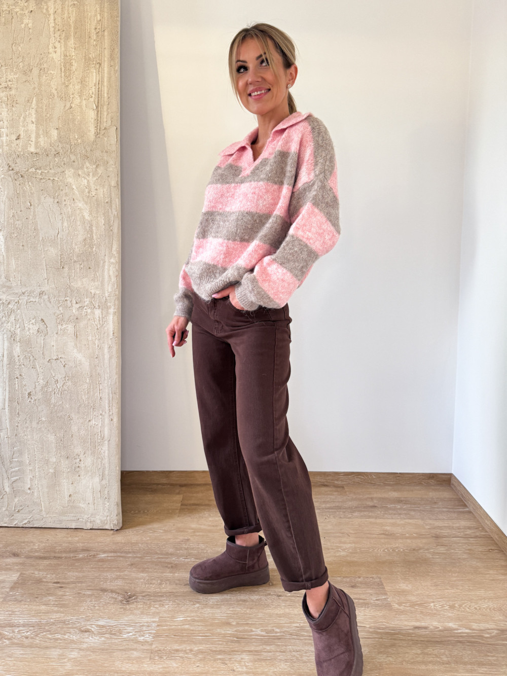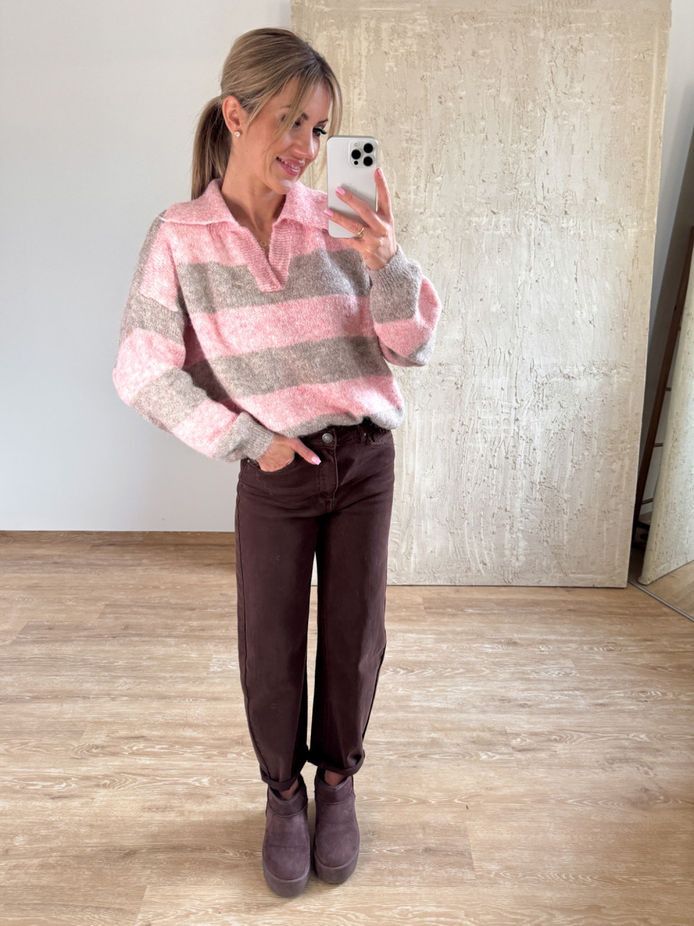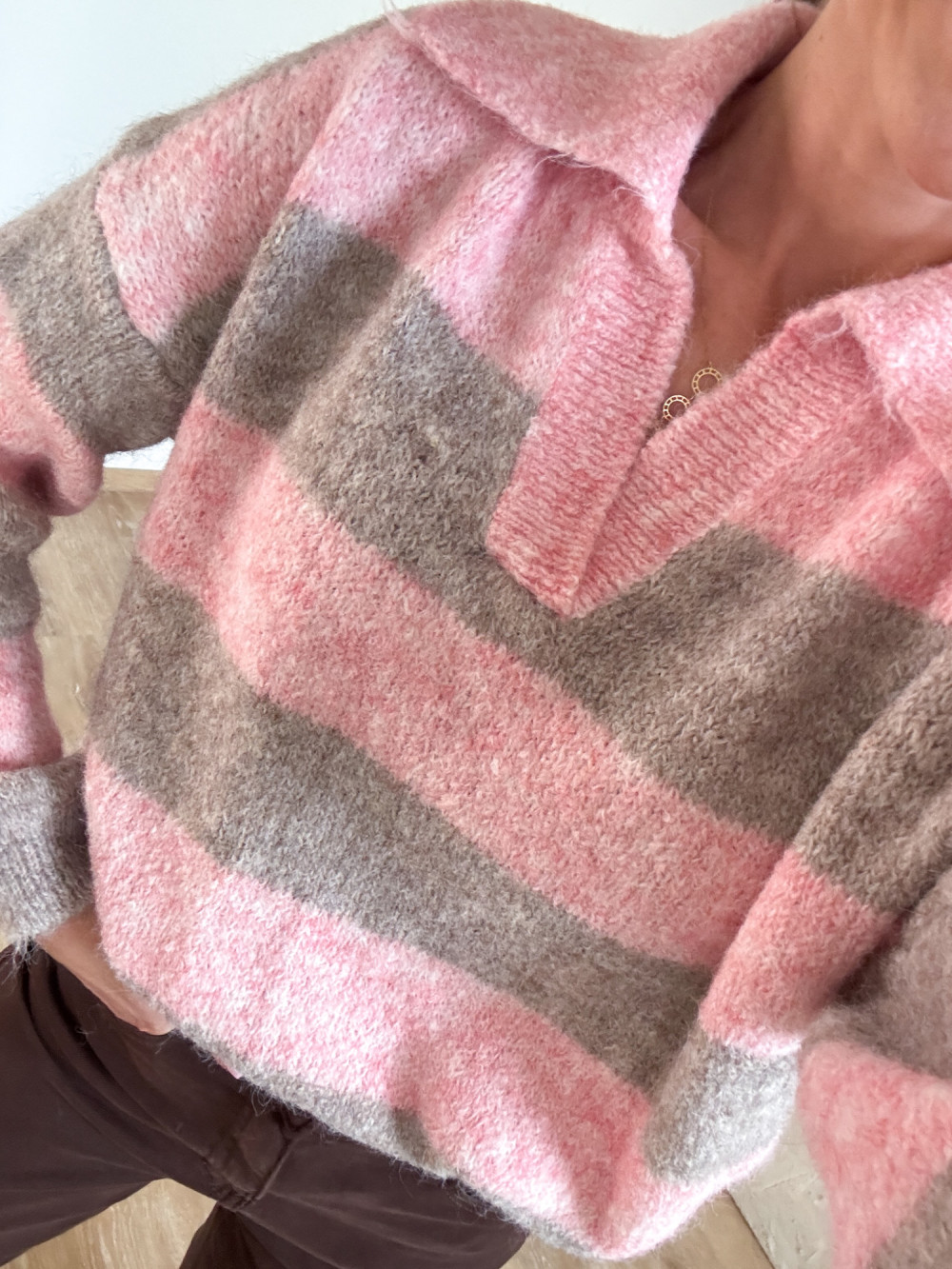 Stylowy sweter w pasy z dekoltem w kształcie litery V oraz kołnierzykiem przypominającym koszulowy krój, który nadaje mu eleganckiego, a zarazem casualowego charakteru.