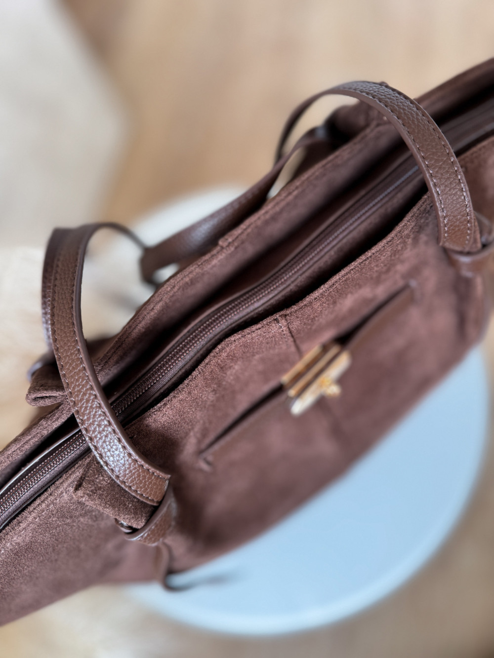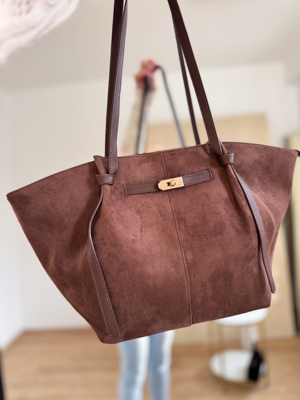 Stylowa i praktyczna torebka wykonana z wysokiej jakości ekologicznej skóry zamszowej. Posiada dwa uchwyty wykonane z eko skóry, idealne zarówno do noszenia w dłoni jak i do przewieszenia na ramieniu. Wewnątrz znajduje się duża komora oraz 3 mniejsze kieszonki z czego jedna zamykana na zamek - idealne do przechowywania drobiazgów i najcenniejszych rzeczy. Całość zamykana na suwak, co gwarantuje bezpieczeństwo i komfort użytkowania. To model, który sprawdzi się zarówno na co dzień, jak i w bardziej eleganckich stylizacjach.
