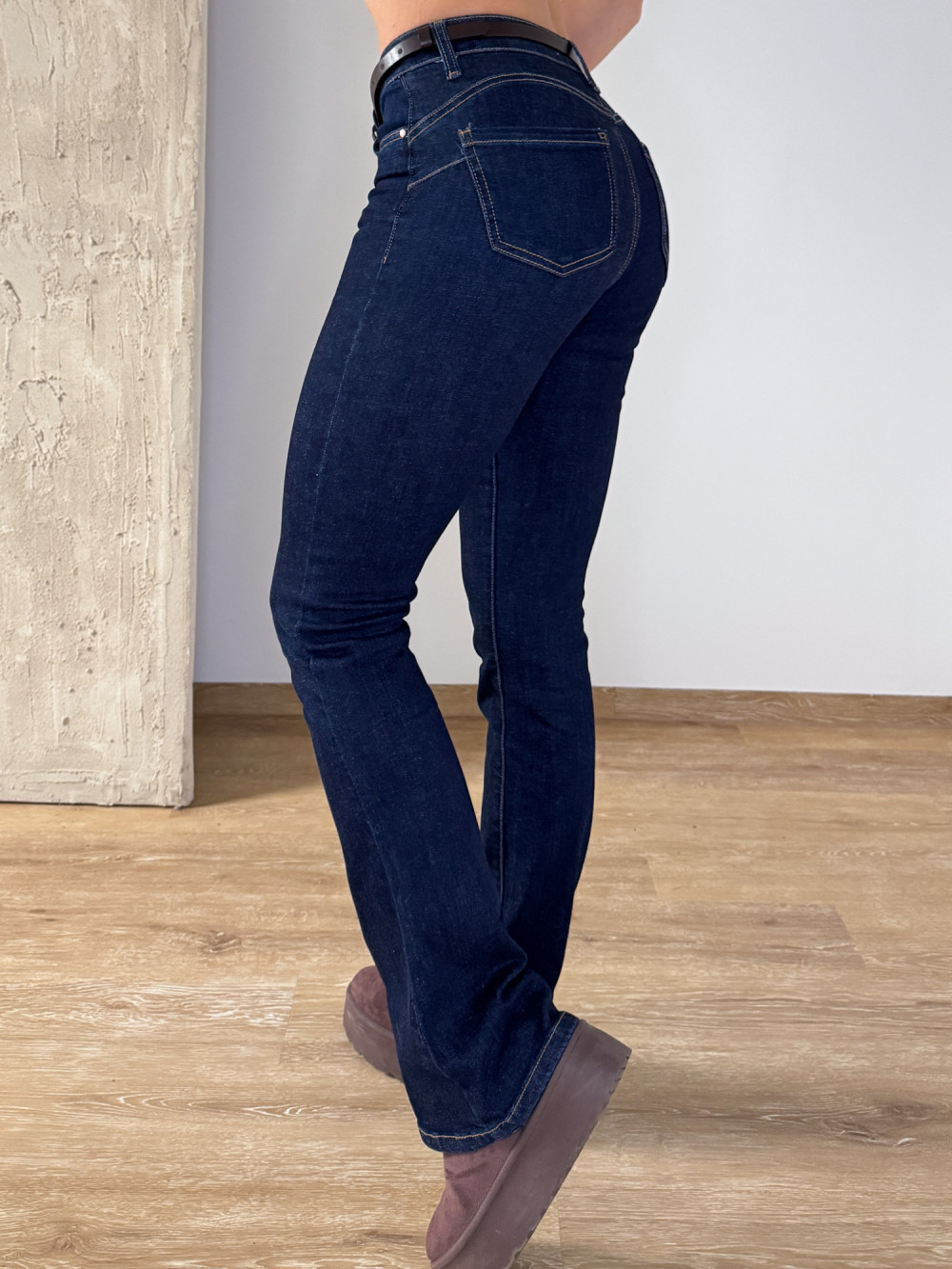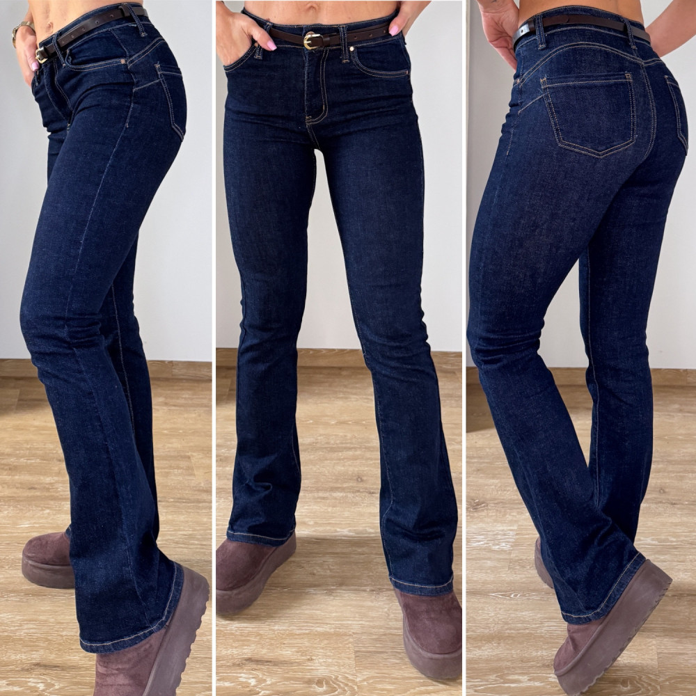 Modne jeansy w przepięknym ciemnym granacie, które łączą wygodę i efekt wysmuklenia sylwetki. Krój fit & flare dopasowuje się w górnej części, podkreślając kształty, a rozszerzana nogawka (lekki tzw. "dzwon") dodaje lekkości i optycznie wydłuża nogi. Dzięki efektowi push-up spodnie pięknie modelują pośladki, gwarantując kobiecy i stylowy look. Idealne zarówno do codziennych stylizacji, jak i w eleganckim wydaniu.