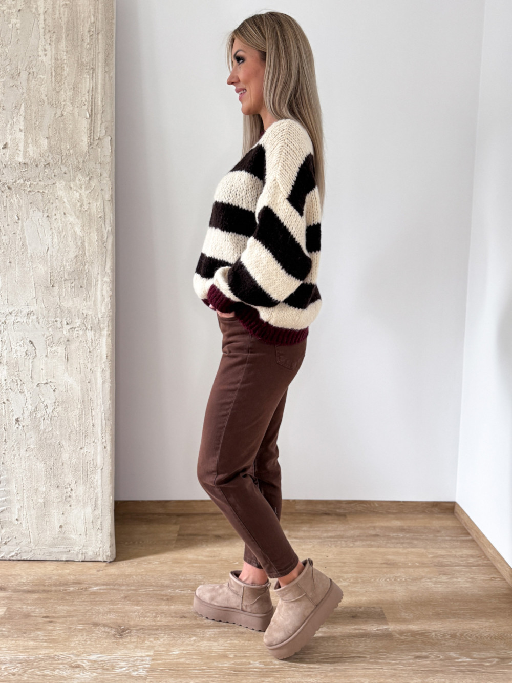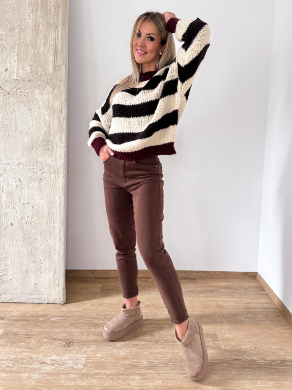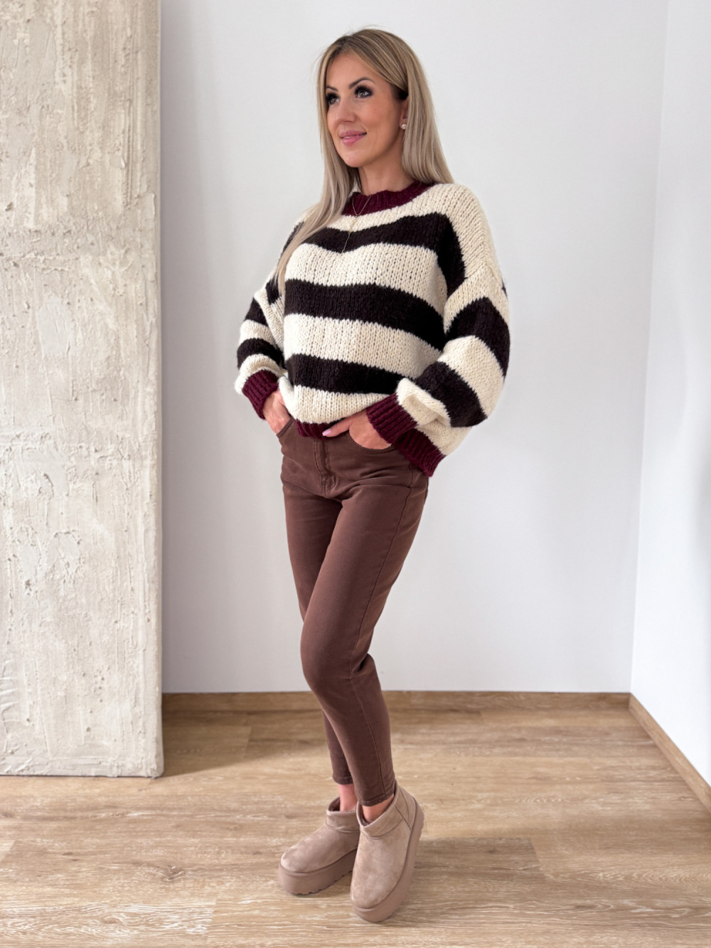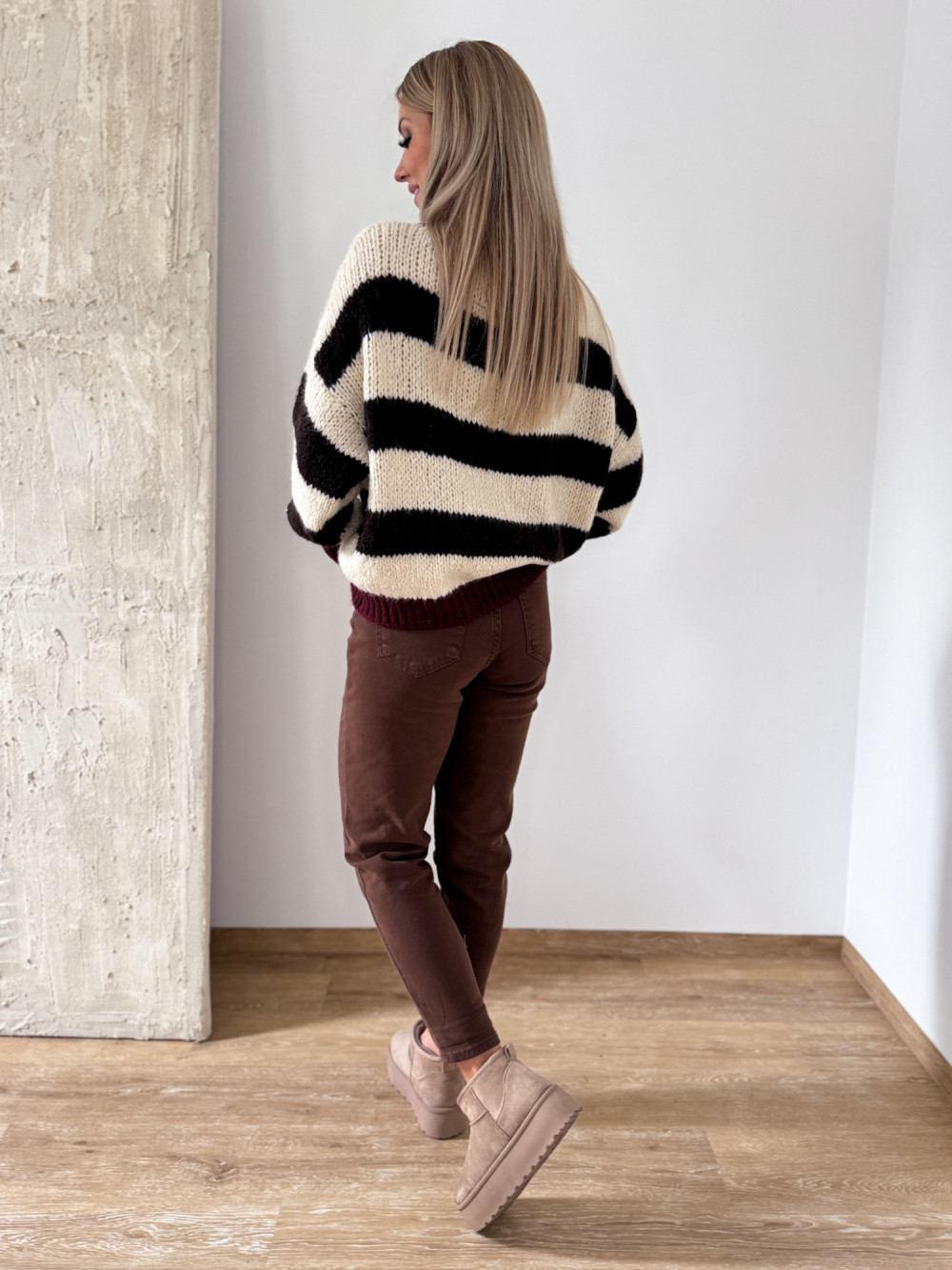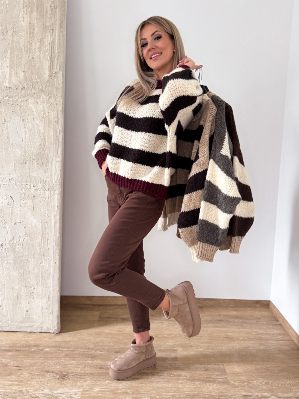 Stylowy sweter w szerokie pasy w odcieniach beżu i czekolady – idealne połączenie na chłodniejsze dni.