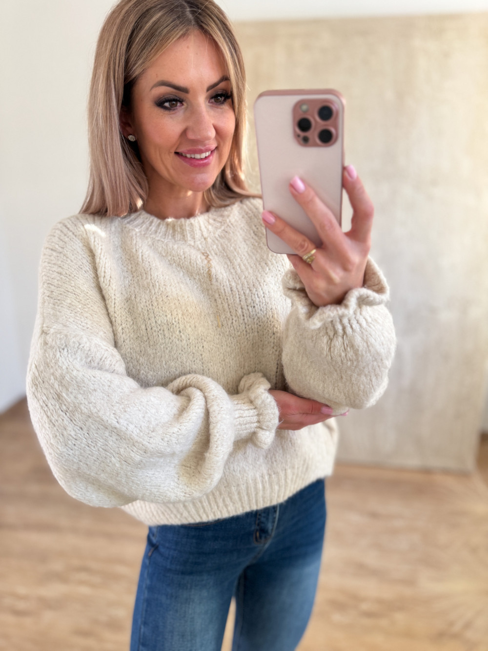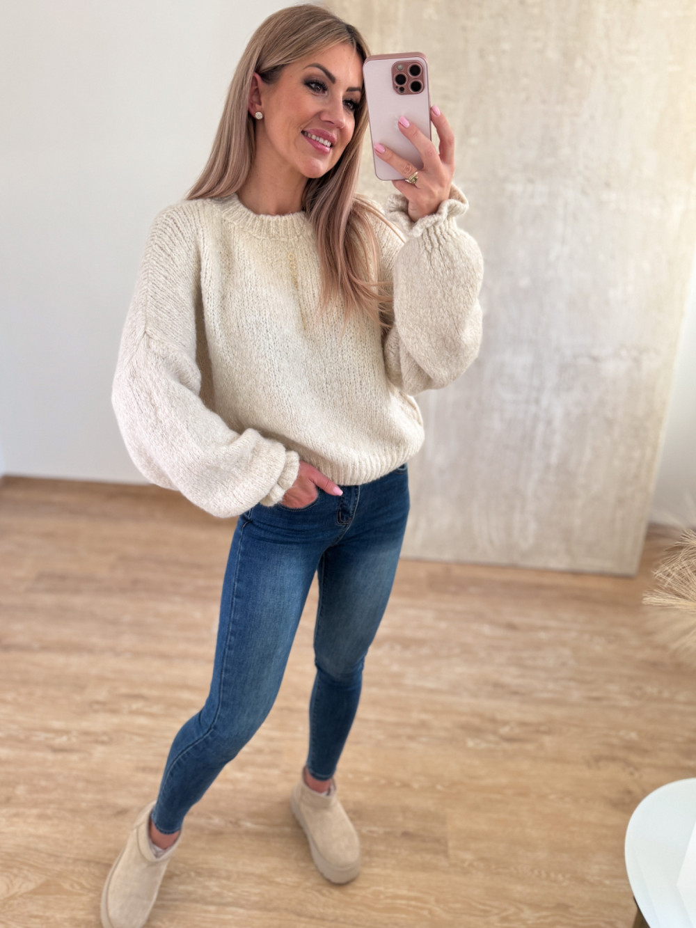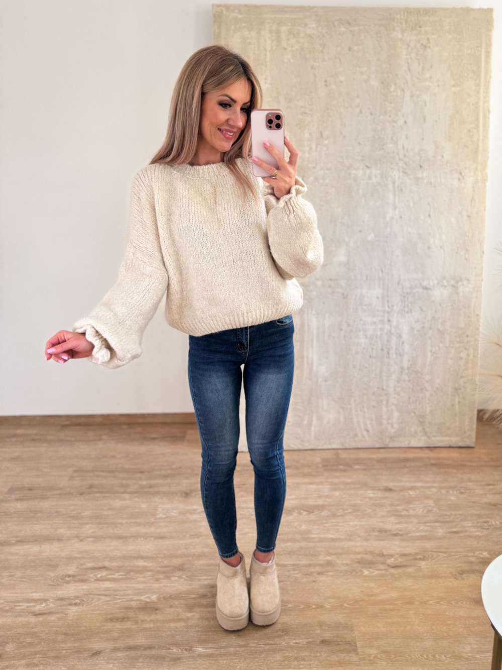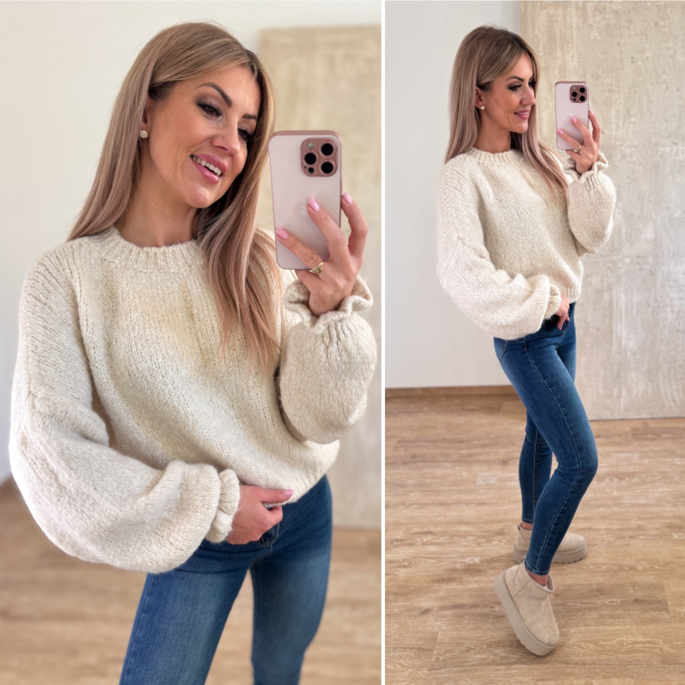 Niezwykle miękki i przyjemny w dotyku sweter, który zachwyca subtelnymi detalami. Dzięki ściągaczowi na rękawie zakończonemu falbanką tworzy się delikatna bufka, dodająca całości kobiecego charakteru.