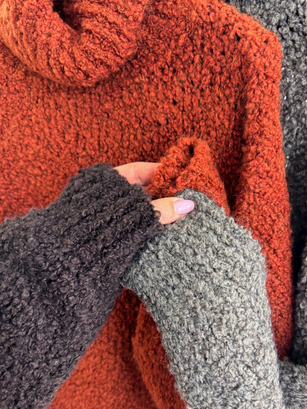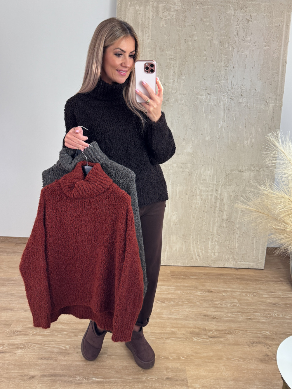 Miękki i przyjemny w dotyku oversizowy sweter z buklii z luźnym golfem, który pięknie układa się przy szyi.