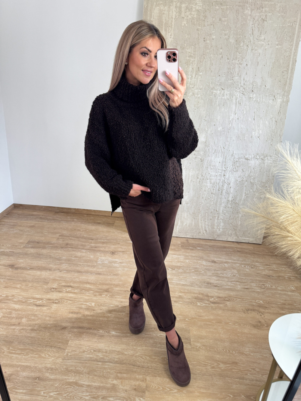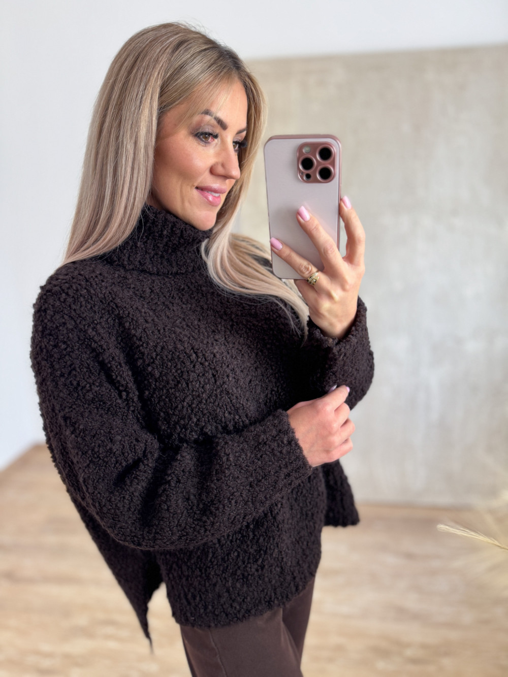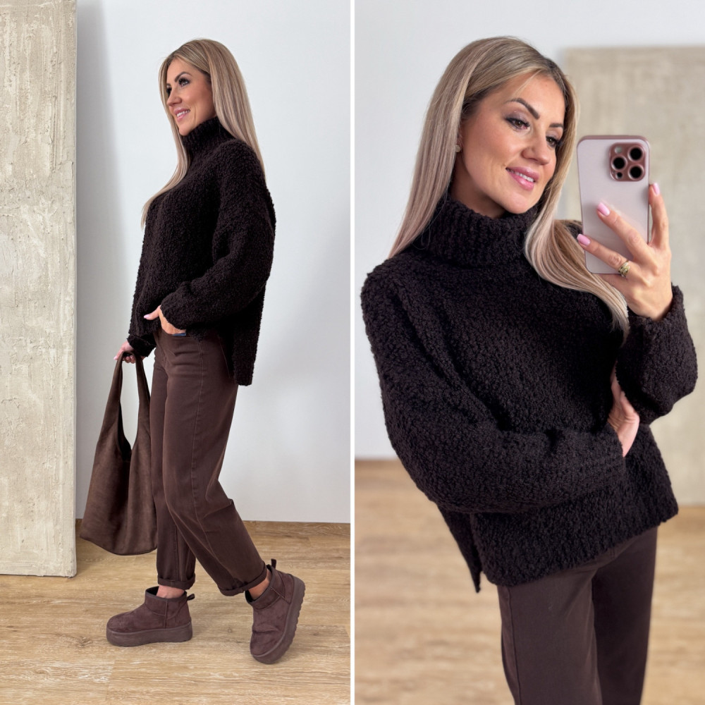 Miękki i przyjemny w dotyku oversizowy sweter z buklii z luźnym golfem, który pięknie układa się przy szyi.