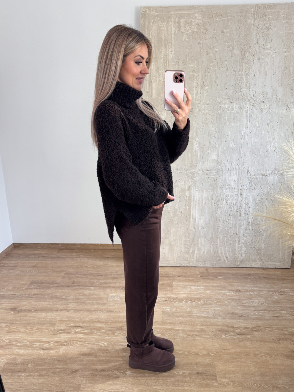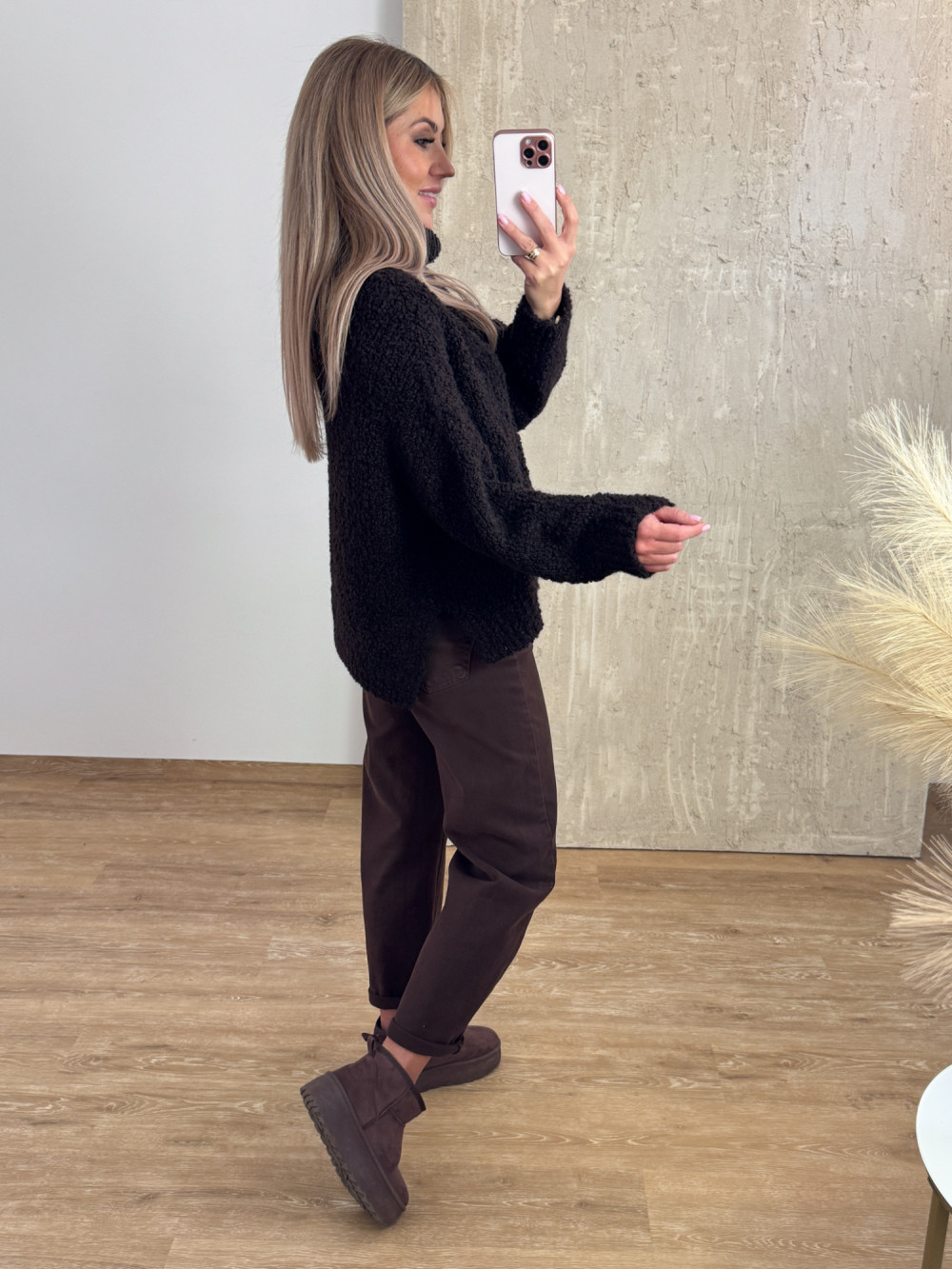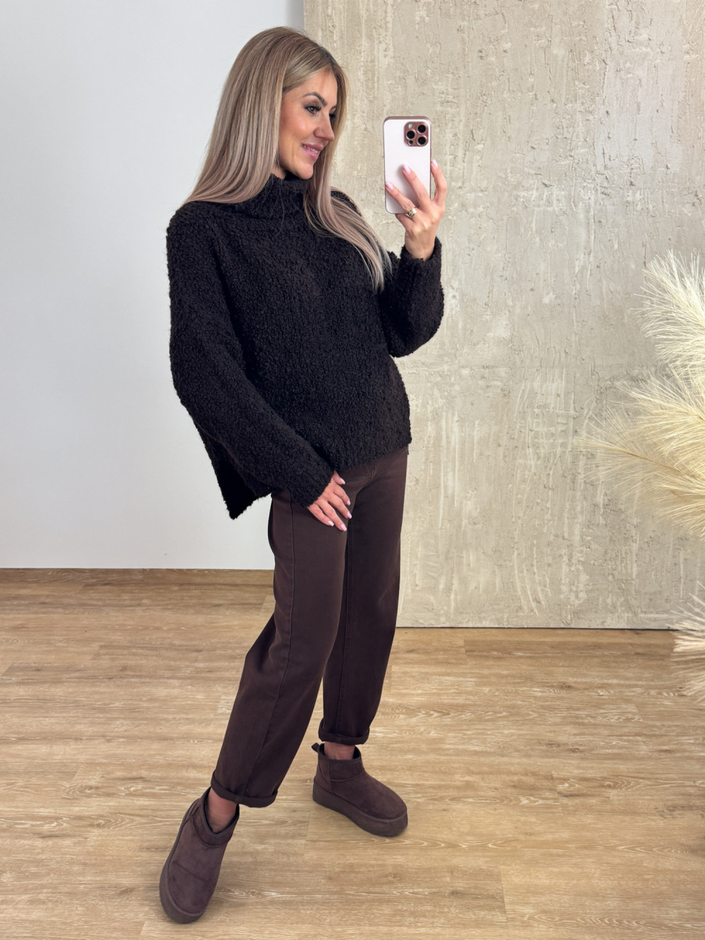 Miękki i przyjemny w dotyku oversizowy sweter z buklii z luźnym golfem, który pięknie układa się przy szyi.