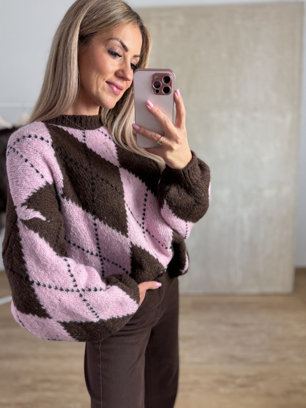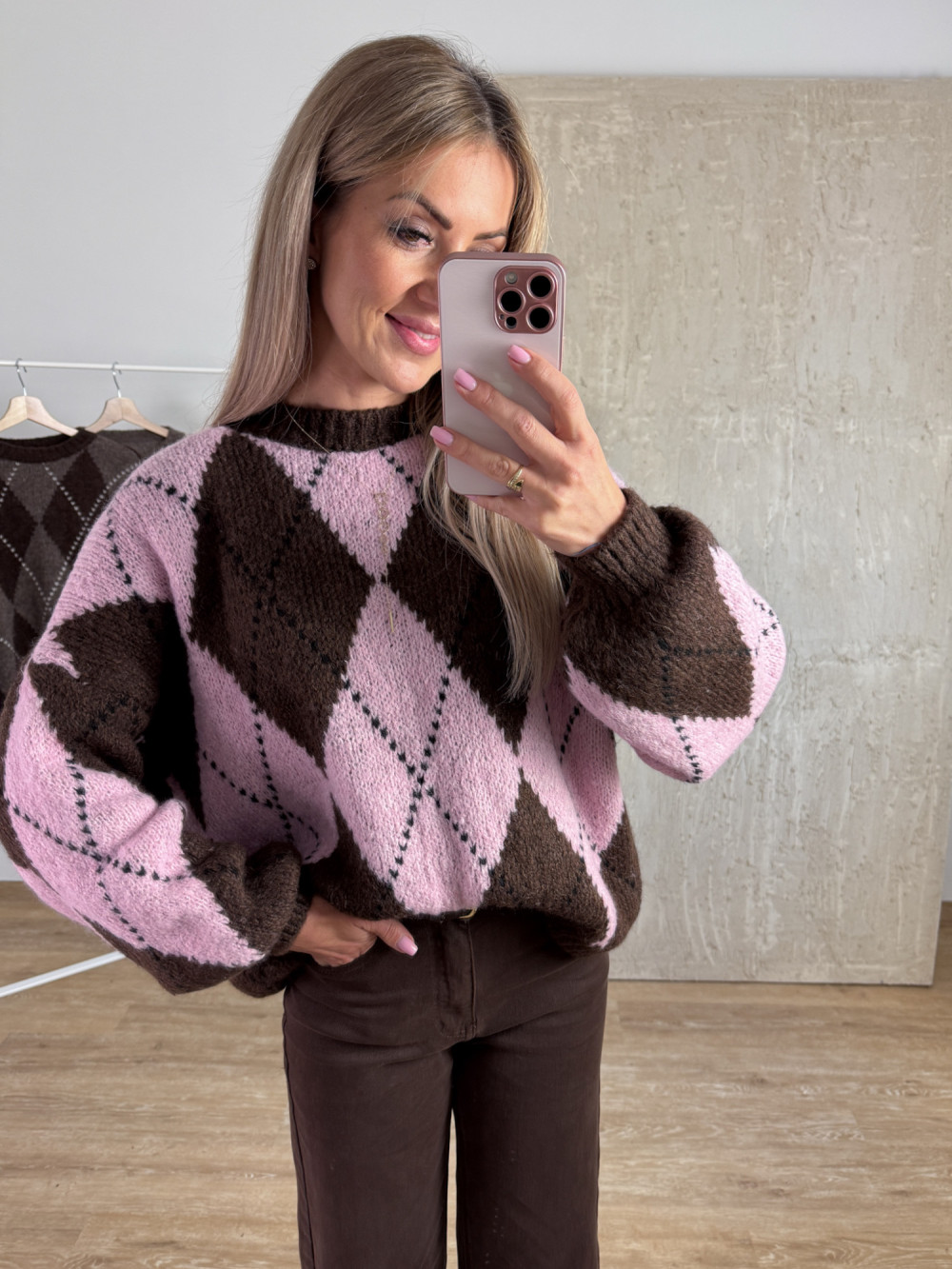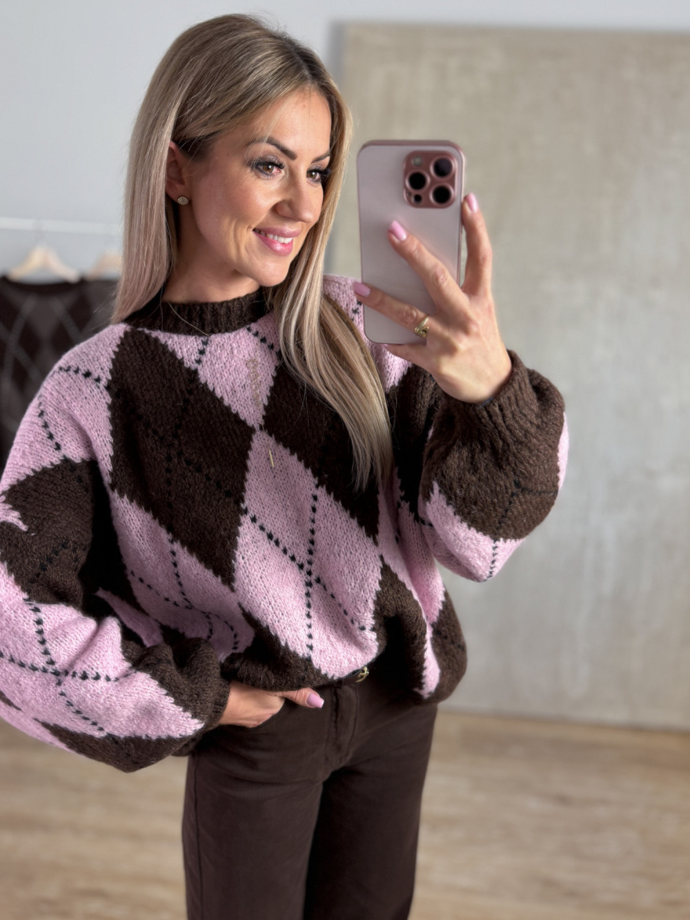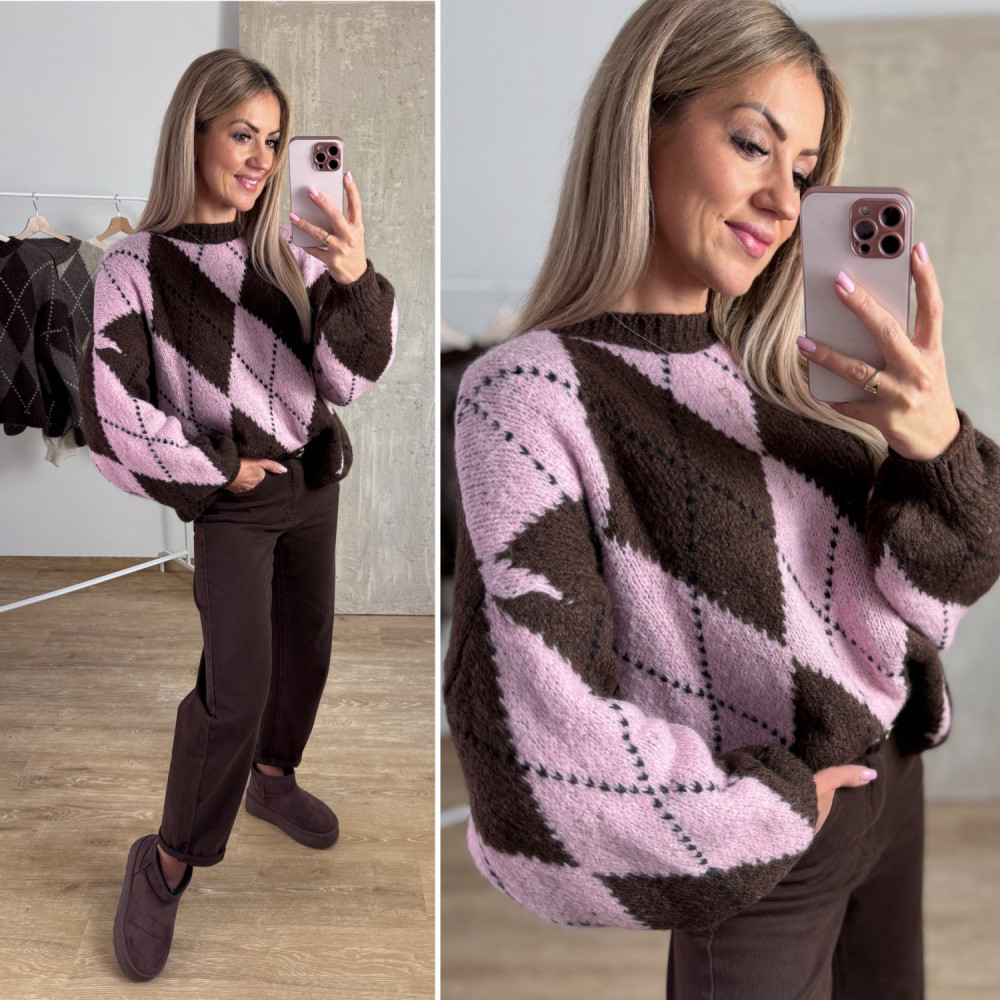 Przepiękny model swetra w romby. Dzięki ściągaczowi na rękawie tworzy się delikatna bufka, dodająca całości kobiecego charakteru. Na dole wykończony delikatną gumką, która sprawia, że sweter pięknie się układa i podkreśla sylwetkę. Klasyczny okrągły dekolt przy szyi czyni go uniwersalnym modelem, idealnym na co dzień i do pracy.