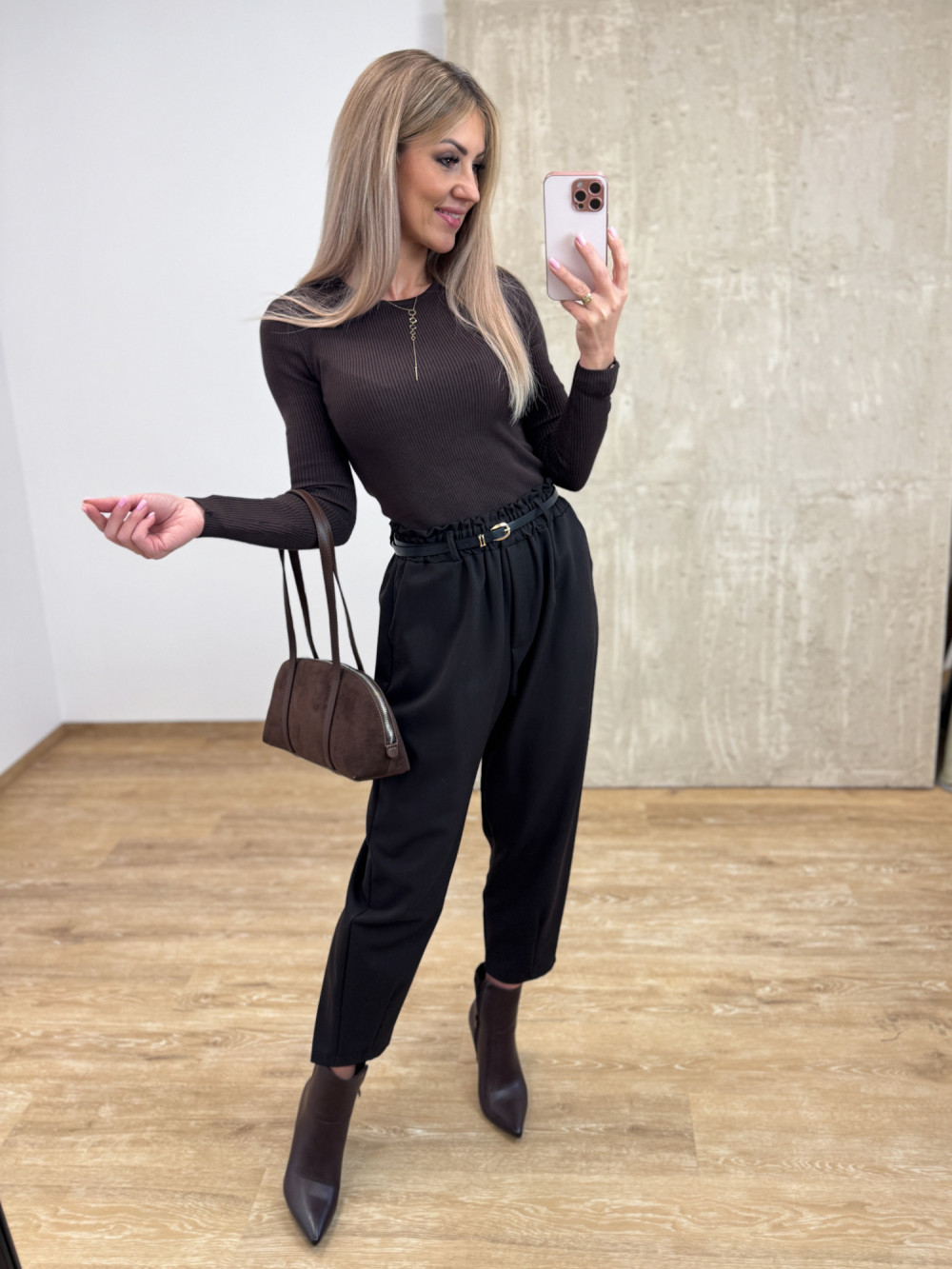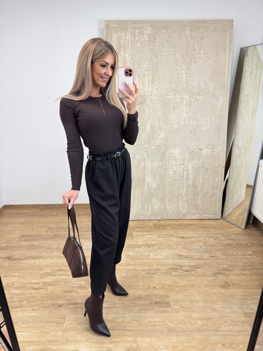 Spodnie Materiałowe w kroju Balloon z Paskiem - Ciemna Czekolada