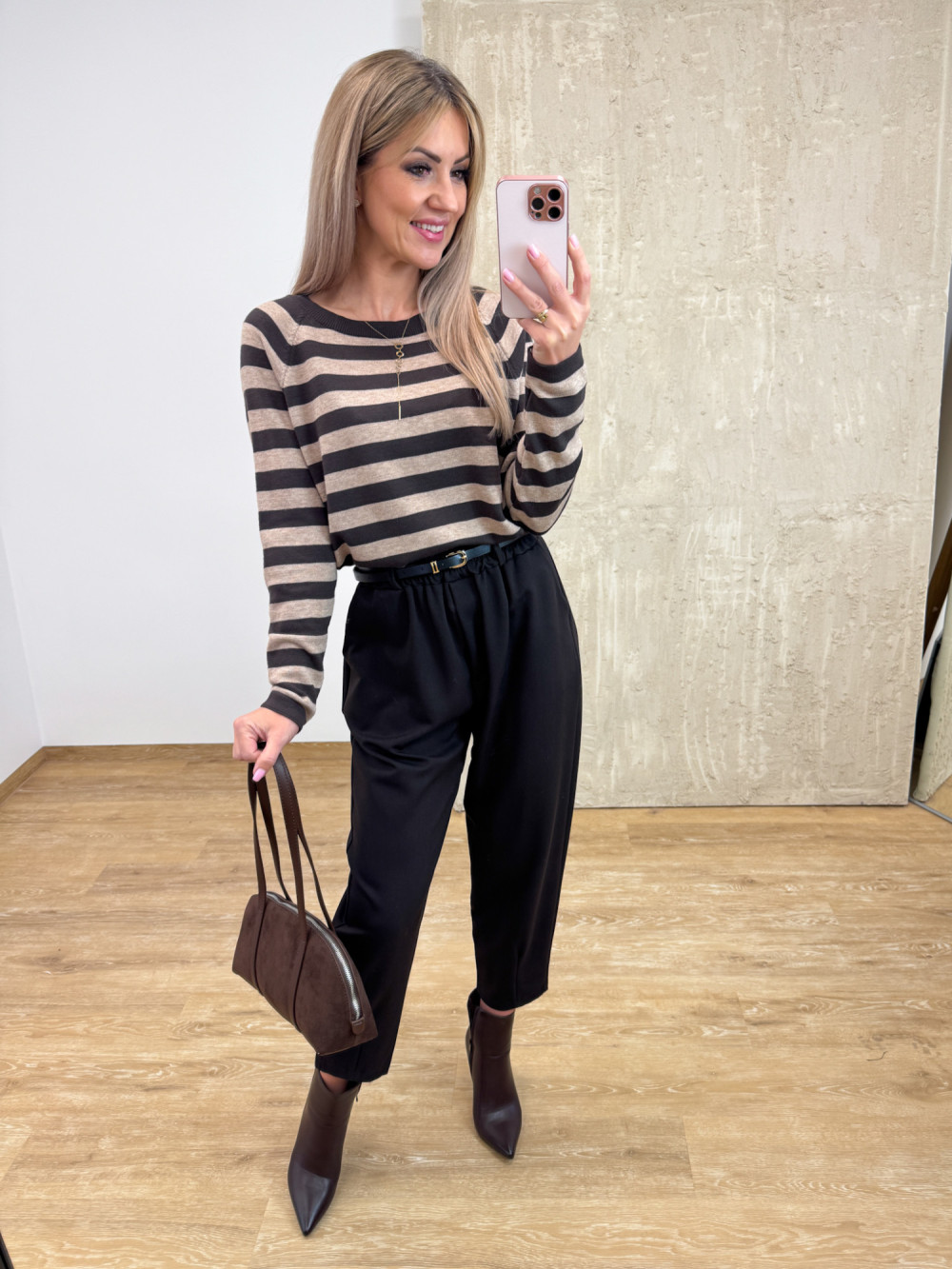 Stylowe spodnie o kroju balloon, które łączą elegancję z nowoczesnym fasonem. Gumka w pasie z lekko marszczoną tkaniną pięknie układają materiał, a kryte kieszenie dodają całości klasy.